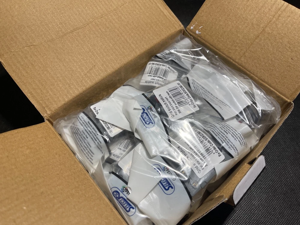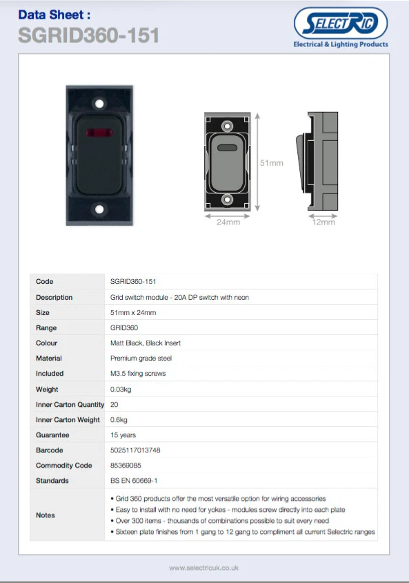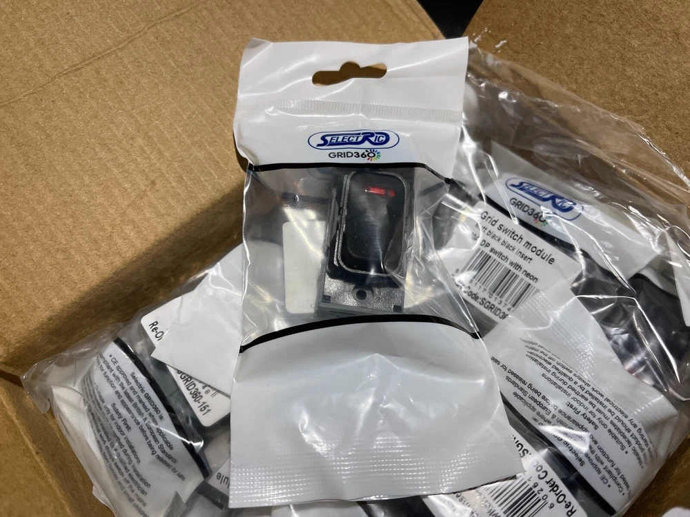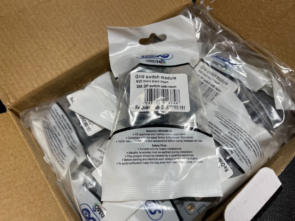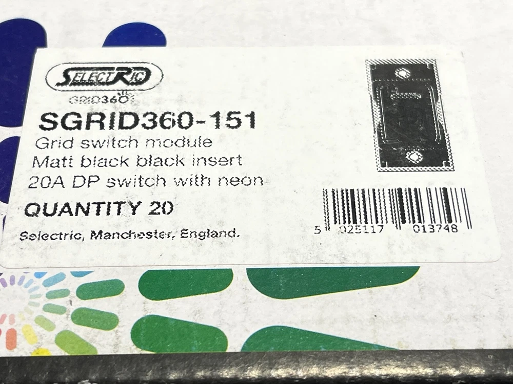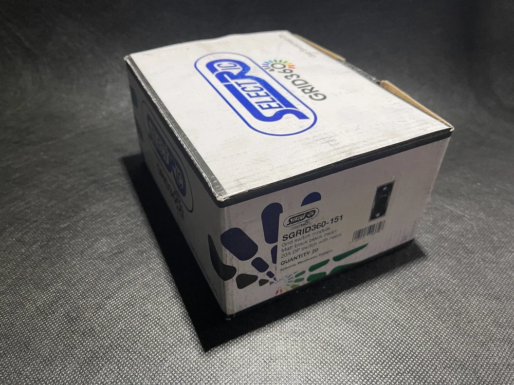 SELECTRIC SGRID360-151 Switch Module Black 20A DP with Neon 20/Box JOBLOT This product data sheet is originally written in English. Item is new and unused from ex-industrial stock. (see image for external packaging condition) You are bidding for ONE box of 20 Switches SELECTRIC GRID360 Switch Module Matt Black 20A DP with Neon - 20/Box (UK) SGRID360-151 Ideal for reseller or contractor. These high-end, high quality modular switches are used in exclusive homes, hotels, apartments, shops, and offices . The GRID360 range has over 300 items and thousands of possible combinations to suit every need (full product line available from manufacturer website (SELECTRIC) or electrical wholesalers. Easy to install with no need for yokes as switch modules screw directly into the plate. The GRID360 range has 16 plate finishes with apertures from 1 to 12 and compliments all current Selectric ranges. ****** PLEASE NOTE ******* We also have the following items for sale in our eBay store AVAILABLE FACE PLATES - (LUXURY MATT BLACK COLOUR-WAY) 1 Aperture Modular Plate - SGRID360-244 - Box of 10 face plates 2 Aperture Modular Plate - SGRID360-245 - Box of 10 face plates 3 Aperture Modular Plate - SGRID360-246 - Box of 10 face plates 4 Aperture Modular Plate - SGRID360-247 - Box of 10 face plates 6 Aperture Modular Plate - SGRID360-248 - Box of 5 face plates 8 Aperture Modular Plate - SGRID360-249 - Box of 5 face plates 12 Aperture Modular Plate - SGRID360-250 - Box of 5 face plates AVAILABLE SWITCH MODULES - (LUXURY MATT BLACK COLOUR-WAY) 13 Amp Fused Connection Unit - SGRID360-156 - Box of 20 switches Blanking Module - SGRID360-157 - Box of 20 blanking modules 10 Amp 1 Way Switch - SGRID360-145 - Box of 20 switches 10 Amp 2 Way Switch - SGRID360-146 - Box of 20 switches 10 Amp Intermediate Switch - SGRID360-147 - Box of 20 switches 10 Amp DP (Double Pole) Key Switch - SGRID360-148 - Box of 20 switches 10 Amp Retractive (Dimmer) Switch - SGRID360-149 - Box of 20 switches 10 Amp 2 Way Toggle Switch - SGRID360-158 - Box of 20 switches 10 Amp Intermediate Toggle Switch - SGRID360-319 - Box of 20 switches 20 Amp DP (Double Pole) Switch - SGRID360-150 - Box of 20 switches 20 Amp DP (Double Pole) Switch with Neon - SGRID360-151 - Box of 20 switches 20 Amp SP (Single Pole) 1 Way Switch§ - SGRID360-152 - Box of 20 switches 20 Amp SP (Single Pole) 2 Way Switch - SGRID360-153 - Box of 20 switches 20 Amp Intermediate Switch - SGRID360-154 - Box of 20 switches 20 Amp DP (Double Pole) 1 Way Key Switch - SGRID360-155 - Box of 20 switches Seller Policy UK NEXT DAY DELIVERY: Special Delivery next day by 1pm (fully tracked and insured) available for all UK addresses. Please ask for quotation before checkout. Your order and payment must be completed by 8am for next day delivery. INTERNATIONAL STANDARD DELIVERY: We post worldwide. Our standard delivery service is fully tracked and insured. INTERNATIONAL ECONOMY OR EXPEDITED DELIVERY: Please request a customised delivery quotation before checkout if you require economy or expedited delivery. PACKAGING: We sell many items which are not a full box or pack. These items are dispatched in none original sealed packaging with copies of manufacturers documentation where applicable. We are an environmentally responsible vendor and recycle waste packaging sourced from local businesses. If you prefer your item shipped in new packaging, please advise this requirement at checkout. RETURNS: We offer a global 30 day no questions asked returns policy. Item must be returned undamaged in original sealed packaging. Buyer pays return postage. The GRID360 range has over 300 items and thousands of possible combinations to suit every need (full product line available from manufacturer website (SELECTRIC) or electrical wholesalers. Easy to install with no need for yokes as switch modules screw directly into the plate. The GRID360 range has 16 plate finishes with apertures from 1 to 12 and compliments all current Selectric ranges. UK NEXT DAY DELIVERY: Special Delivery next day by 1pm (fully tracked and insured) available for all UK addresses. Please ask for quotation before checkout. Your order and payment must be completed by 8am for next day delivery. PACKAGING: We sell many items which are not a full box or pack. These items are dispatched in none original sealed packaging with copies of manufacturers documentation where applica Brand SELECTRIC MPN SGRID360-151 Country/Region of Manufacture United Kingdom