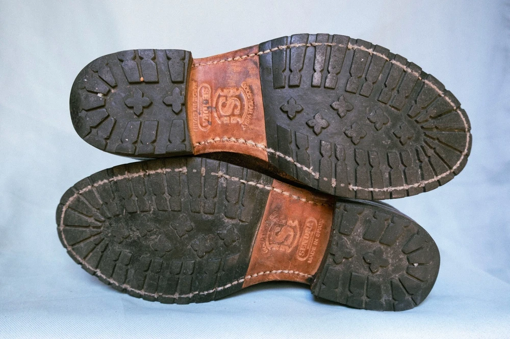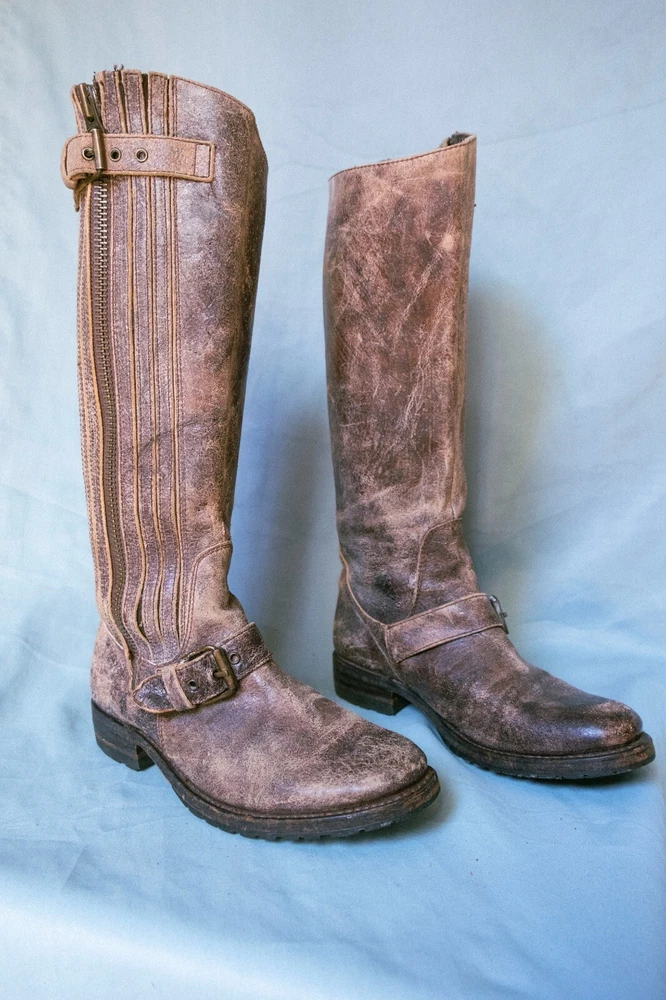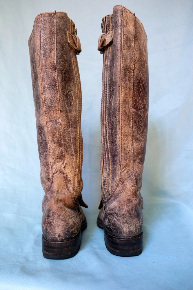 This is a pair of Sendra women's riding boots in size 6.5 with a tall knee-high shaft made of distressed crackle finish tan leather. The boots feature a round toe shape, zip closure, low block heel, and are designed with a hipster, bohemian, cowboy, southwestern, and cowgirl theme in mind. They also include arch support, a buckle detail, and breathable lining, making them suitable for travel, parties, or casual wear. The boots are hand made in Spain with a rubber outsole for added durability.