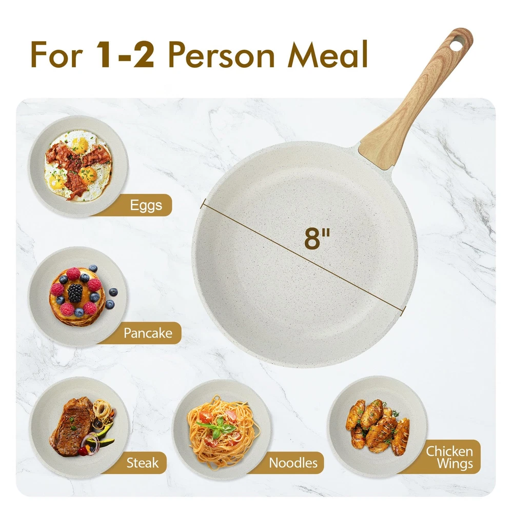 What makes CERAMIC NONSTICK special? Safe & Health - Free of PFAS, PFOA, lead and cadmium, makes your meal healthier. No harmful fume even overheating. Good Corrosion Resistance - Harder surface and improved adhesion, providing a tougher barrier to better protect the saucepan. High Heat Resistance - Good performance in thermal shock testing. No toxic fumes even overheated. Long-lasting - Anti-scratch, wear-resistant, keeps good non-stick performance even after years of use. Easy Cleaning - Rinse with water and wipe with soft cloth. HEALTHY CERAMIC SKILLET - Made of natural ceramic, free of PFOA, PTFE, PFAS, lead, and cadmium, ensuring safety and health. This skillet does not produce toxic fumes even when overheated, and no coating will come off into your food. SUPER NONSTICK - The surface is smooth and super nonstick, eggs can just slide right off the pan without effort, which makes cooking easier and the food much more flavorable with less oil! INDUCTION COMPATIBLE - The nonstick frying pan is constructed from cast aluminum with induction base to prevent from warping, wobbling, or degrading over time, heats fast and evenly. Suitable for all stovetops, including Induction cooktop. HEAT RESISTANT HANDLE - The bakelite handle features woodgrain design, it is comfortable to grip and stays cool while cooking. The omelete pan is oven safe to 550°F (please remove the handle). EASE OF CLEANING - No one loves to do extra dishes. Its slippery, nonstick surface and no rivets design make the egg pan easy to clean in seconds with a towel, soap and warm water. Recommend Hand Washing to extend the life of pans. All skillets are made from recycled aluminum with healthy ceramic nonstick material to reduce carbon dioxideemissions by 80%.