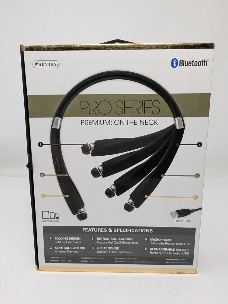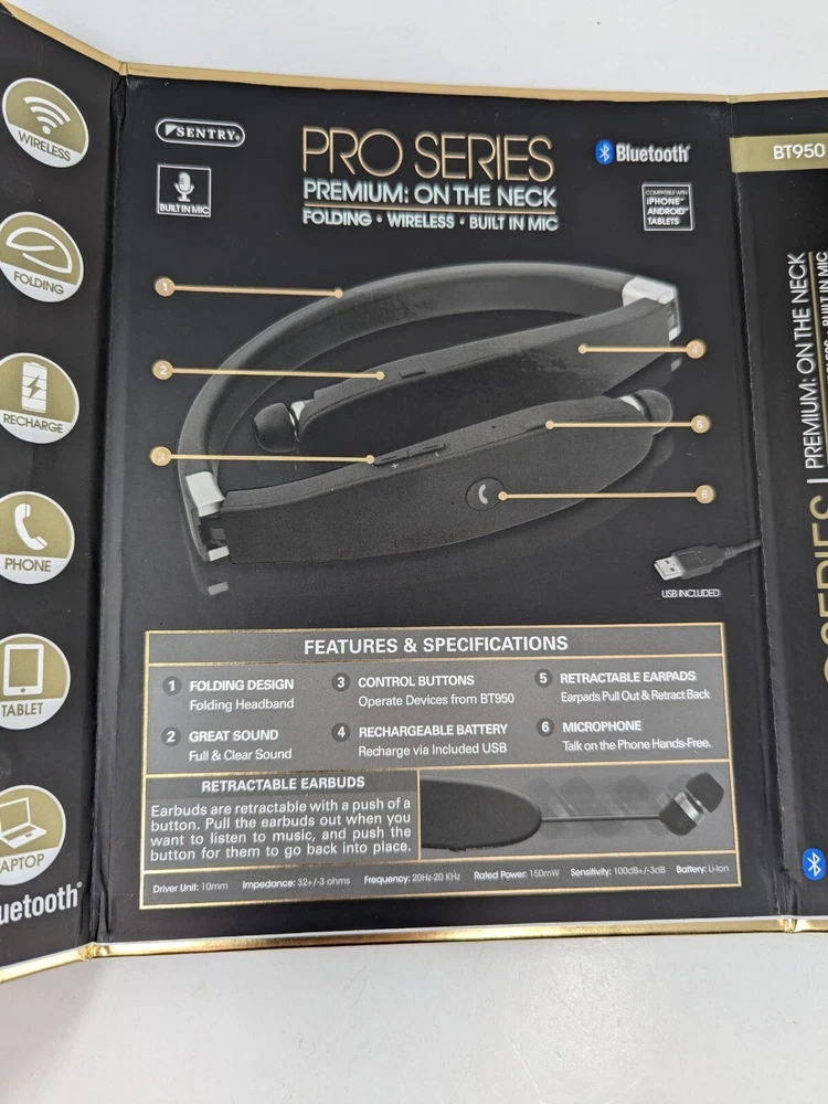 Year Manufactured:2010sUPC:080068549505Number of Earpieces:DoubleFeatures:Built-in Microphone, Foldable, WirelessType:Earbud (In Ear)MPN:BT950Brand:SentryForm Factor:NeckbandModel:BT950Wireless Technology:BluetoothSuitable For:ListeningConnectivity:BluetoothCountry/Region of Manufacture:Chinagtin13:080068549505Color:BlackMicrophone Type:Built-In
