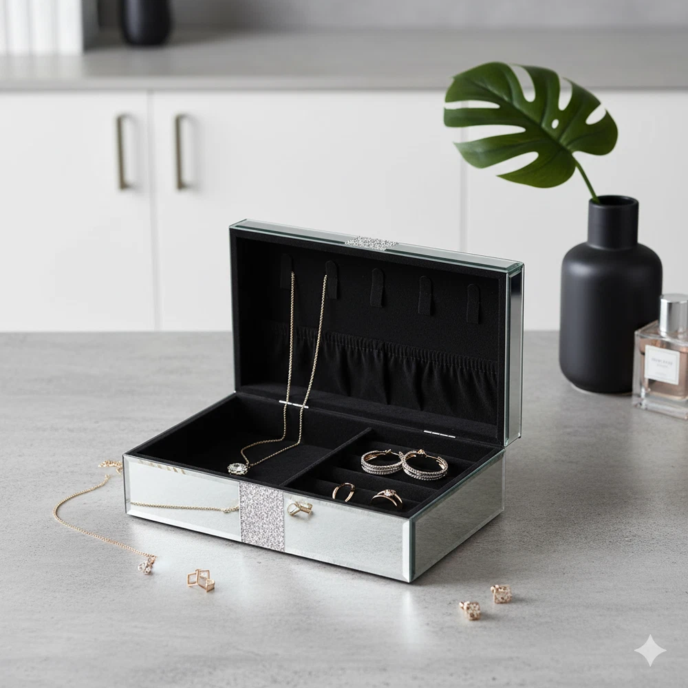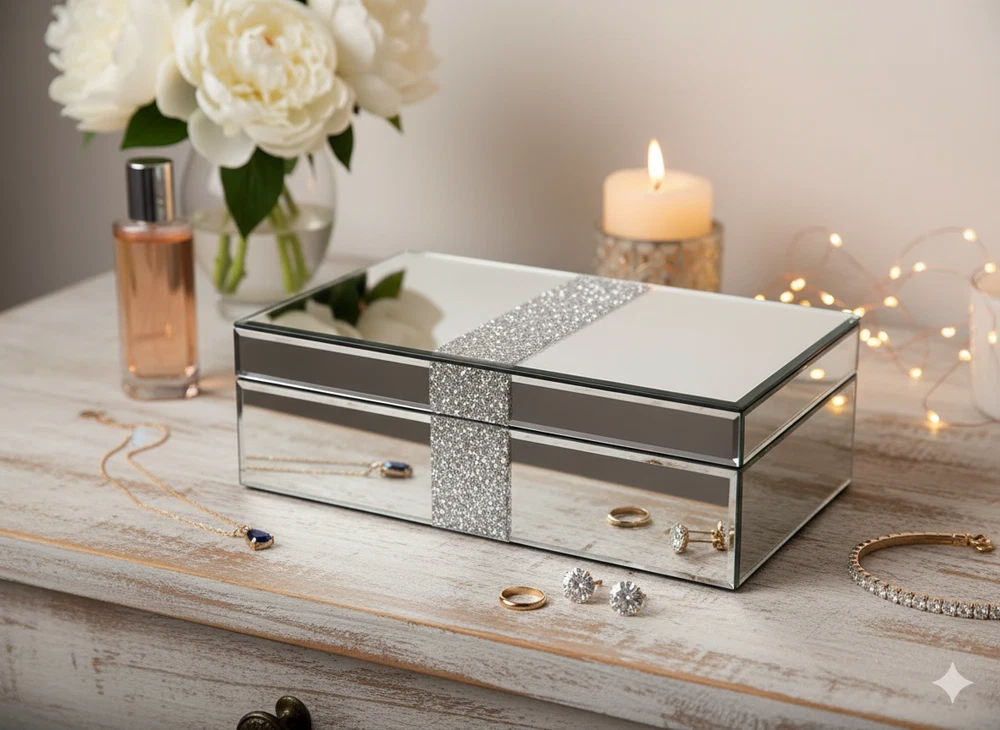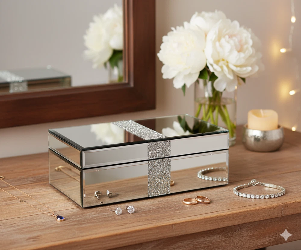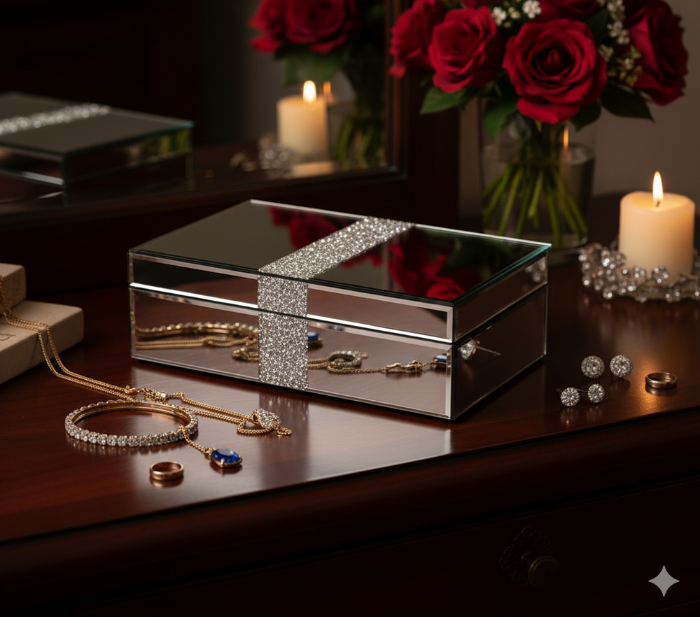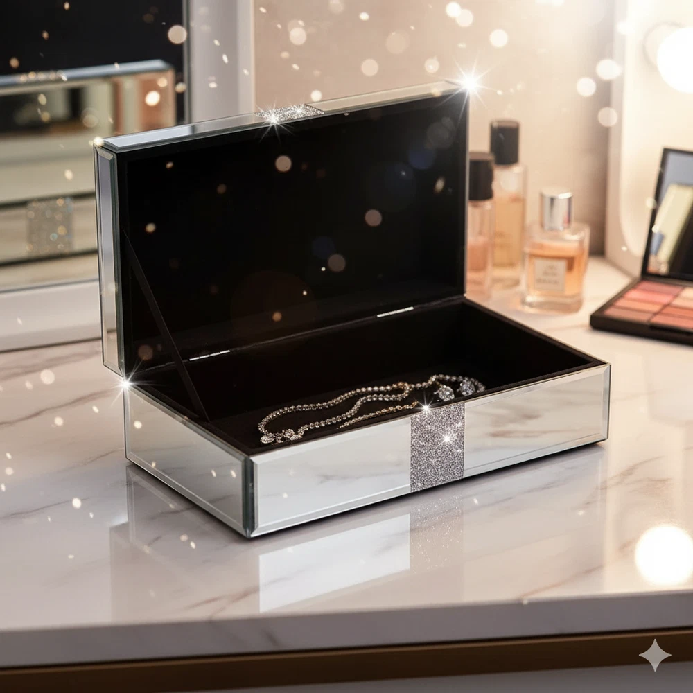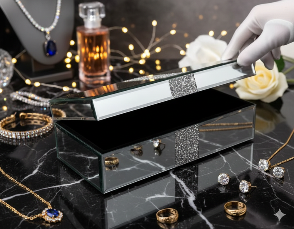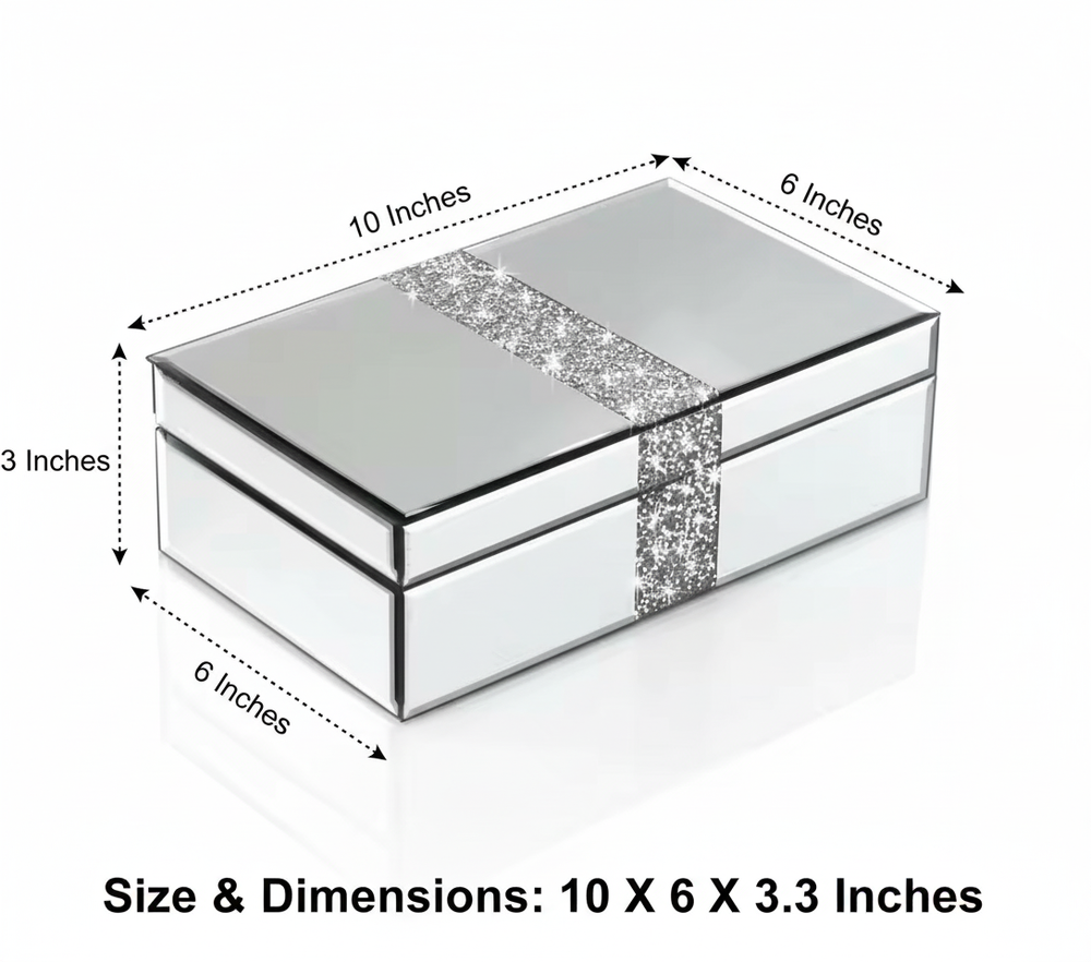 The SERENA'S Silver Crushed Diamond Luxury Design Glass Mirrored Jewellery Box is a stylish and elegant storage solution for your precious jewellery pieces. Made with high-quality glass and lined with velvet, this rectangular box is perfect for storing necklaces, bracelets, anklets, rings, cufflinks, earrings, and body jewellery. The silver colour and mirrored feature add a touch of luxury, making it a perfect gift for unisex adults who appreciate fine craftsmanship and attention to detail. Handmade in China, this jewellery box is a beautiful and practical addition to any vanity or dressing table. Product description Elegant Glass Jewelry Box with Glitter Accent This luxurious mirrored glass jewelry box is perfect for storing your precious keepsakes in style. Its sleek, reflective design is complemented by a shimmering silver glitter stripe that adds a touch of glamour. Ideal for organizing jewelry, trinkets, or small treasures, this box combines sophistication with functionality. A beautiful addition to your vanity, dresser, or as a thoughtful gift for someone special. About this item Sophisticated Design: Mirrored glass exterior with a sleek and modern look. Glitter Accent: Eye-catching silver glitter stripe adds a glamorous and luxurious touch. Premium Mirrored Glass: Reflective glass surface enhances the elegance and sophistication of the design. Material: Acrylic Crushed Diamond on Middle Top and Front, MDF Construction, Mirror and Crush Diamond outside on Surface. Inside Is Black Lint Velvet. Outside Fantastic Looking, inside Big Space Useful Soft Touch. Glamorous Accent: Features a sparkling silver glitter stripe for added elegance. Reliable material makes the product scratch-resistant and easy to clean to keep its metallic luster. Multi-Purpose Storage: Ideal for jewelry, trinkets, keepsakes, or small treasures. Keepsake Holder: Ideal for storing small mementos or sentimental items. Decorative Accent: Functions as a stylish décor piece to elevate the look of any space. Durable Construction: Sturdy materials ensure long-lasting use. Compact Size: Designed to fit easily on vanities, dressers, or shelves without taking up too much space. Perfect Gift Idea: A thoughtful and stylish present for any occasion. I deal gift to your wife/ beloved/ families/ friends also for occasions like wedding, birthdays, anniversaries, Valentine’s Day, Thanksgiving Day, Christmas. Versatile Décor: Enhances the look of your vanity, dresser, or bedside table. Modern Aesthetic: Minimalist yet chic, it blends seamlessly with various home décor styles. Size & Dimensions: 10 X 6 X 3.3 Inches ( 25.4X15.24X8.38 CMS). WEIGGHT: 1200 GMS: