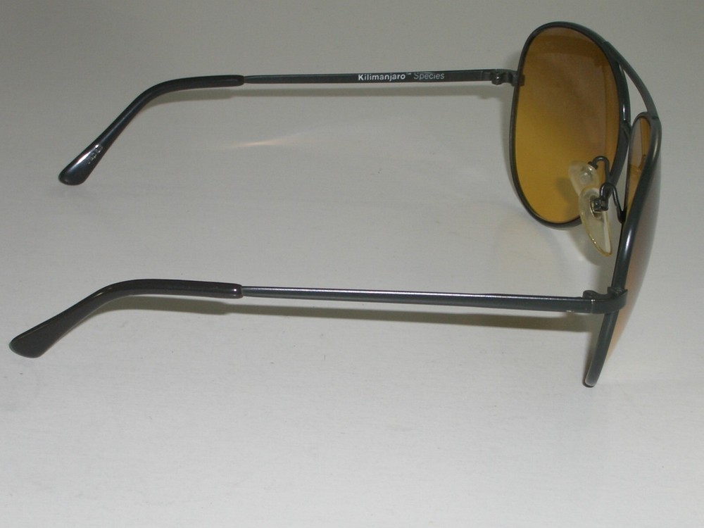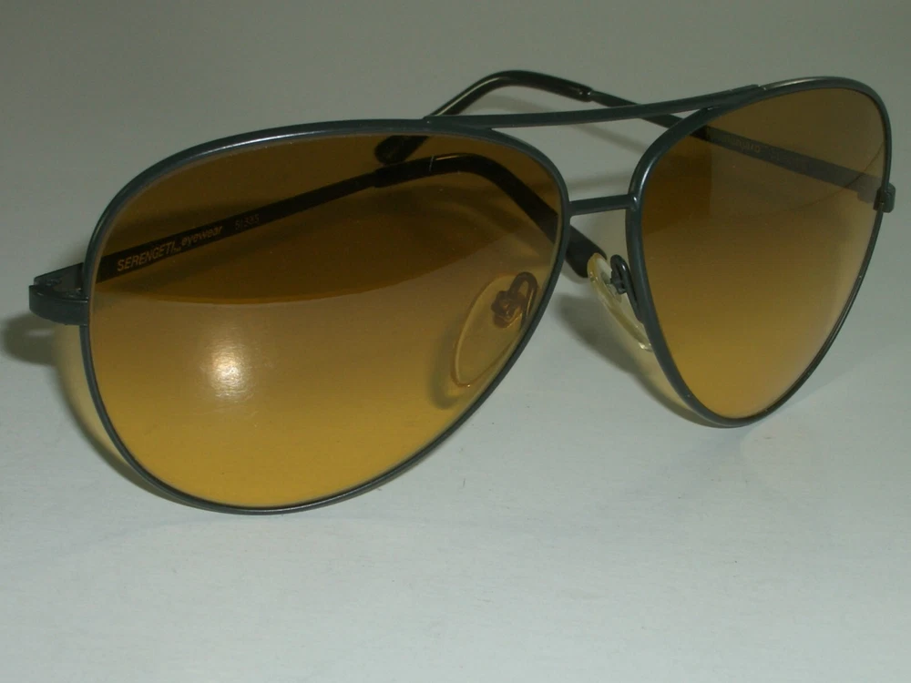 You are bidding on very gently used, stunning looking pair of SERENGETI 5133S KILIMANJARO SPECIES TOP GRADIENT YELLOWISH AMBER TONE CRYSTAL LENS BLACK AVIATOR SUNGLASSES w/CASE. Please see pictures for further details & markings. OVERALL EXCELLENT/SUPERB/SHINY CONDITION: VIEW IS SUPER CLEAR AS LENSES APPEAR TO BE EXCELLENT CONDITION. COMES WITH A GENERIC CASE FOR PROTECTION PURPOSES. Measures 5 1/2" across the hinges & overall vertical height is slightly over 2 1/8". Maximum width across of frame is 5 5/8" & length of temple is 5". Consolidated shipping is offered on multiple items purchased. Thanks for bidding!!!