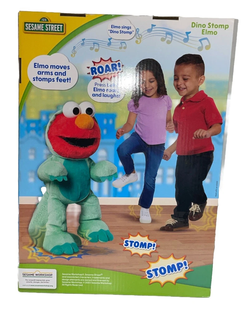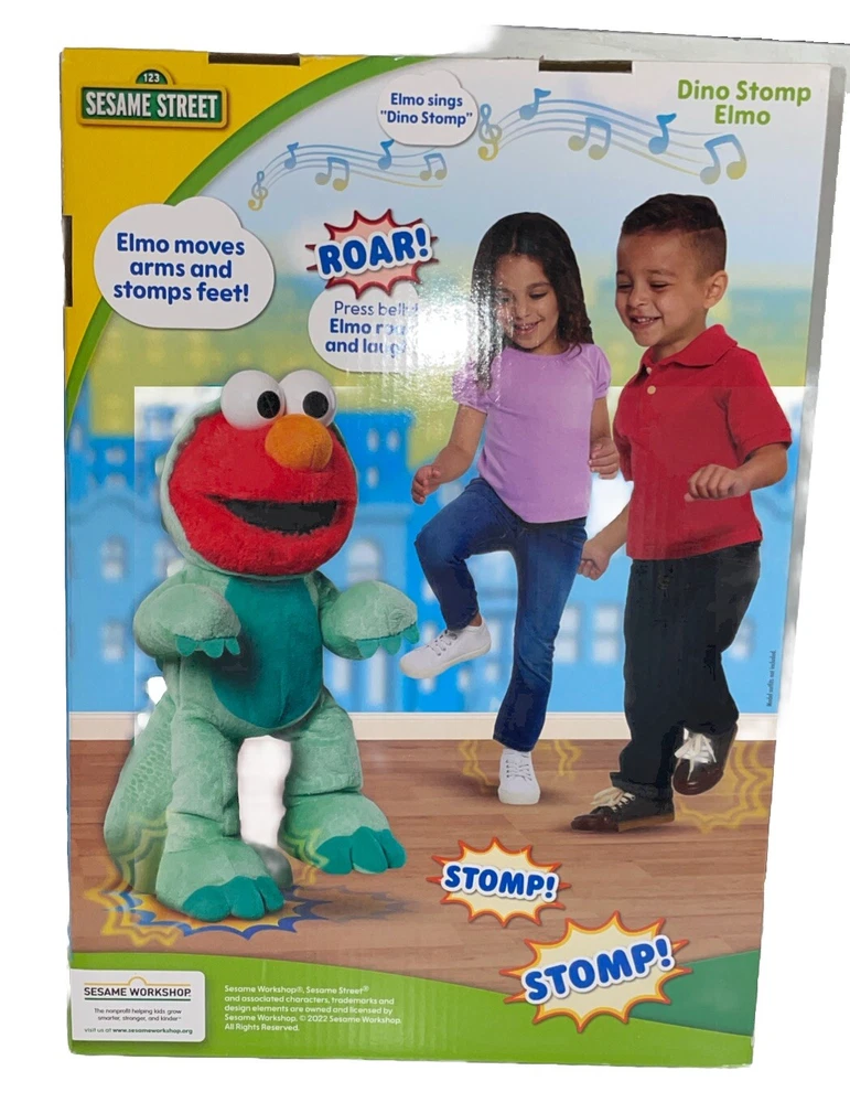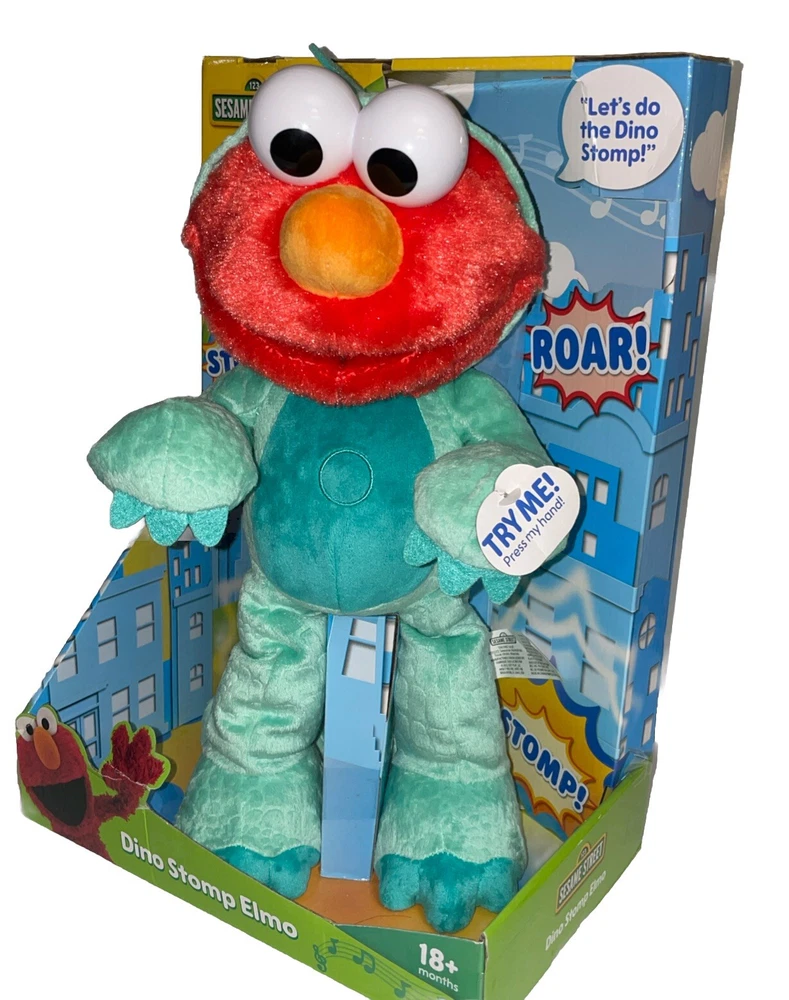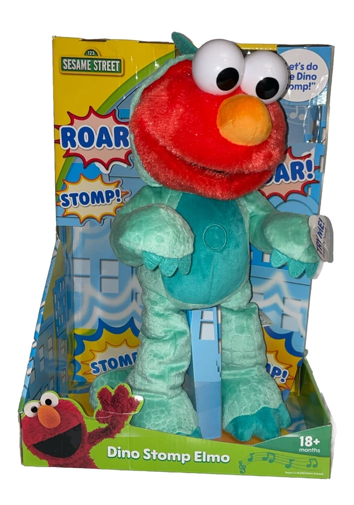 This is a Sesame Street Elertonic Elmo Plush Toy named Dino Stomp Elmo, measuring 13 inches. It is a teal-colored plush stuffed animal that sings and dances. Suitable for children aged 18 months and older, it belongs to the Sesame Street character family. Great for playtime and entertainment for kids between 1-4 years old.