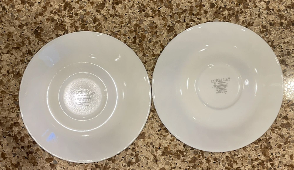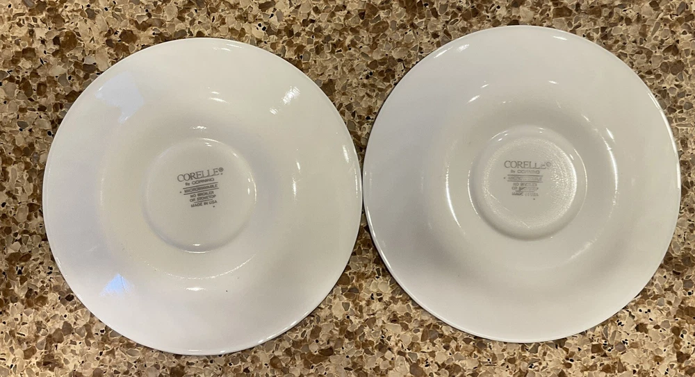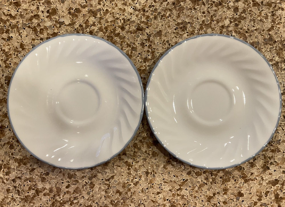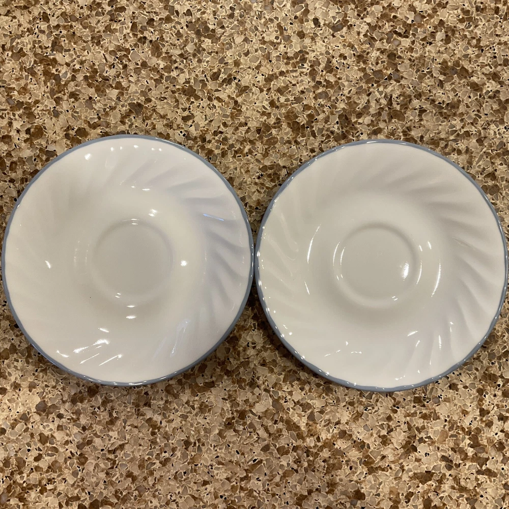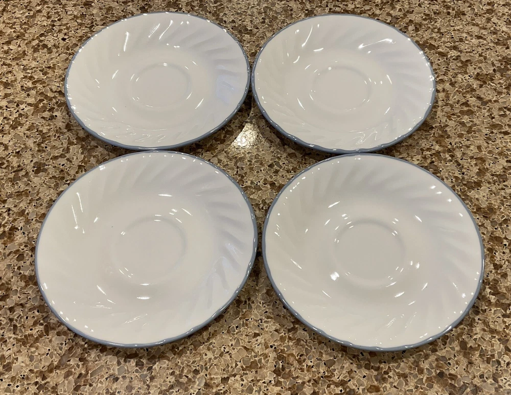 This set of four Corelle Enhancements Swirl Saucers with Blue Trim is perfect for those looking to add a touch of elegance to their dining table or need replacement pieces. The saucers are crafted from high-quality materials and feature a beautiful swirl pattern that is sure to impress your guests. The blue trim adds a pop of color to the classic white saucecers, making them a great addition to any table setting. Each saucer is designed to hold one cup and is perfect for use with a variety of foods, including pizza, pasta, and sandwiches. They are easy to clean and maintain, making them a practical choice for everyday use. Whether you're hosting a dinner party or just enjoying a casual meal with your family, these Corelle saucers are sure to impress. Each saucer is 6 inches in width and they are new. Excellent condition.