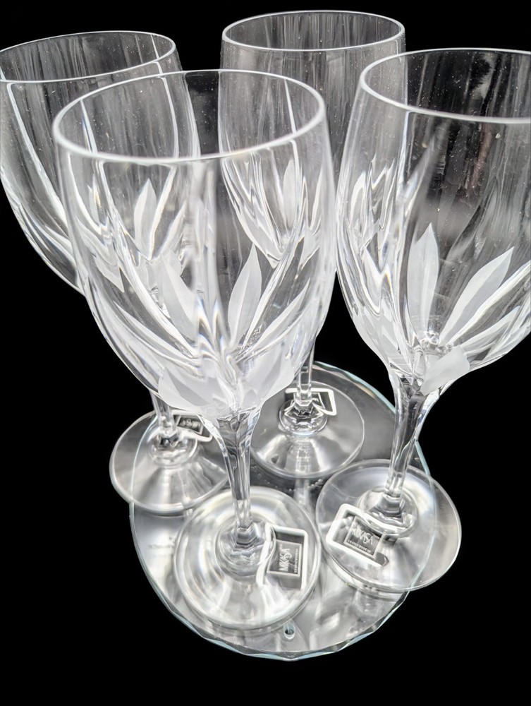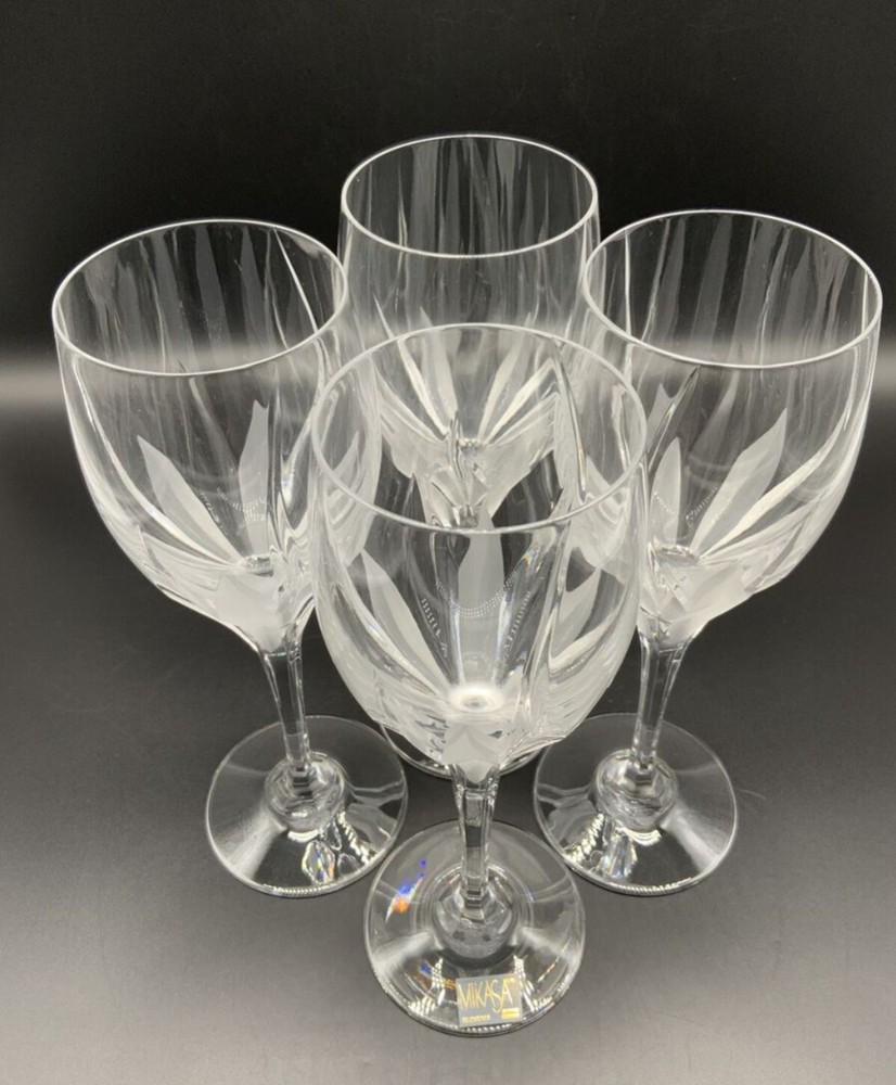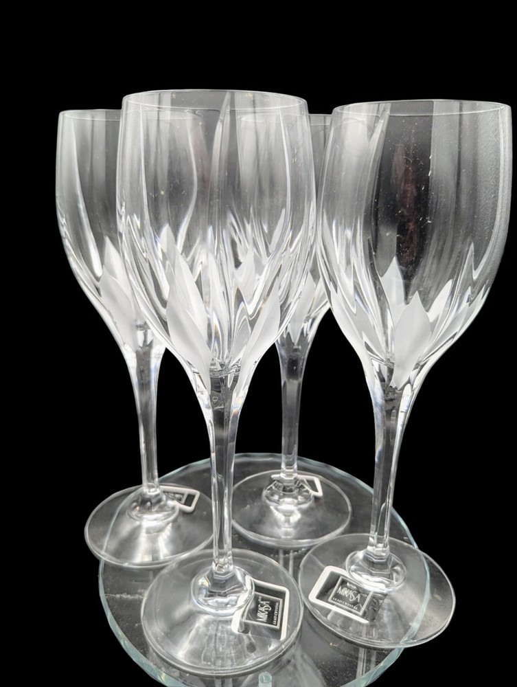 Gorgeous! Set of four. Mikasa Flame D'Amore wine glasses, a set that marries elegance with functionality. Crafted from premium crystal, these glasses showcase a distinctive Flame D'Amore pattern that adds a touch of romance and sophistication to any table setting. The glossy finish and cut swirl features enhance the visual appeal, making each glass a true work of art. Designed with care in Slovenia and manufactured between 1991 and 2020, these four-piece glasses are a rare find, reflecting both vintage charm and contemporary style. Ideal for all occasions, they stand 9 inches tall and boast a sleek, contemporary silhouette. To maintain their luster, hand washing is recommended. Add a timeless touch to your celebrations with these exquisite Mikasa crystal glasses.