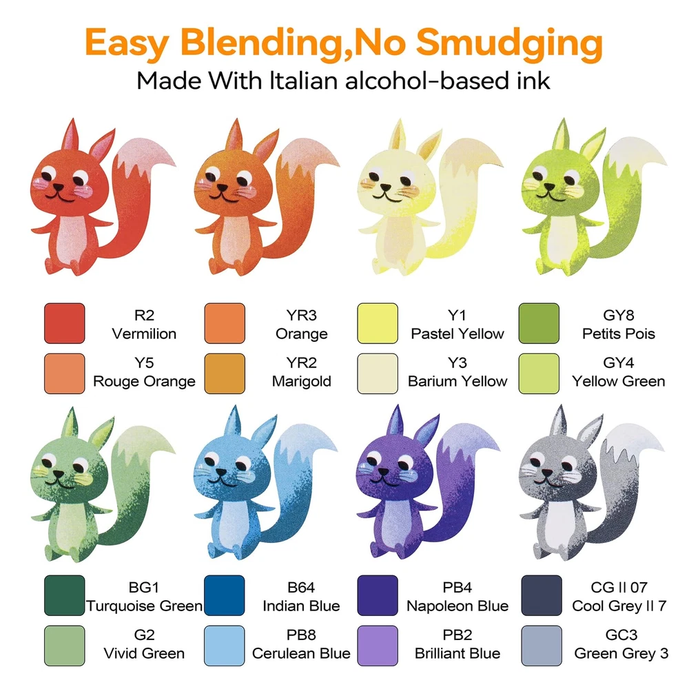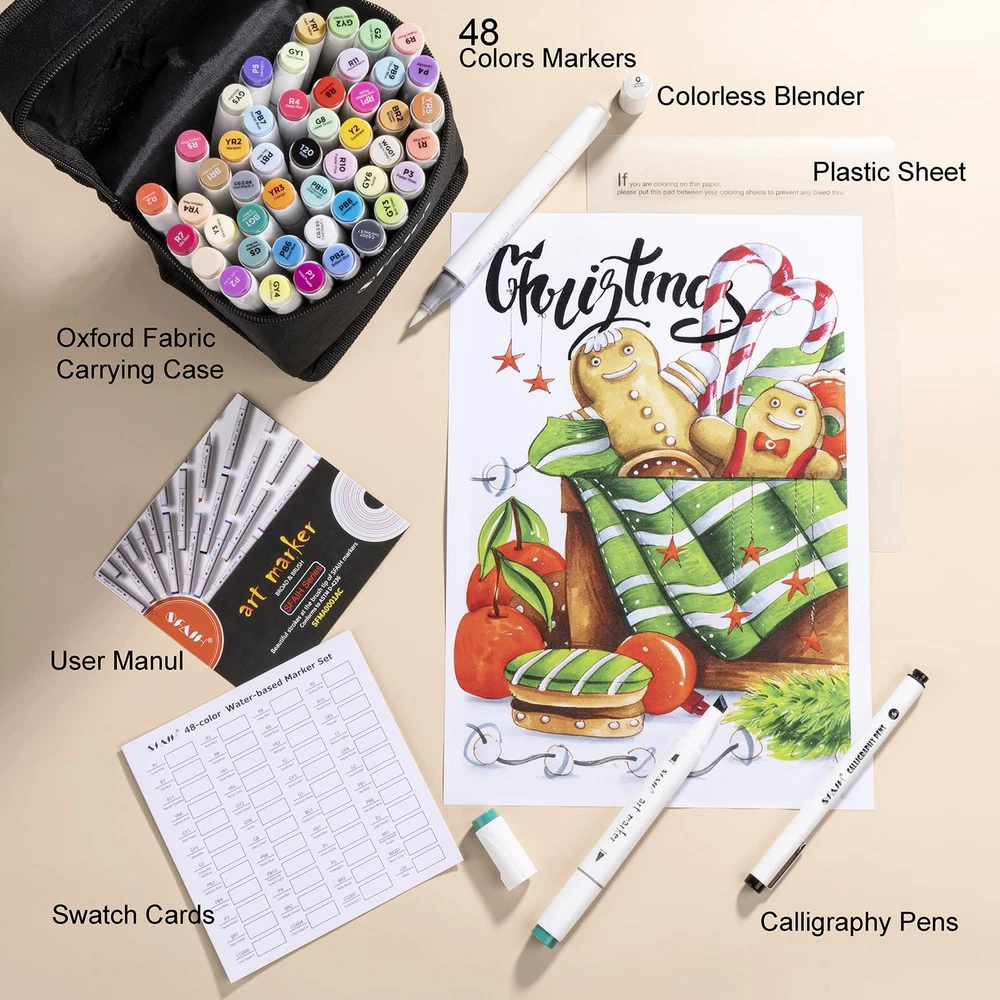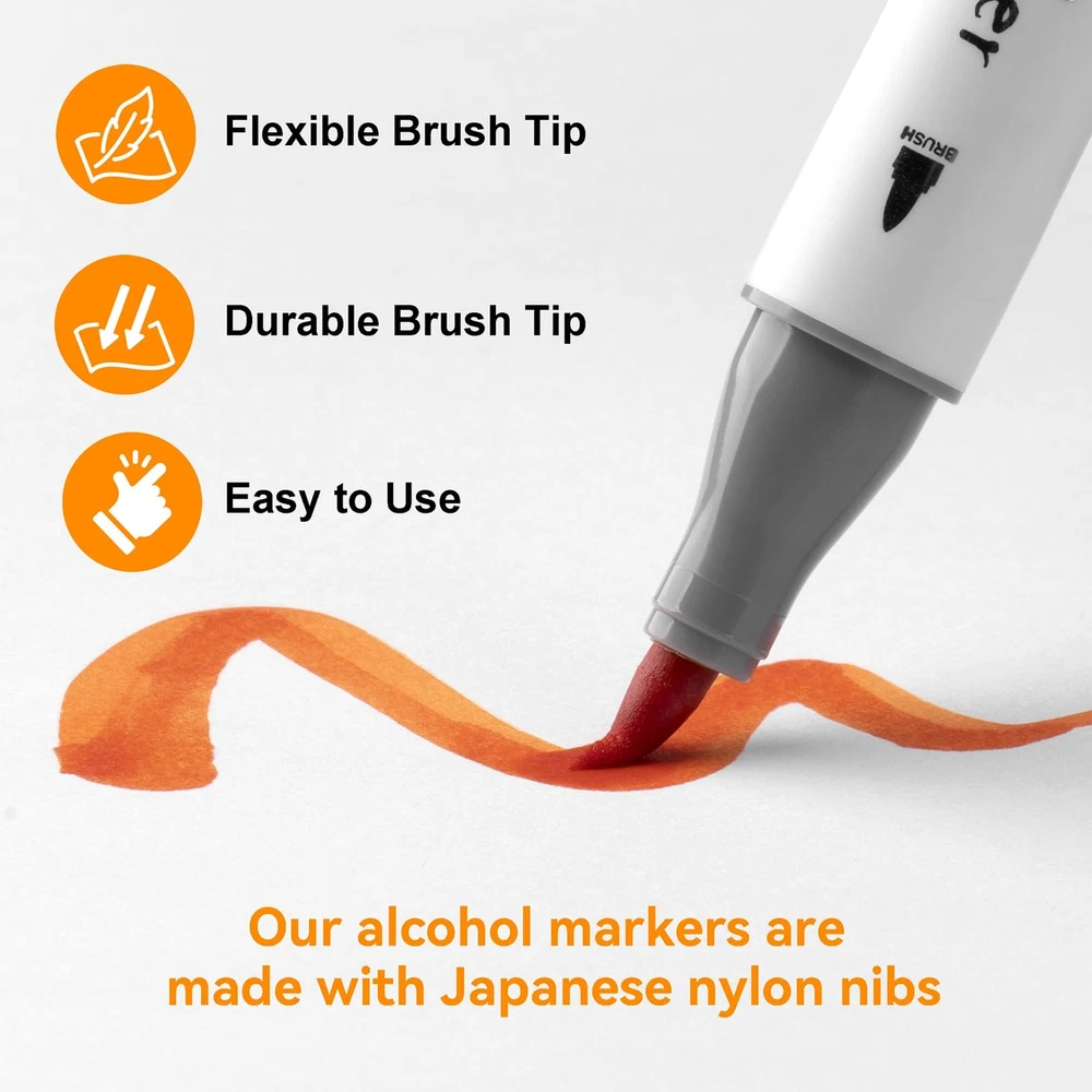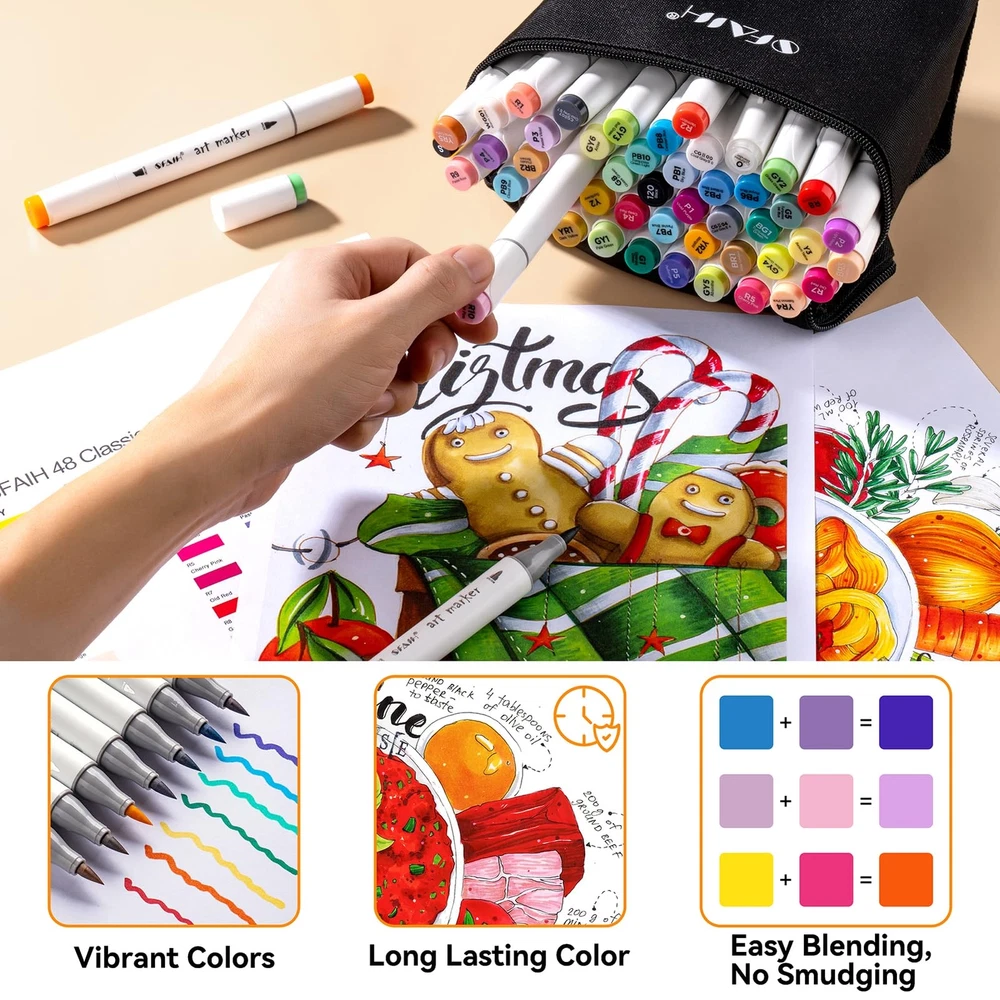 Explore Vibrant Possibilities: Our 48-color alcohol marker set excels in blending and delivering vivid, fast-drying colors, making it a favorite for artists and hobbyists for cartoons, illustrations, and graphic novels. Dual-Tip Flexibility and Control: The flexible brush tip of our art markers is excellent for blending and shading, drawing both thick and thin strokes, The chisel tip is ideal for creating consistent lines and for enhancing your creations with details. Seamless Blend, Lasting Color: Experience the fusion of quick-drying, enduring color with our brush tip markers, designed for seamless blending without smudging. The alcohol-based ink ensure your realistic images remain vibrant and fade-resistant. 48 Vibrant Colors + Colorless Blender: Embrace a world of color with our premium set of 48 vivid coloring markers, complete with a colorless blender for flawless blending and shading. these markers promise vibrant, long-lasting results for all your creative projects. Prevent Drying & Keep Organized: Our artist loft markers have caps that prevent the ink from drying out, with accurate color marking for easy identification, and come with an Oxford cloth storage bag for protection against loss and damage.