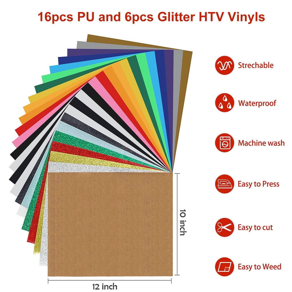 SGHUO 22 Pack HTV Heat Transfer Vinyl 12"x10" -16 Pack Assorted Colors Cricut...