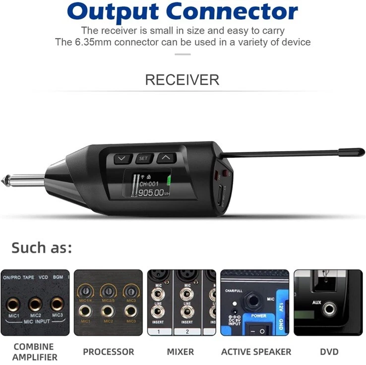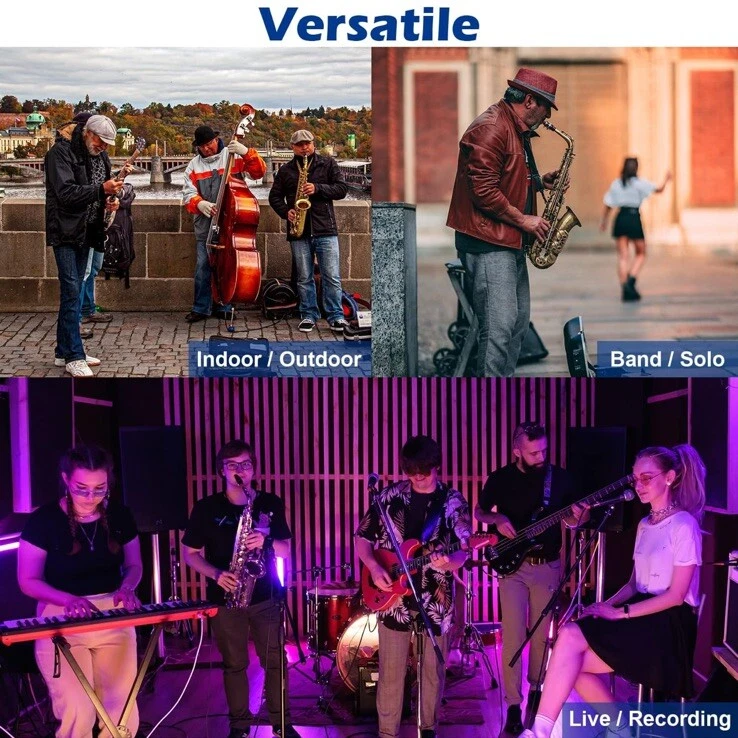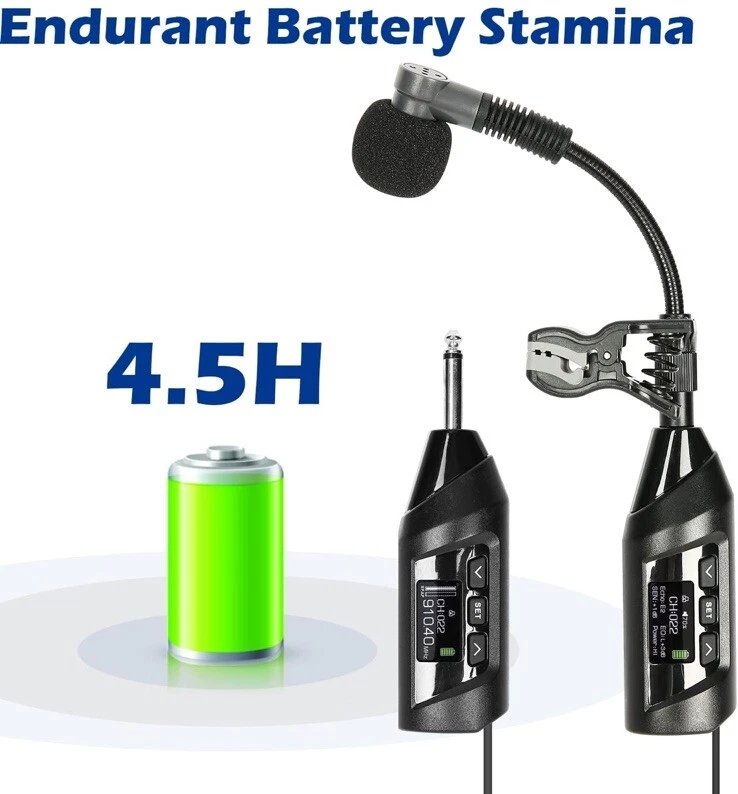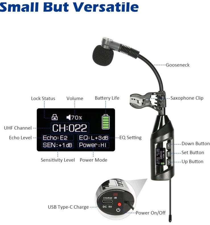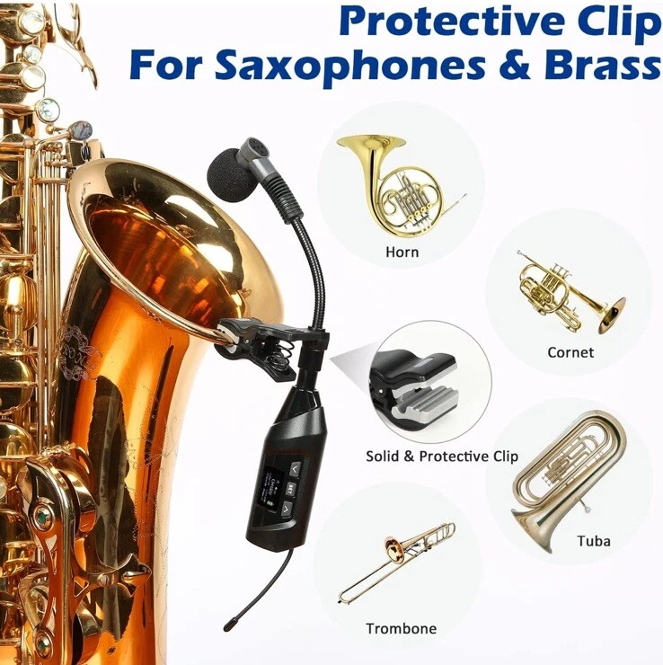 New open box. MULTIPLE TYPES OF BRASS: This wireless instrument microphone set is suitable for various types of horns, such as soprano, alto, tenor, and baritone saxophone, as well as trumpet, french horn, Tuba, and Trombone. ENJOY INTERACTION WITH AUDIENCE: The wireless sax microphone uses a digital chip circuit design to enhance stable signal transmission distance up to 196 ft (60 meters). You are going to focus and enjoy the freedom of performance and the interaction with your audience. NO DAMAGE ON YOUR GEAR: The specially designed sax mic clip with virgin rubber padding is firm and steady without leaving damage to your saxophones like those screw-on clips. EASY AND HANDY: The saxophone mic system comes with basic ECHO and EQ levels, 20 preset UHF channels (863-865 MHz), and LCD Indicators with crucial information such as Volume, RF/AF Signal, Channel, Echo, Sensitivity, Battery Life, etc. NO FUSTRATION ADJUSTING ANGLE: The gooseneck is well designed and made of first-class bronze material. It's steady and easy to adjust without the annoying rebound. HIGH EFFICIENT BATTERIES: The rechargeable transmitter and receiver are up to 4.5 hours stamina when fully charged. With the included charger, you are able to charge both at the same time. A sax mic and trumpet microphone that offers secure stamina for your performance. COMPACT & LIGHT: The wireless saxophone microphone set is small and light. It comes with a travel case that makes it easy and secure to travel with. NOTE ON CHARGING: The TR-15 uses USB Type-C to charge. A Type-C charge cable is included so you may use it with regular mobile phone charging adaptor. No adaptor is included in the package. What's in the box • Transmitter • Receiver • Gooseneck Microphone • Mic Clip for Saxophone Bell