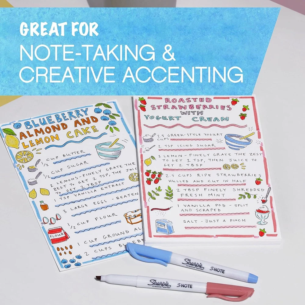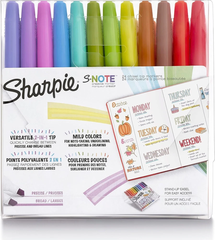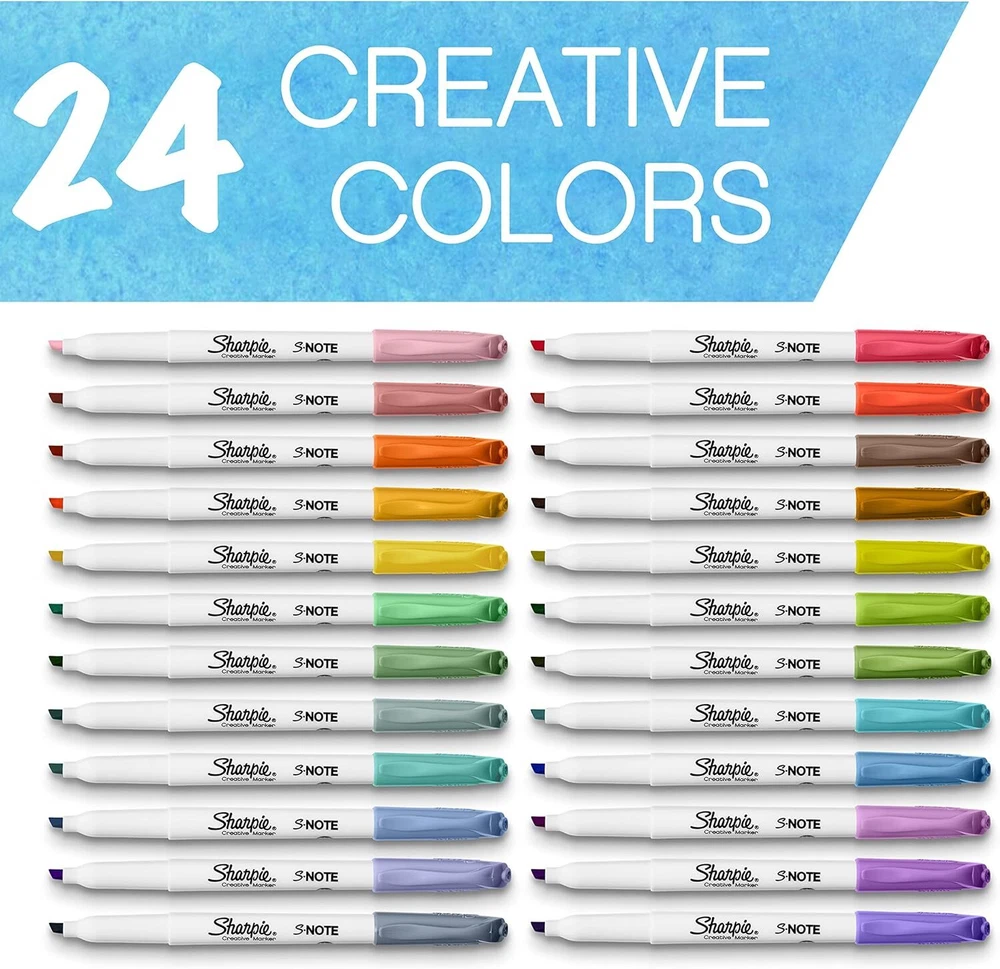 SHARPIE S-Note Creative Markers, Pastel Highlighters, Art Marker Set, Assorted Colors, Chisel Tip, 24 Count Product Details Brand: SHARPIE Ink Color: Multicolor Number of Items: 24 Point Type: Chisel Recommended Uses For Product: Marking Out, Drawing, Writing All-in-one creative marker and highlighter marker Mild colors are perfect for note-taking, underlining, highlighting, drawing and more Versatile 2-in-1 chisel tip marker lets you quickly change between precise and broad lines No-bleed ink keeps your work looking clean Contains 12 markers in assorted colors