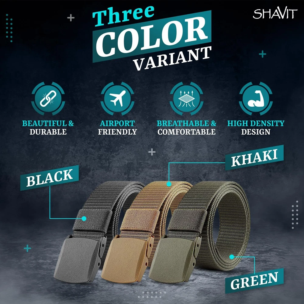 SHAVIT Nylon Belts for Men, Work Belt Adjustable Slide Plastic Buckle Web Canvas Tactical Belt, Great for Outdoor Hiking, Fishing, Hunting, Work and Every Day Use Nylon Canvas Breathable Military Tactical Men Waist Belt With Plastic Buckle Airport Friendly - Metal-Free Plastic Cam Buckle Belts for Men and Women with No Metal Plastic Buckle for Work and Travel Adjustable Size - Hole-less belt means you can adjust the length freely Shipping We offer FREE shipping on all orders! We ship within Three business days of payment, usually sooner. We use a selection of shipping services such as UPS, FedEx, USPS etc. We only ship to the lower 48 states, no APO/FPO addresses or PO Boxes allowed. Local pickups and combined shipping options are not provided at this time. Return You can return a product for up to 30 days from the date you purchased it. Any product you return must be in the same condition you received it and in the original packaging. Please keep the receipt. Payment We accept payment by any of the following methods: PayPal Please pay as soon as possible after winning an auction, as that will allow us to post your item to you sooner! Feedback Customer satisfaction is very important to us. If you have any problem with your order, please contact us and we will do our best to make you satisfied. Contact Us If you have any queries, please contact us via ebay. We usually respond within 24 hours on weekdays. Please visit our eBay store to check out other items for sale! Thank you for shopping at our store.