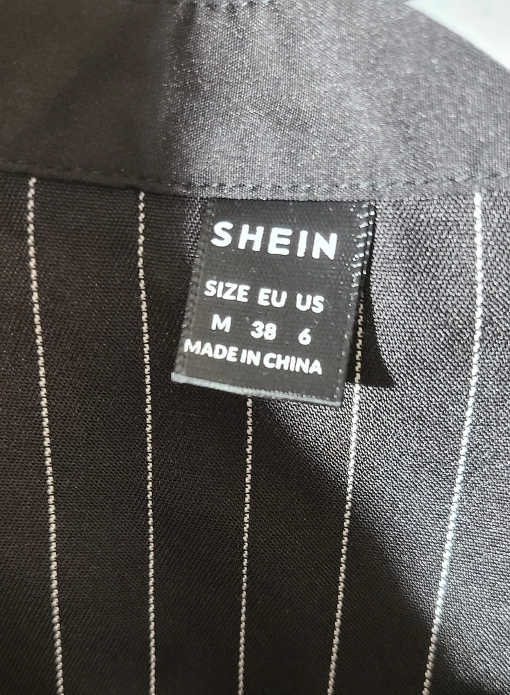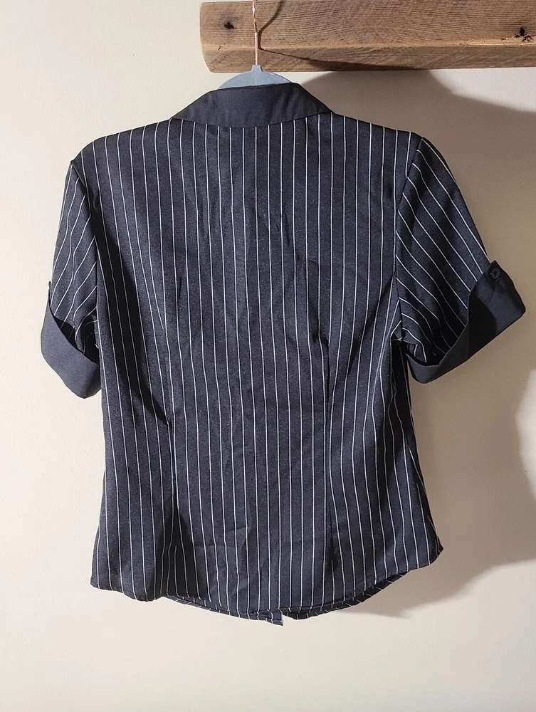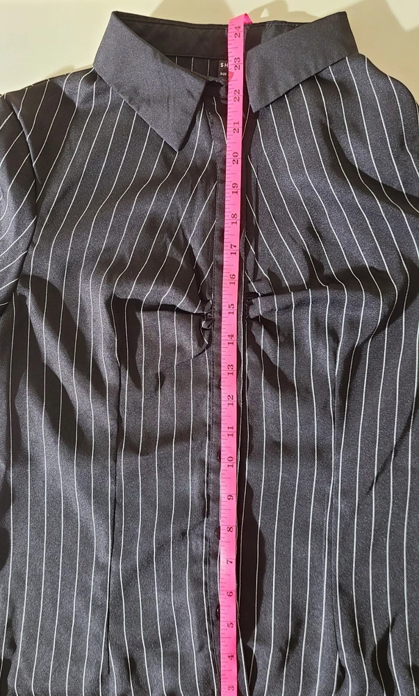 Sleeve Length: Short Sleeve Personalize: No Accents: Button Brand: SheIn Features: Slimming Material: Polyester, Elastane Size: M Pattern: Striped Type: Button-Up Sleeve Type: Roll Tab Sleeve Season: Fall, Spring, Summer, Winter Neckline: Collared Garment Care: Machine Washable Color: Black Occasion: Business, Casual, Formal, Party/Cocktail, Travel, Wedding, Workwear Country/Region of Manufacture: China Vintage: No Size Type: Regular Fit: Regular Style: Basic Department: Women Handmade: No Theme: City, Classic, Geek, Gothic, Grunge, Hip Hop, Korean, Nerd, Preppy, Punk, Rock, School, University, Emo, Casual, Y2K Closure: Button