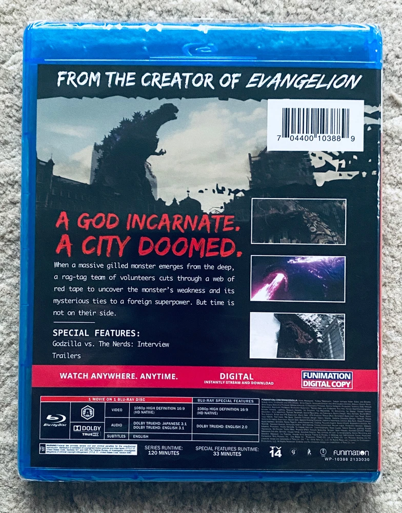 Shin Godzilla: Movie Blu-ray シン・ゴジラ / Shin Gojira / Godzilla: Resurgence Video Codec: MPEG-4 AVC (32.00 Mbps) Resolution: 1080p Aspect ratio: 2.40:1 Original aspect ratio: 2.39:1 Audio Japanese: Dolby TrueHD 3.1 English: Dolby TrueHD 3.1 Subtitles English Discs Blu-ray Disc Single disc (1 BD-50) Packaging Inner print Playback 2K Blu-ray: Region A It's a peaceful day in Japan when a strange fountain of water erupts in the bay, causing panic to spread among government officials. At first, they suspect only volcanic activity, but one young executive dares to wonder if it may be something different… something alive. His worst nightmare comes to life when a massive, gilled monster emerges from the deep and begins tearing through the city, leaving nothing but destruction in its wake. As the government scrambles to save the citizens, a ragtag team of volunteers cuts through a web of red tape to uncover the monster's weakness and its mysterious ties to a foreign superpower. But time is not on their side – the greatest catastrophe to ever befall the world is about to evolve right before their very eyes.