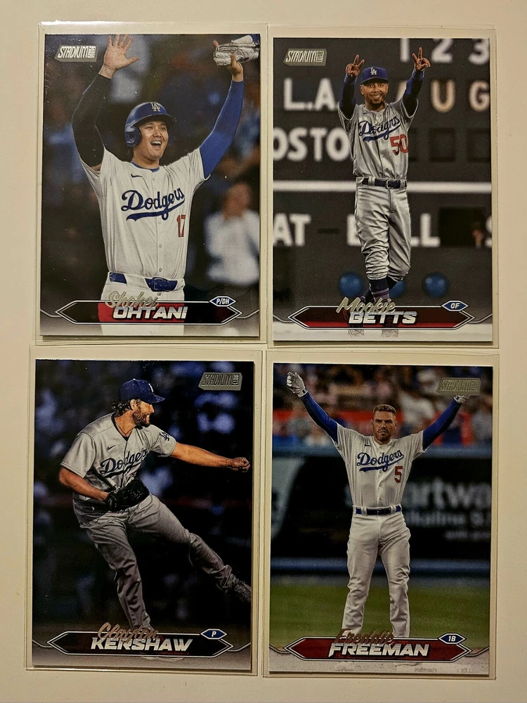 This lot includes 14 cards from the 2024 Topps Stadium Club baseball set featuring players from the Los Angeles Dodgers including Shohei Ohtani, Mookie Betts, Freddie Freeman, and Clayton Kershaw. The cards are made of high-quality card stock and are original, not licensed reprints. The set includes both base cards and rookie cards, making it a great addition to any collection. The cards are in standard size and were manufactured in the United States in 2024. This lot is perfect for any Major League (MLB) baseball fan and is a must-have for collectors.