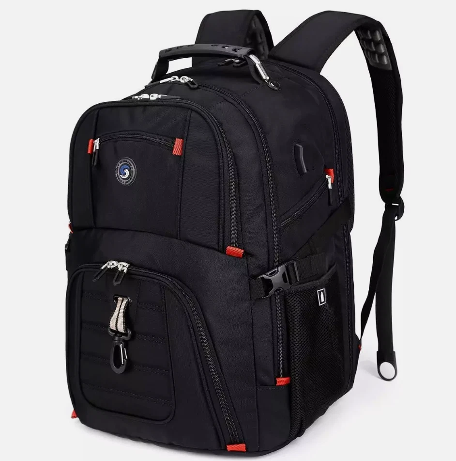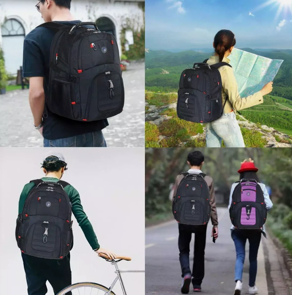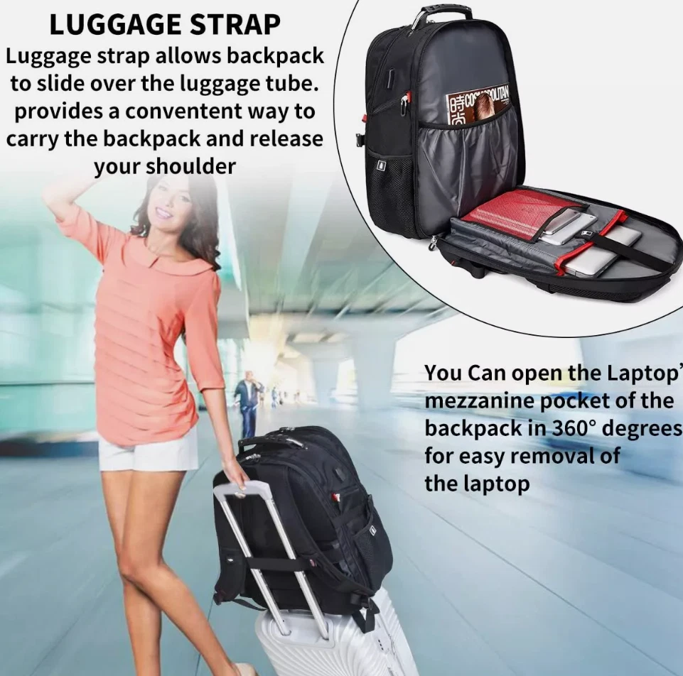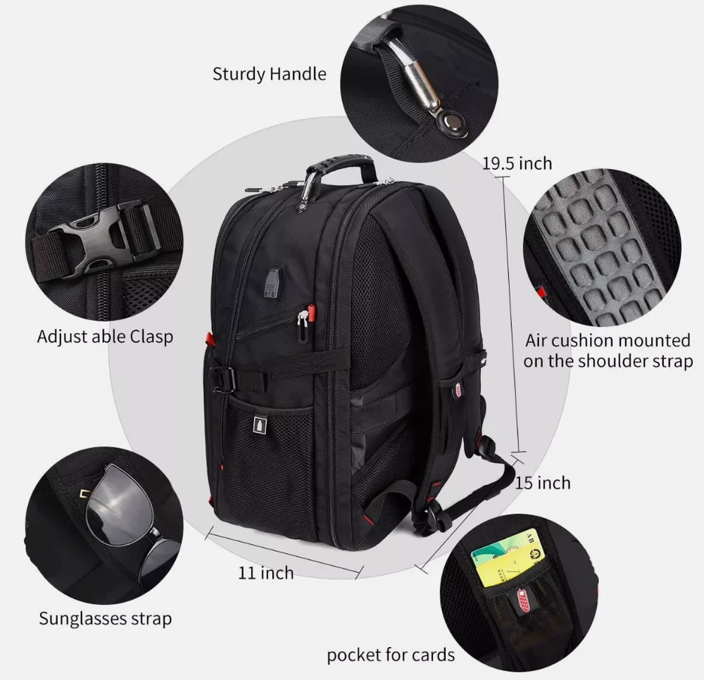 LARGE CAPACITY AND ORGANIZED: men travel backpack owns 20 independent pockets for large storage and organization for small items. 3 spacious main multi compartments with many hidden pockets can accommodate lots of stuffs like college supplies, travel accessories, clothes, stationery, notebook, cord organizer, side deep Zipper pocket for Easy access essentials, side Elastic net pockets conveniently hold travel gear umbrellas or water bottles. EXTRA LARGE and DURABLE MATERIAL: Size of extra large travel laptop backpack: 19.5x15x11 (inches), Capacity: 50L, separate padded laptop compartment hold for 13 inch MacBook, 14, 15, 15. 6 and up to 17inch Laptop backpack/computers for women men . The scan smart laptop backpack made from high quality material with nylon lining for better WATER RESISTANT and heavy duty backpack Large laptop backpack for the City MULTIPURPOSE: unfolds the extra large backpack freely 90-180 degree, exclusive designed for airplane traveling. The big backpack is perfect for indoor/outdoor activities. Served as durable large backpack business work bag, large laptop bag or spacious college backpack, you can use it at anywhere for International travel, camping, hiking and overnight trip PRACTICAL AND CONVENIENT: external USB port with set-in charging cable offers convenient charging your cellphone. A hole for headphone outside gives easy access to Earphone usage. Also, the backpack with a sturdy rugged handle with steel cable on the top for carrying, side compression straps keep the exclusive backpack at whatever size you requires. As a men's/women's backpack, you will enjoy It's fashionable, comfortable and convenient everywhere COMFORTABLES: Tech backpack with back U shaped three dimensional ventilation design, comfortable wide breathable mesh shoulder straps with plentiful sponge pad help relieve the stress from your shoulder. Both sides of the shoulder strap with lanyard design, can hang sunglasses and other small pendants. Premium Book bags for men Also computer backpack for women.This item is not intended for use by people 12 years old and under Product Details: Product Dimensions: 15 x 11 x 19.5 inches Item Weight: 2.8 pounds Department: mens Manufacturer: SHRRADOO Country of Origin: China Item model number: 983035 Is Discontinued By Manufacturer: No Age Range Description: Adult Item Weight: 2.8 Pounds Number Of Items: 1 Capacity Total: 52 Liters