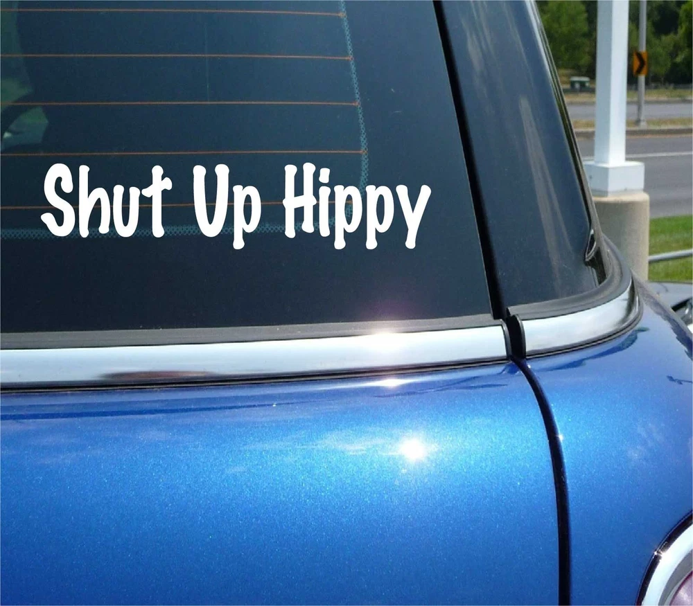 SHUT UP HIPPY DECAL STICKER FUNNY LIBERAL CONSERVATIVE POLITICS GAG PRANK JOKE