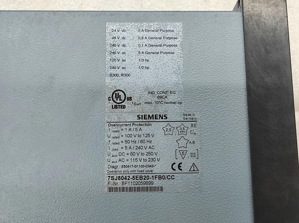 We are pleased to offer SIEMENS 7SJ8042-5EB20-1FB0/CC OVERCURRENT PROTECTION RELAY Product Detail: SIEMENS 7SJ8042-5EB20-1FB0/CC OVERCURRENT PROTECTION RELAY PART NO: 7SJ8042-5EB20-1FB0/CC F-NR: BF1102059901 TYPE: OVERCURRENT PROTECTION RELAY DIAGRAM: E50417-G1100-C343 MADE IN GERMANY Shipment processing time: All orders are processed within 1-2 business days. Orders are not shipped or delivered on weekends or holidays. Shipment confirmation & Order tracking: You will receive a Shipment Confirmation email once your order has shipped containing your tracking number(s). The tracking number will be active within 24 hours. Customs, Duties and Taxes: We are not responsible for any customs and taxes applied to your order. All fees imposed during or after shipping are the responsibility of the customer (tariffs, taxes, etc.). Damages: In case of damage or lost of shipment during transit, We will investigate the matter and provide the satisfactory resolution. Returns Policy: We offer return or exchange of ordered item up to 30 days of receipt of goods in subject to certain condition. In case of damaged goods we shall offer the replacement or refund for the ordered item. If you require any more details, request you to send us the direct message through eBay for early resolution. Thanks