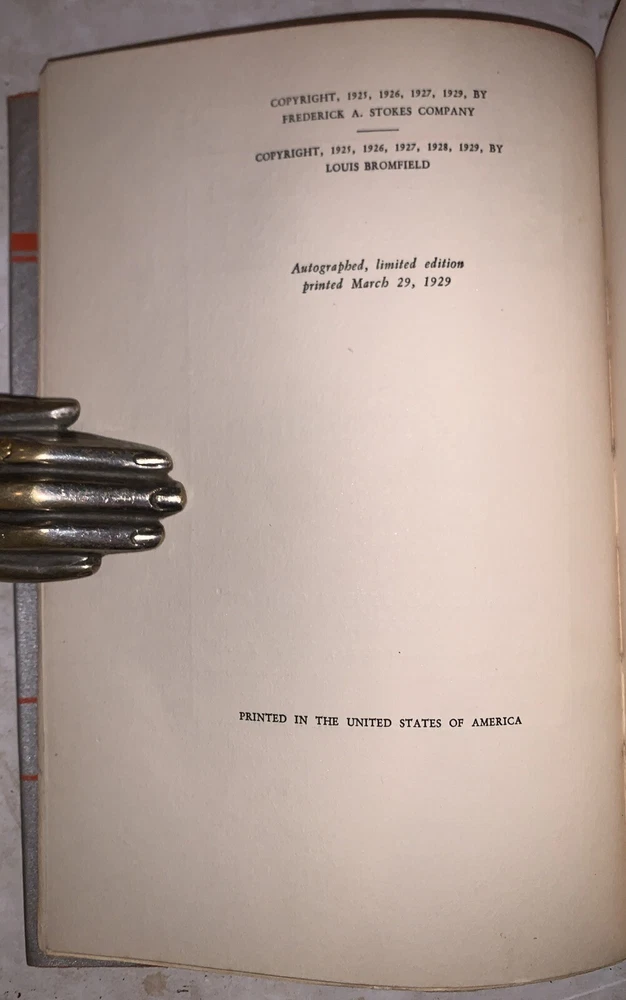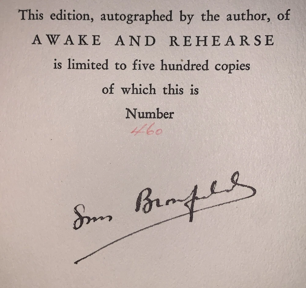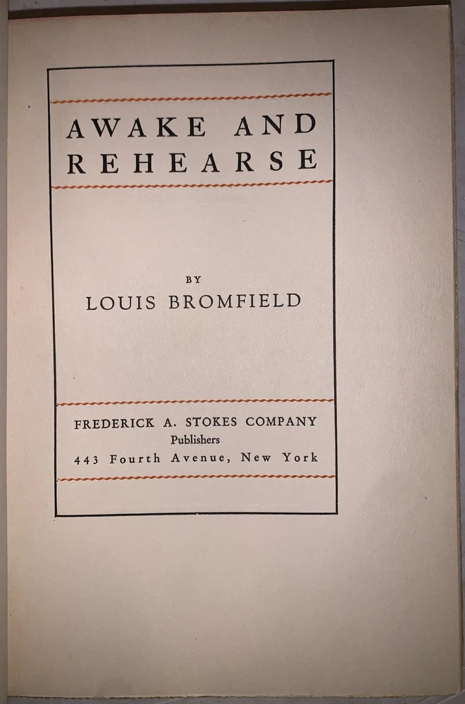 Awake and Rehearse by Louis Bromfield New York: Frederick A. Stokes Company 1929 First Edition Thus This edition, autographed by the author, of Awake and Rehearse is limited to five hundred copies of which this is Number 460 Signed by the author on the limitation notice. Octavo, 349 pages, publisher's original silver boards. Publisher's original decorative slipcase. Some of the edges remain unopened. Some rubbing and wear, discoloration and wear to slipcase. Loss to spine, some water damage but without any odor, else in good condition. Awake and Rehearse by Louis Bromfield is a lesser-known yet thought-provoking work that delves into themes of human resilience, self-discovery, and the interplay between past and present. Bromfield, known for his keen storytelling and deep philosophical reflections, crafts a narrative that blends personal introspection with broader social commentary. The book explores the complexities of life’s choices and the ways in which individuals rehearse their actions, both literally and metaphorically, in pursuit of a fulfilling existence. With his characteristic lyrical prose and rich character development, Bromfield presents a compelling meditation on the nature of ambition, regret, and the perpetual struggle to balance personal desires with societal expectations. While not as widely recognized as some of his other works, Awake and Rehearse remains a testament to Bromfield’s literary prowess and his ability to capture the subtleties of human experience. If you have any questions, feel free to ask, and don't forget to check out my other listings.