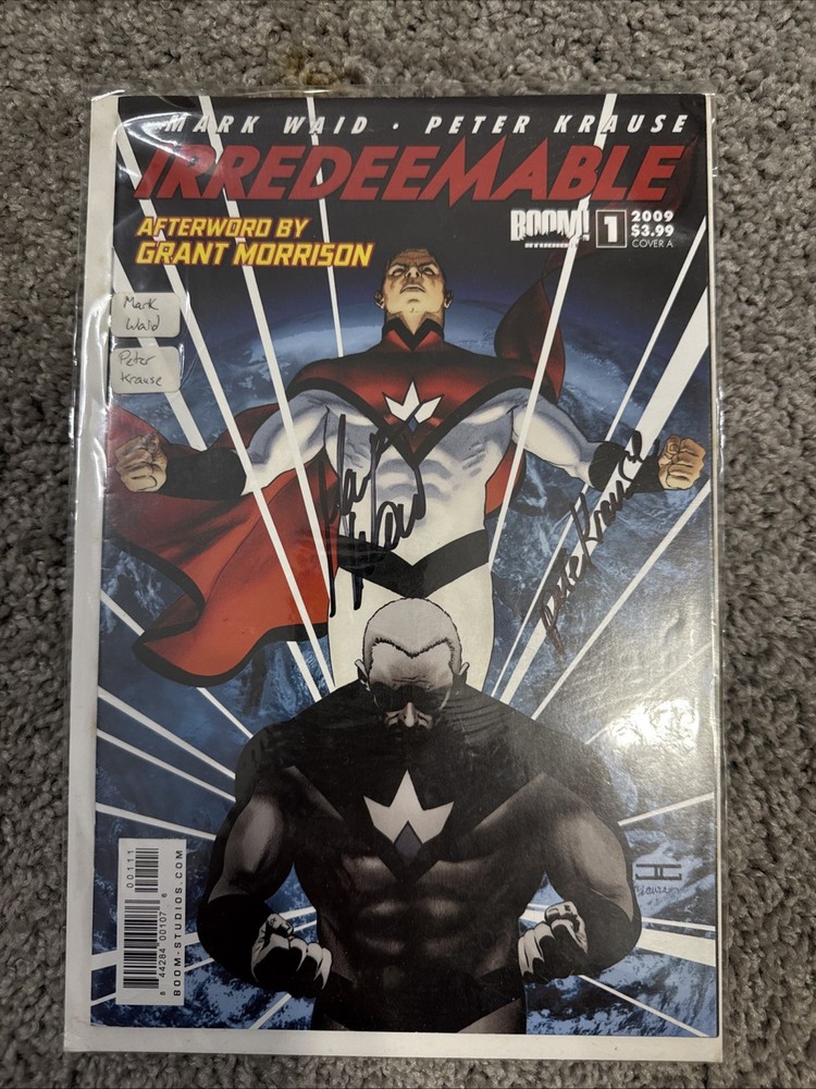 The product is a signed collector's edition comic book, Irredeemable 1, published by BOOM! Studios in April 2009. The comic book is written by Mark Waid and signed by both Waid and Peter Krause. This single issue is part of the modern age era of US comics and falls under the genre of superheroes and comics. This first edition comic book is a unique and valuable addition for fans and collectors of comic books.