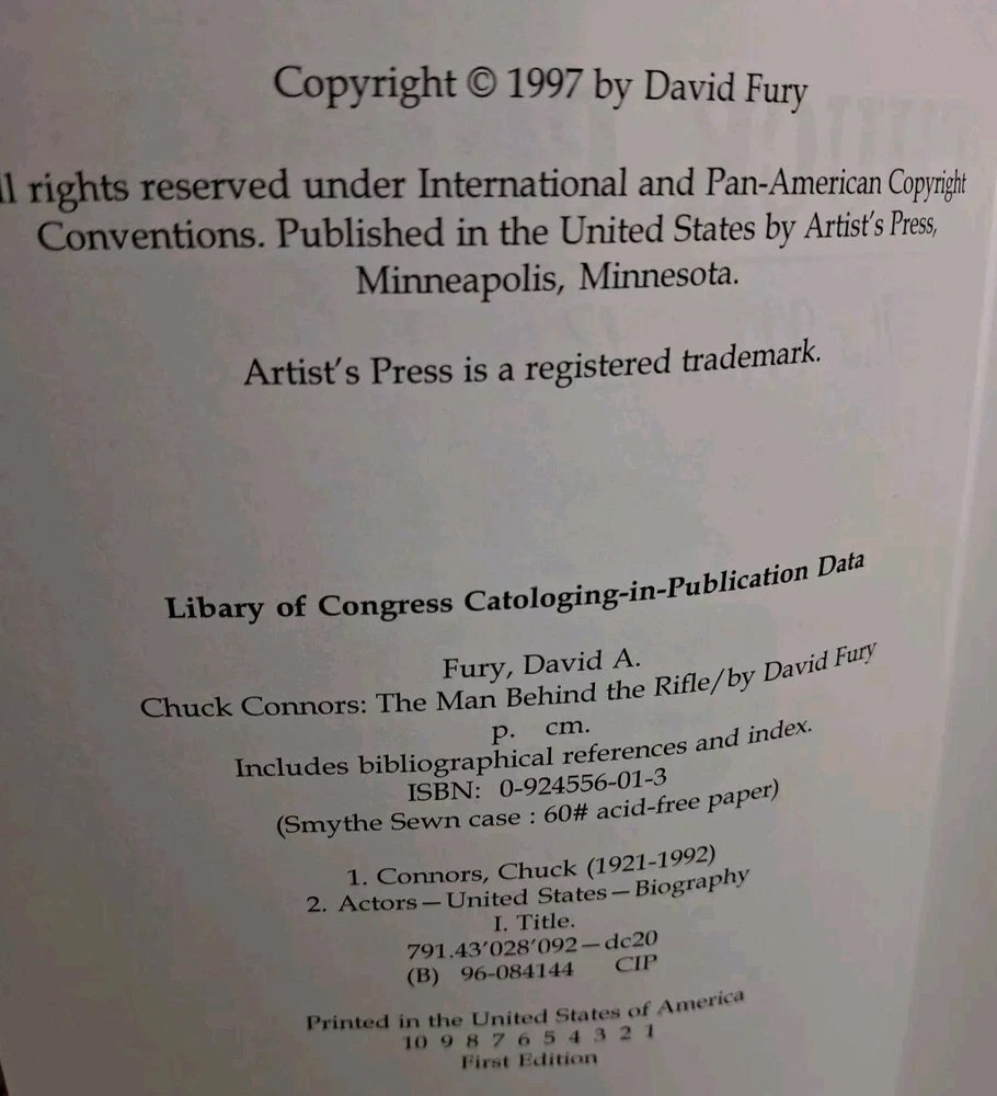This is a rare and valuable hardcover copy of "Chuck Connors The Man Behind The Rifle" by David Fury. The book is a first edition and comes with a dust jacket. It is signed by the author and features a fascinating biography about the life of Chuck Connors, an iconic figure in American history. The book is published by Manning and is written in English. The book is perfect for collectors of rifles or those interested in biography and autobiography. It is a must-have for anyone who appreciates the life and legacy of Chuck Connors. This item is made in the United States and is a great addition to any book collection.