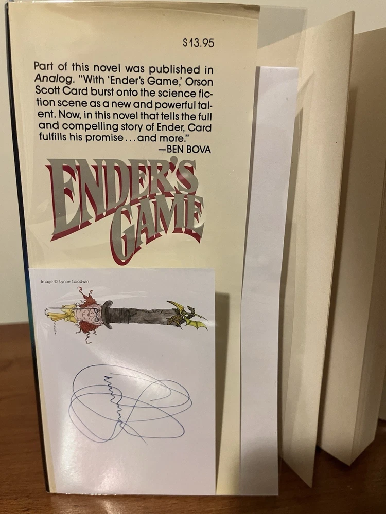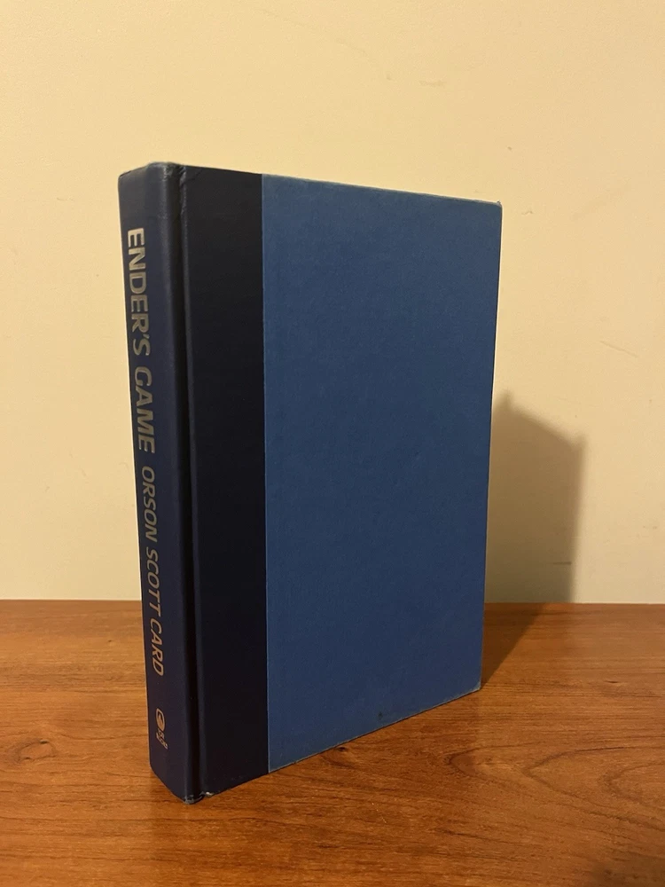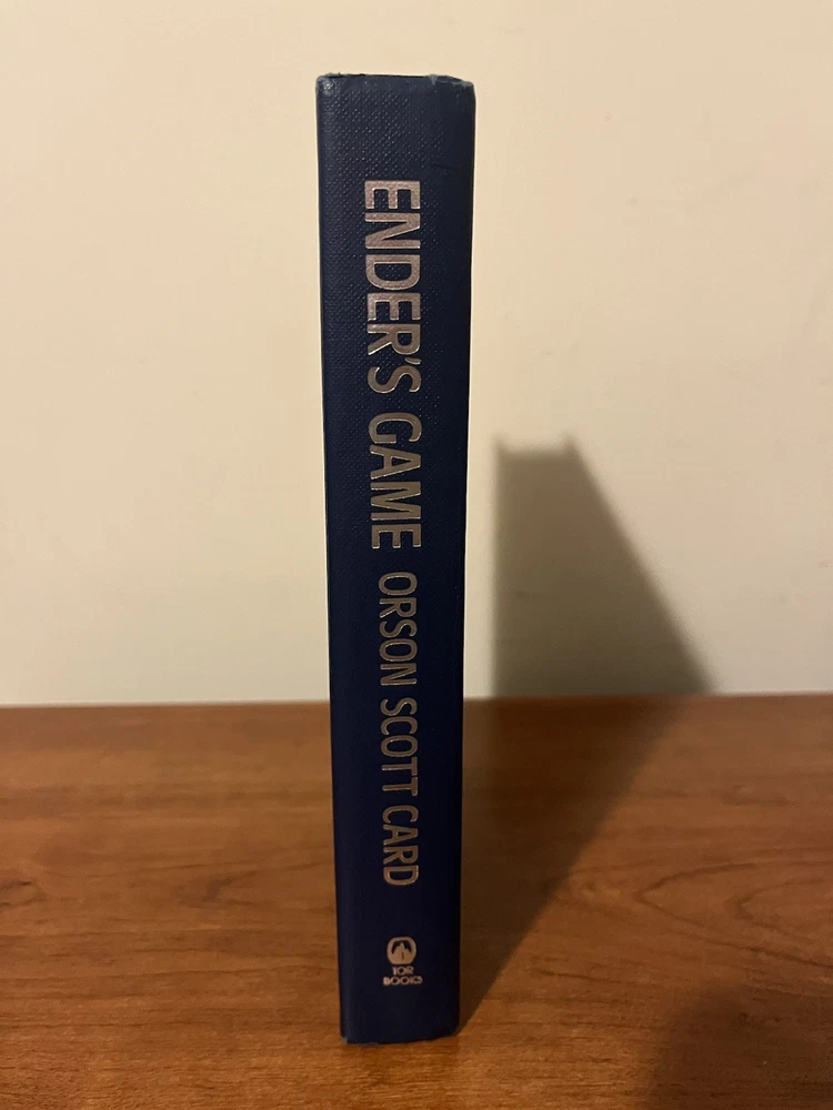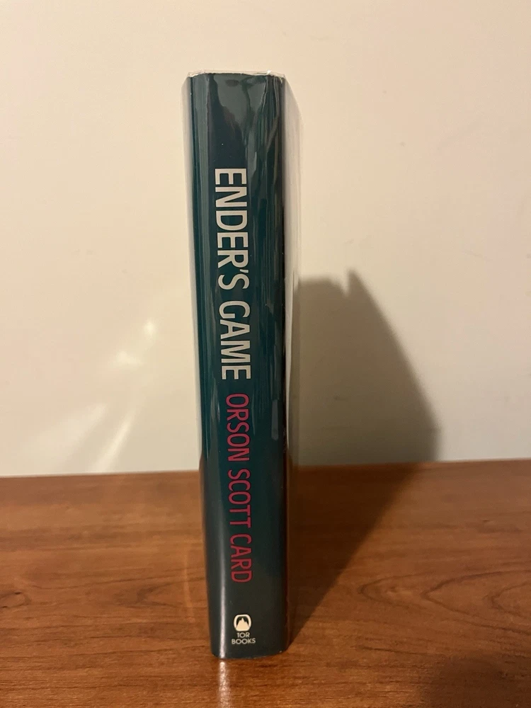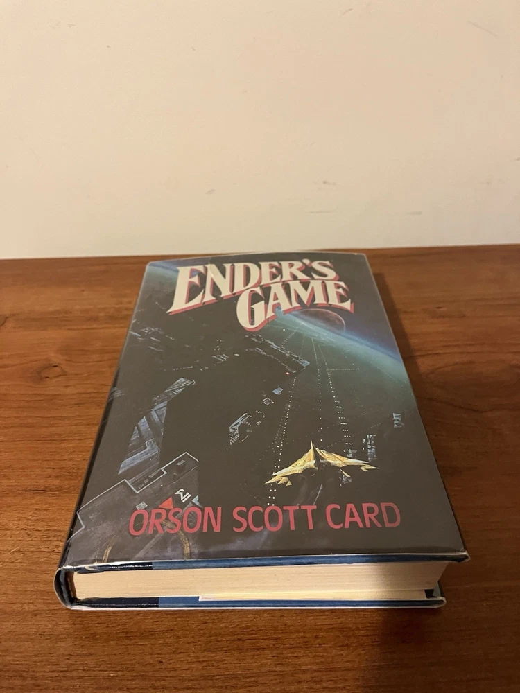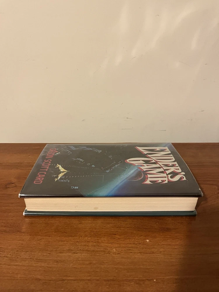 This is the very rare first edition, first printing of Ender’s Game. This copy is in very good condition. The dust jacket has a closed tear at the top of the front panel that’s been taped from the reverse side. There are a couple of light scratches on the rear panel and very minor chipping on the corners. There is also a light crease on the upper right corner of the front panel and a very small rip on the bottom left of the front panel. The book has wear along the edges and a minor spot on the text block, but the interior is clean and the binding is strong. This copy comes with a laid in bookplate signed by Orson Scott Card. It can be affixed to the book but I will leave it laid in between the Mylar covering and front jacket flap.