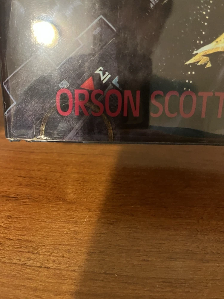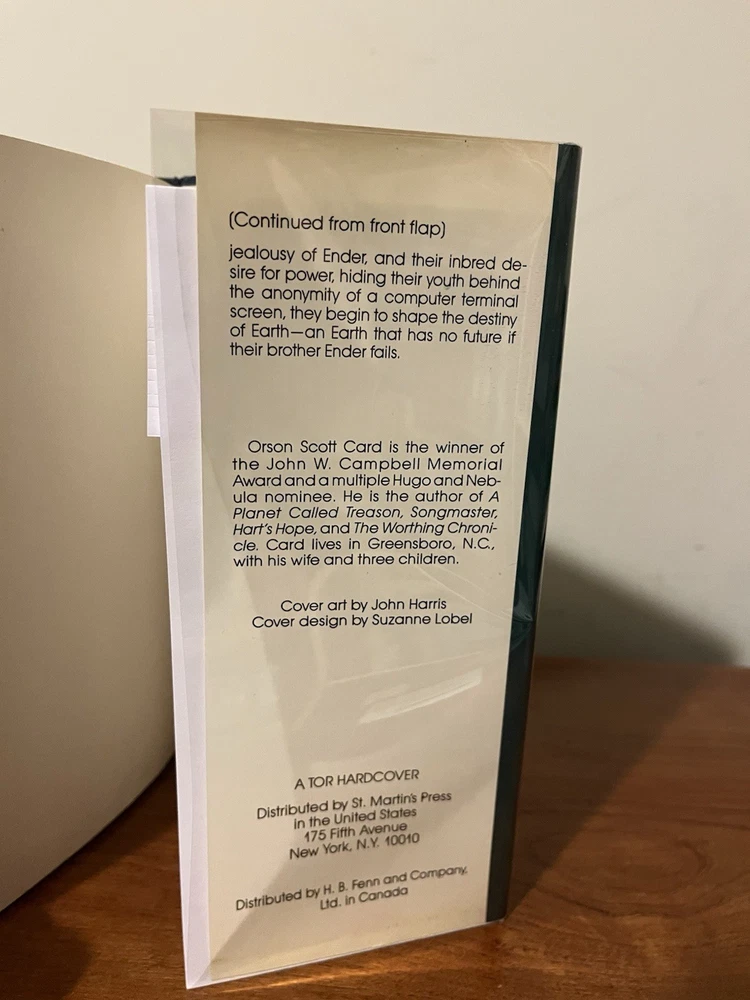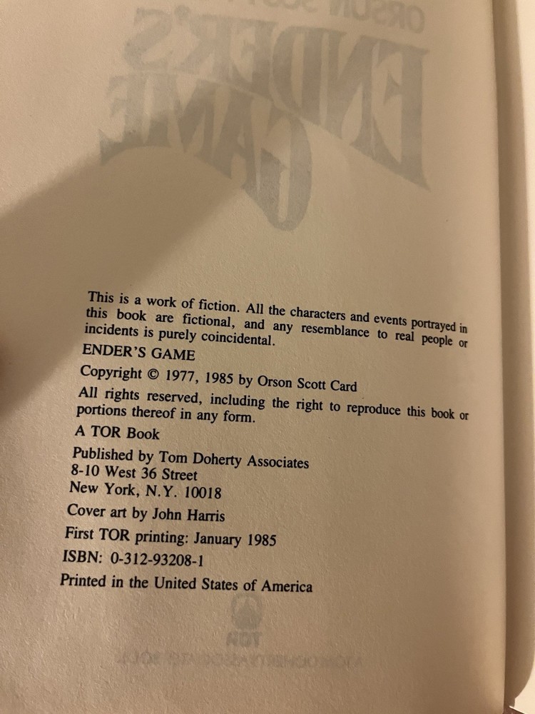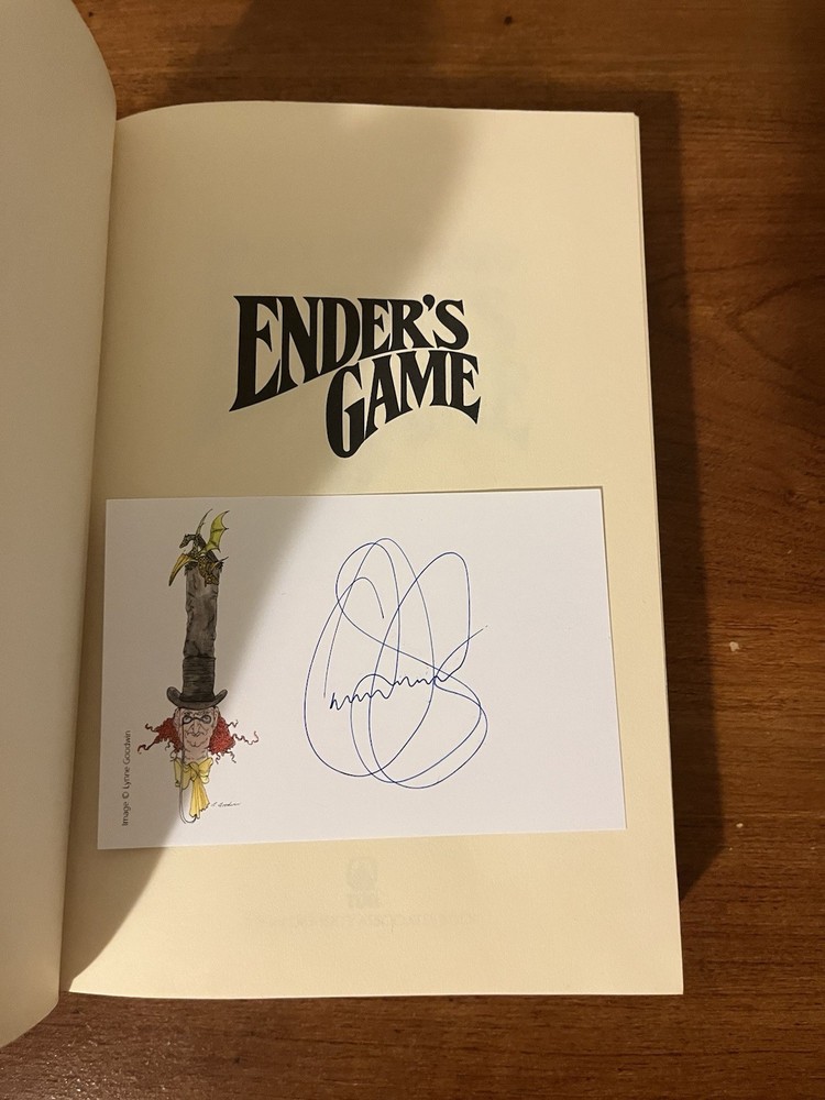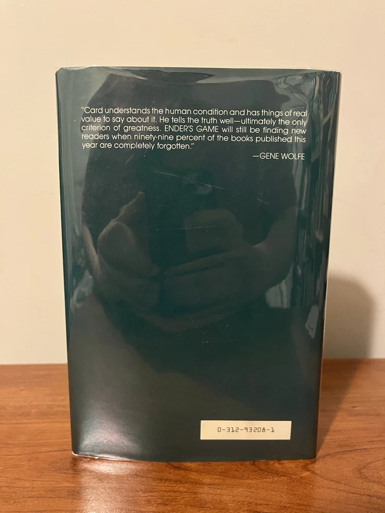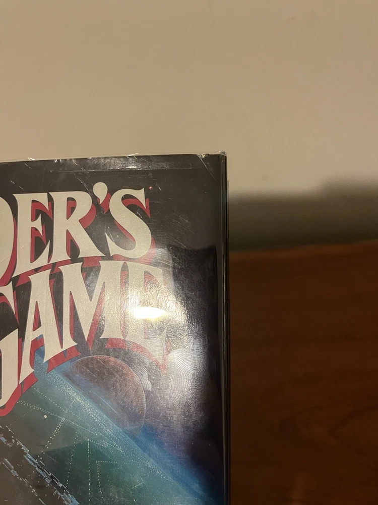This is the very rare first edition, first printing of Ender’s Game. This copy is in very good condition. The dust jacket has a closed tear at the top of the front panel that’s been taped from the reverse side. There are a couple of light scratches on the rear panel and very minor chipping on the corners. There is also a light crease on the upper right corner of the front panel and a very small rip on the bottom left of the front panel. The book has wear along the edges and a minor spot on the text block, but the interior is clean and the binding is strong. This copy comes with a laid in bookplate signed by Orson Scott Card. It can be affixed to the book but I will leave it laid in between the Mylar covering and front jacket flap.