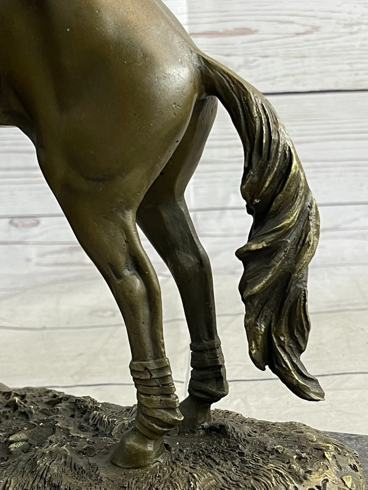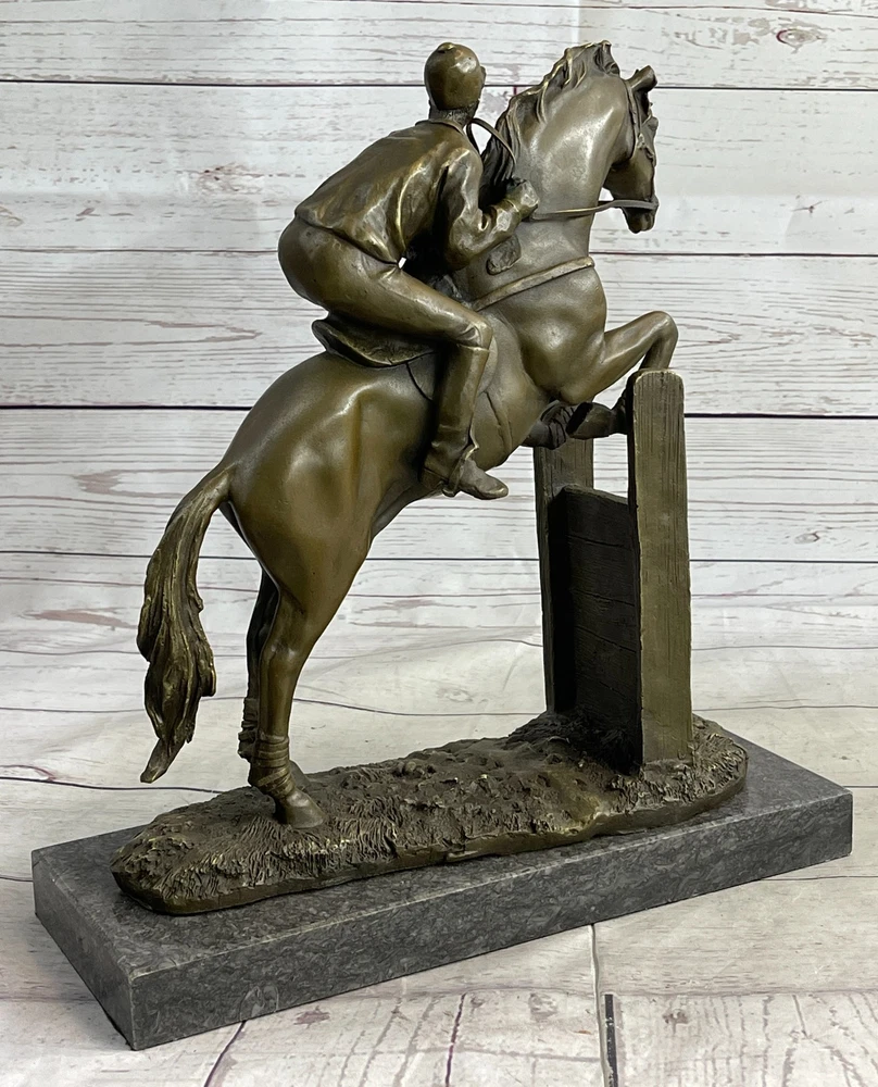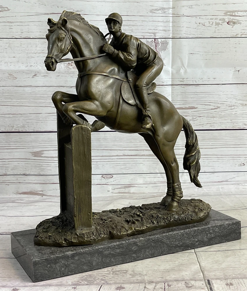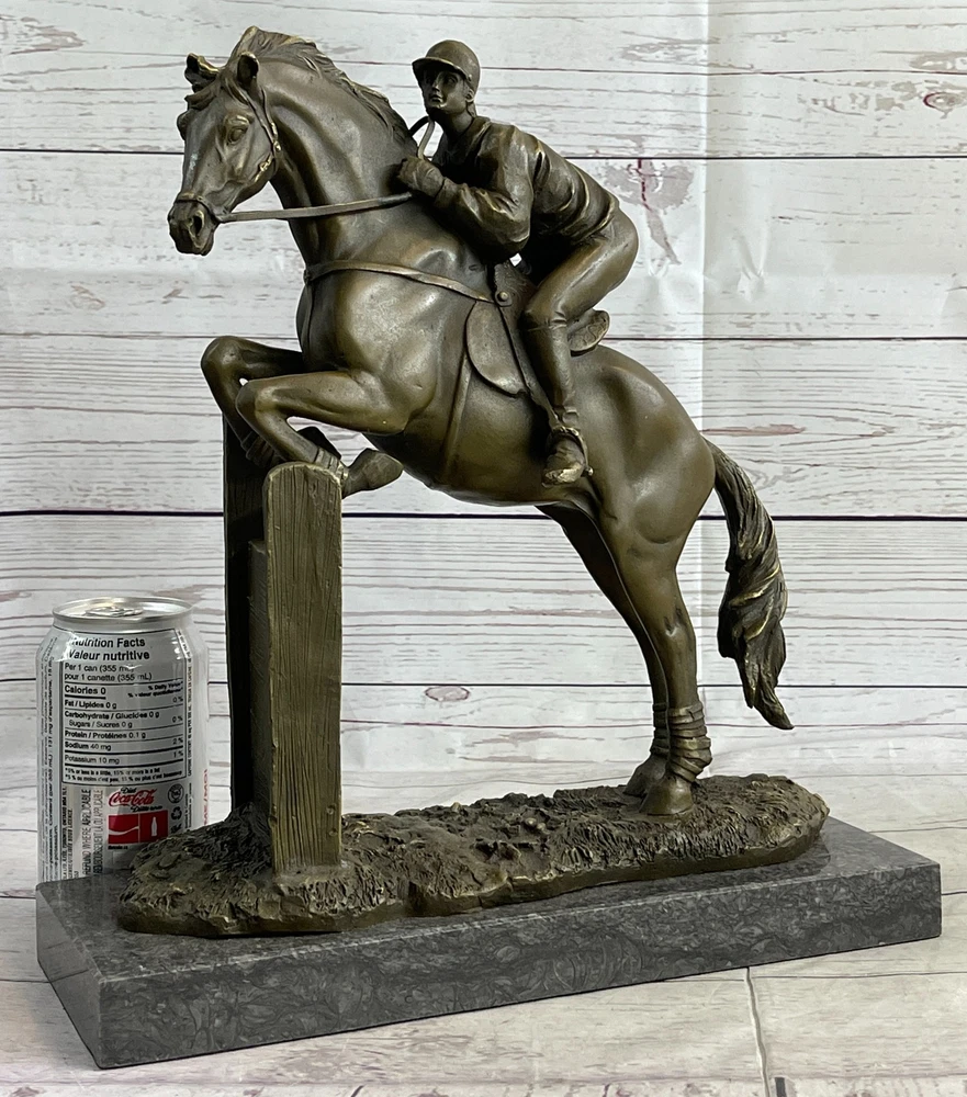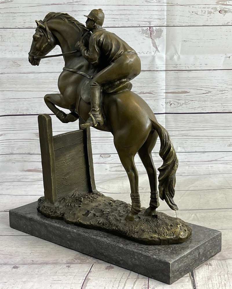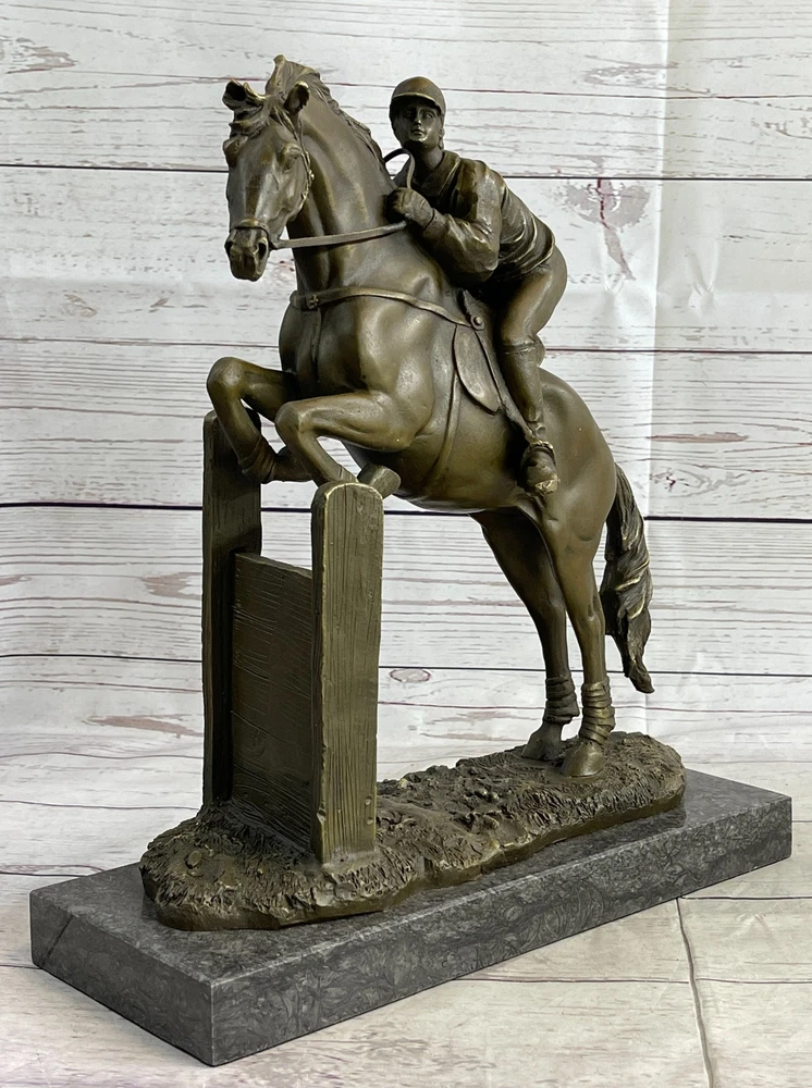 SIGNED ORIGINAL JOCKEY WITH HORSE BRONZE MARBLE SPORT HOT CAST SCULPTURE FIGURE SIGNED ORIGINAL JOCKEY WITH HORSE BRONZE MARBLE SPORT HOT CAST SCULPTURE FIGURE Condition : This sculpture is in a perfect condition. Bronze Dimensions with Marble Base: Height 13" X Width 12" Marble Dimensions:12" X 5" Height without base:12" Weight:17 LBS Inventory:53YRD11828935 Get ready for the ultimate race of your life with this magnificent bronze sculpture. Featuring a determined thoroughbred and its skilled jockey, they are prepared to leave their competitors in the dust. With full speed and power, the horse gallops on the grass track, its muscles defined and chest bulging with energy. The jockey, focused and resolute, urges the horse forward, kicking his heels and maintaining perfect balance in the stirrups. Every detail is intricately crafted, from the horse's flowing mane to the intense expression on the jockey's face. This action-packed piece is a true centerpiece that demands attention and is perfect for showcasing your love for horses and the thrill of the race. This remarkable bronze sculpture captures the spirit and determination of the horse and jockey as they strive for victory. The dynamic pose of the horse, with its tail flying in the wind, conveys the exhilarating speed and strength of the race. The finely sculpted muscles and the untouched grass track evoke a sense of realism and intensity. Mounted on a sleek black marble base, this sculpture stands as a symbol of triumph and achievement. It is a fantastic gift for any passionate horse lover or anyone who embodies the drive and determination to reach their goals. Handmade with precision using the ancient lost wax casting technique, this sculpture is a timeless piece of art that will be cherished for years to come. Experience the thrill of the race with this stunning bronze sculpture. Depicting a powerful thoroughbred and its dedicated jockey, this artwork encapsulates the intensity and excitement of the competition. With the horse in full stride, its muscles rippling and hooves pounding the grass track, it is clear that victory is the only option. The jockey, with a focused expression and heels firmly planted in the stirrups, guides the horse towards the finish line with unwavering determination. The attention to detail in this sculpture is remarkable, from the intricate texture of the horse's coat to the subtle expressions on the jockey's face. Crafted using the traditional lost wax method, this handmade bronze sculpture showcases the artist's skill and passion for capturing the essence of the race. Finished with a rich brown patina, it exudes a timeless elegance that will enhance any space. Mounted on a sleek black marble base, this sculpture is a true testament to the spirit of competition and makes a perfect gift for horse lovers and those who appreciate the thrill of the race. Hot Cast Original American Artist Fisher Jockey Bronze Sculpture Marble Base Art www.bronzhaus.com Video will open in a new window Using the eBay App? Paste link into a browser window: [isdntekvideo] Shipping Terms : Most of our items are shipped via USPS (United States Postal Service) mail or UPS. Most orders are shipped within 24-48 hours of purchase. Please be aware that not all items are available for USPS shipping due to size and weight. We do ship to Hawaii, Alaska, Canada, Puerto Rico, APO/AE, and U.S. Virgin Islands, however, an additional charge may be required. Please contact us before making any purchases in these areas. For Non-USA customers, you may be responsible for all duty, tax, brokerage fees that may be due upon delivery (shipping costs cover freight charges only). We also ship internationally. Please refer to the "Shipping and Handling" chart for the rates for each area. Payment : We accept just about any form of payment. PayPal, Master Card, Visa or American Express credit cards. Money orders, cashiers checks, and even personal or business checks. For governmental institutions, we will also accept a purchase order. Please understand that for personal or business checks we have to wait for the check to clear (usually 7 days) before shipping. Condition : New Detailed Hand Crafted Hot Cast Bronze Satisfaction Guaranteed. This is Stock Photo, Slight Color Variation!! Listing and template services provided by inkFrog