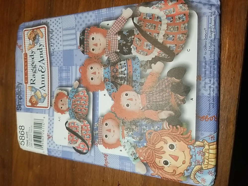 This is a Simplicity sewing pattern for making a 21" Raggedy Ann and Andy dolls, as well as a tote bag and purse. The pattern is uncut and originates from the United States. It is specifically designed for crafting doll clothing and accessories.