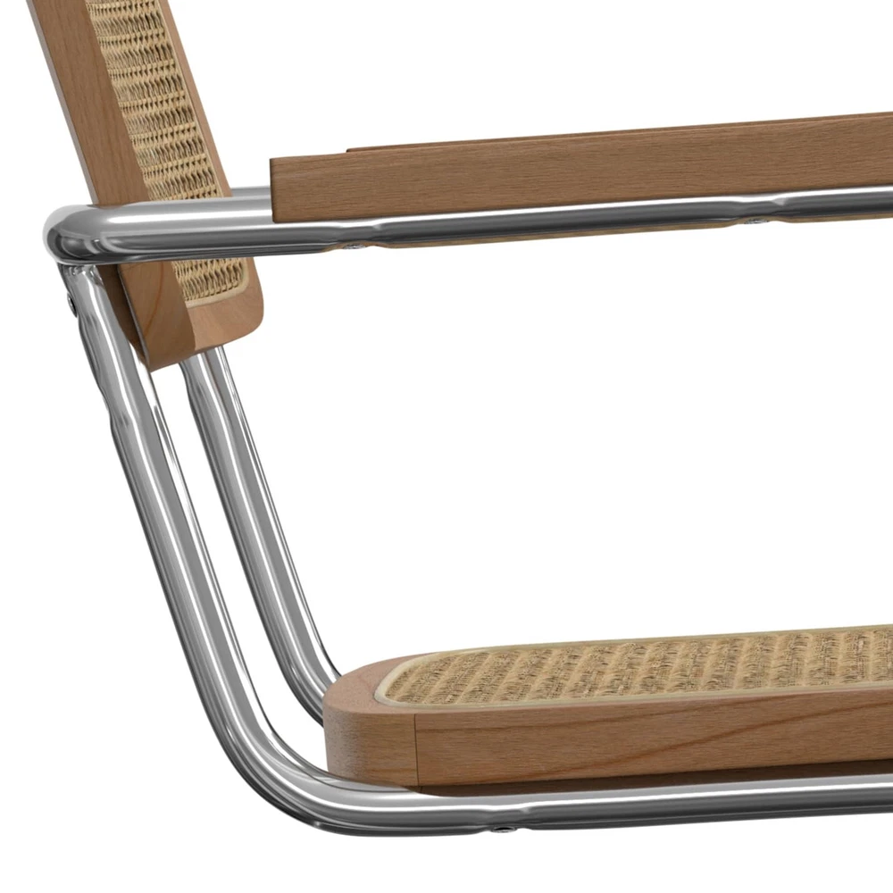 Bring mid-century modern elegance to your dining space with the Madalyn Dining Armchair Set. These handcrafted chairs blend natural beech wood frames with handwoven rattan seats and backrests, offering both style and comfort. The polished chrome cantilevered base adds a sleek, contemporary touch, while the curved arms provide ergonomic support for extended seating. Perfect for family meals or entertaining guests, these versatile chairs complement various decor styles, from minimalist to eclectic. Their durable construction and timeless design make them ideal for busy households looking to create a stylish yet functional dining area that can withstand daily use. Additionally, the natural materials used in the construction of these chairs ensure they are not only aesthetically pleasing but also environmentally friendly. The Madalyn Dining Armchair Set is a perfect blend of form and function, making it a valuable addition to any home. Whether you're hosting a dinner party or enjoying a quiet meal with family, these chairs will enhance your dining experience with their comfort and elegance. DIMENSIONS: 23.1" D x 19.1" W x 31.7" H Hand Constructed using solid wood, rattan, metal Seat and backrest are in a woven rattan in natural Multi-functional chair can be used in kitchen, dining room, office or sitting area Mid Century Modern styling includes a comfortable woven rattan seat and back, solid wood armrest and curved metal frame and base