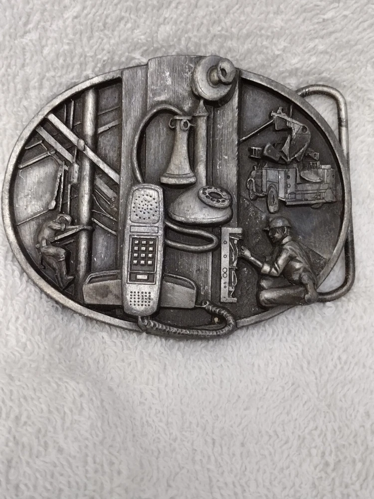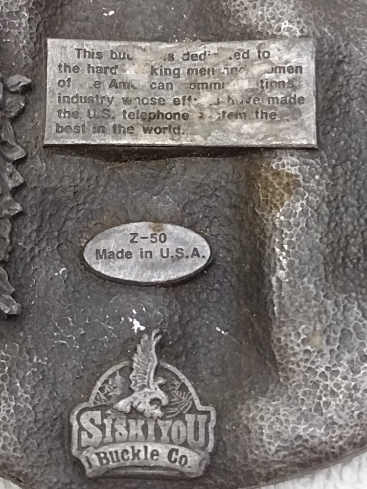 This vintage SISKIYOU Buckle Co., Inc. belt buckle is a unique addition to any collection. Made of pewter and featuring a telephone lineman theme, this belt buckle is a true gem for collectors. The buckle is accented with dimensions and fits a 1.5 inch belt. The buckle is perfect for men who appreciate vintage accessories and is a great way to add a touch of history to any outfit. Made in the United States, this belt buckle is a high-quality piece that is sure to impress.