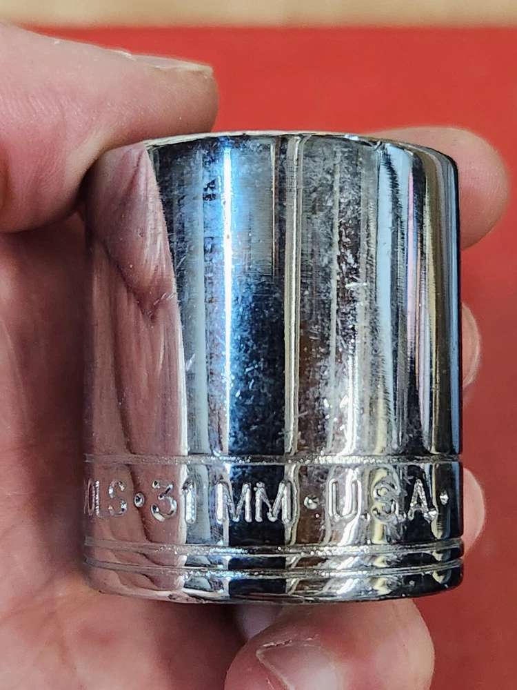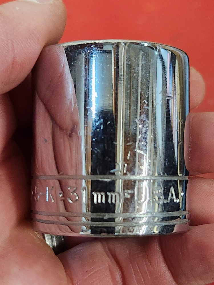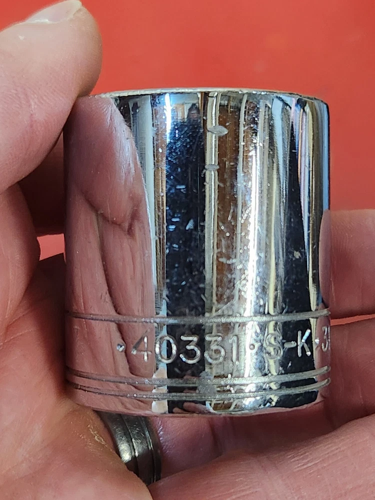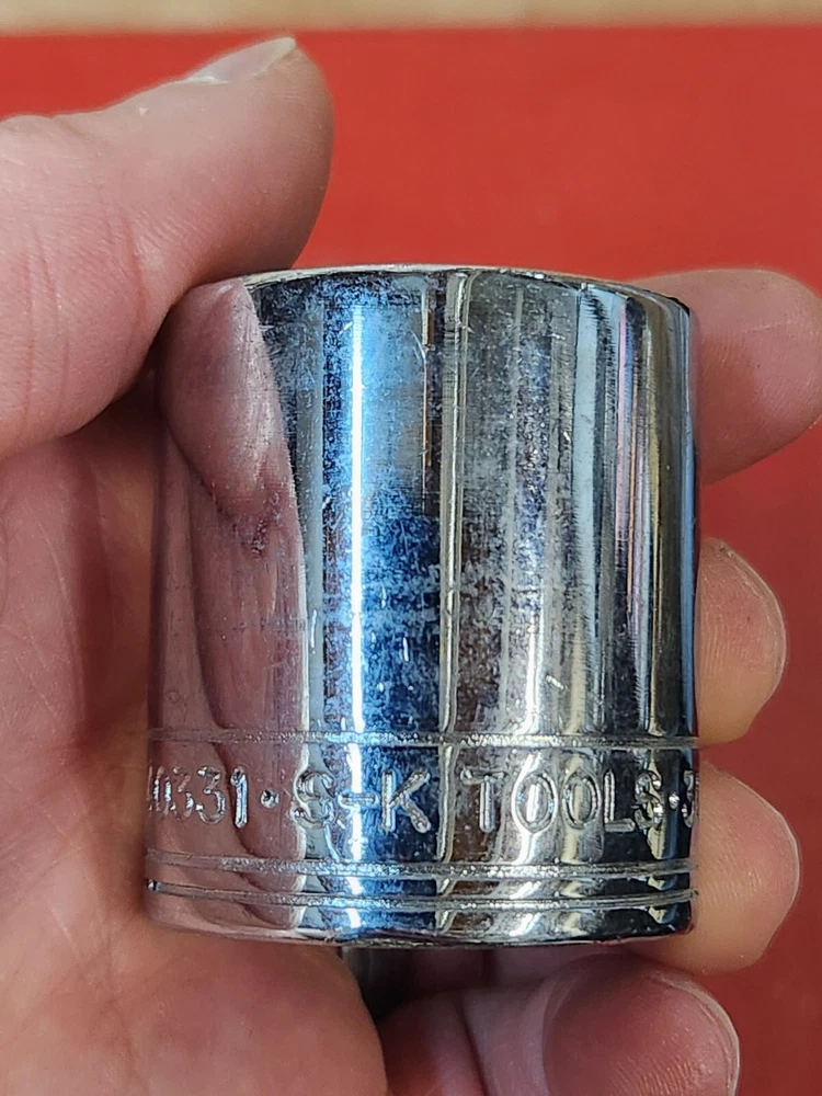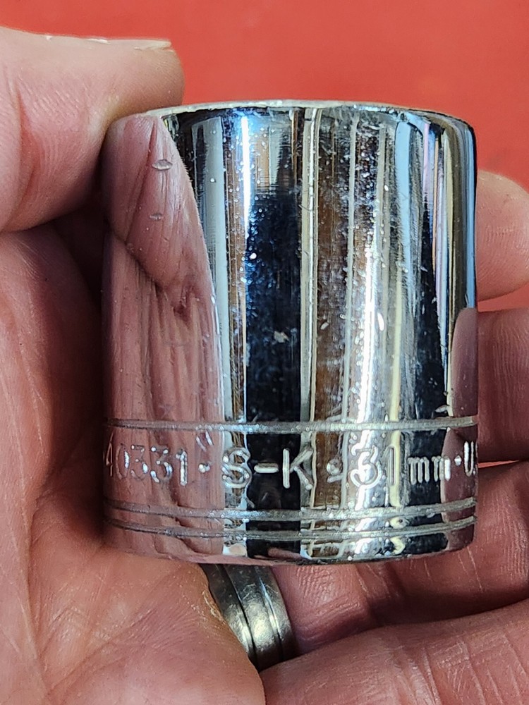 SK 1/2" Drive 31mm Shallow Socket 40331 12pt Many Styles NOS Vintage USA New old stock S-K Tools USA 1/2" drive 31mm sockets. They are all model 40331 but from different eras so I've offered the option to select the style you prefer, but if this doesn't matter than you can pick any one of them. Some of the same style may still have some slight variances. Have shelf wear including light scratches, light blemishes, small nicks, and other light signs of wear from long-term storage. The level of shelf wear varies but all are unused.