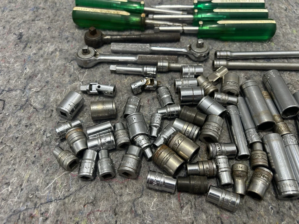 Storage unit find. Recycling items found in abandoned storage units at auction. Large lot of S-K Tools S-K Wayne USA 1/4” drive sockets, ratchets and drivers. Deep and shallow, 6 point and 12 point SAE and Metric. Please review all photos for condition of exact items included in this auction, items being sold as is as found. See my other auctions for more great vintage and rare tool finds.