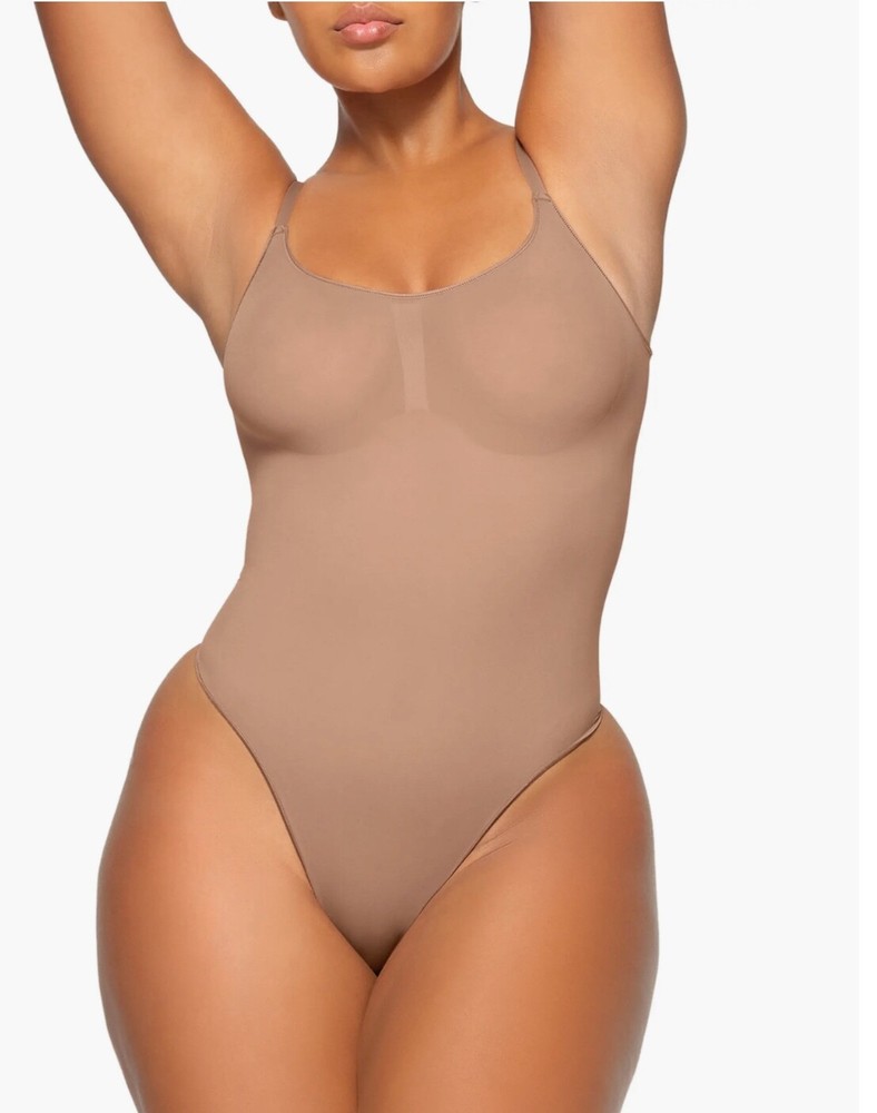 SKIMS Everyday Sculpt Bodysuit Thong in Sienna color, size XS. This one-piece shapewear has a solid pattern, wireless underwire, and is made of Nylon and ELASTANE blend fabric. The bodysuit provides compression in the back and abdomen areas. It is designed for women and features a thong style with a tank top. The brand is SKIMS, and the garment care instructions recommend hand wash only.