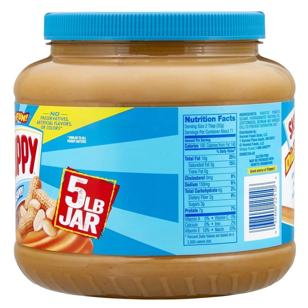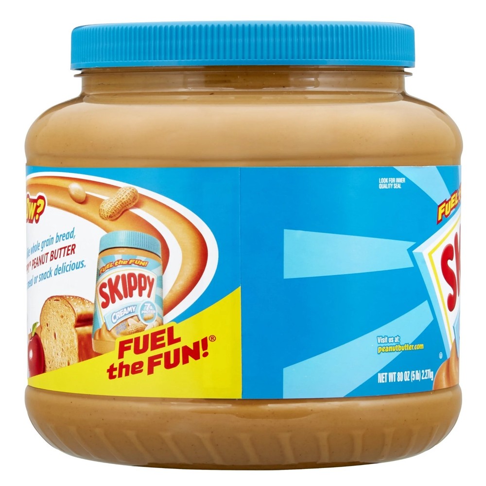 SKIPPY Peanut Butter, Creamy, 7 g Protein Per Serving, Shelf-Stable, 80 oz Plastic Jar Go to your SKIPPY place! For over 80 years, SKIPPY has been spreading smiles with its rich, creamy peanut butter. Made from real roasted peanuts and just four simple ingredients, this smooth classic delivers the perfect balance of sweet and savory peanut flavor. ✅ Classic Peanut Butter Taste – Smooth, creamy texture that’s perfect for sandwiches, snacking, or recipes ✅ Nutritious & Delicious – 7g of protein per serving to help restore energy and keep you feeling charged ✅ Simple Ingredients – Made with real roasted peanuts, no added preservatives, no oily mess ✅ Free From – Gluten free, tree nut free, no artificial flavors or colors, certified Kosher ✅ Trusted Brand – A pantry staple since 1933, loved for generations ✅ Family Size – One 80 oz plastic jar, ideal for meal prep, lunchboxes, and family snacking Spread it on whole grain bread, pair with fruit, or add to smoothies and desserts. Whether you prefer a hearty snack or a robust sandwich, SKIPPY Peanut Butter hits the spot every time. Contains: One 80 oz jar of SKIPPY Creamy Peanut Butter.