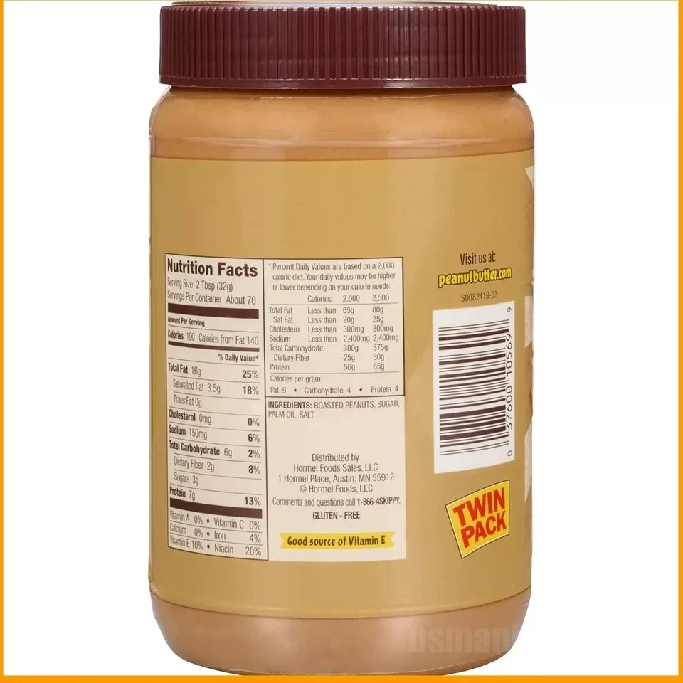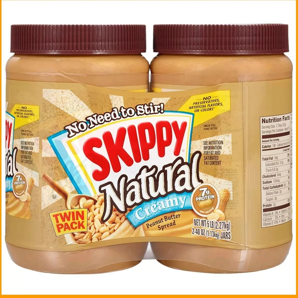 ABOUT THIS ITEM Two 5 pound jars of SKIPPY Natural Creamy Peanut Butter spread. Four simple ingredients with a sweet and savory peanut flavor and just seven grams of protein and zero grams trans-fat per serving When combined with nutritious foods like whole grain bread, fruit and milk, our peanut butter helps restore energy and leaves you feeling charged - nothing but great snacking with this creamy classic SKIPPY Natural Creamy Peanut Butter spread makes nutritious delicious. Real roasted peanuts with no added preservatives, free from artificial flavors or colors, certified Kosher, gluten free and tree nut free For snacking, sandwiches and more, it’s been a staple on grocery lists and in pantries for over 80 years Since 1933, the makers of SKIPPY Peanut Butter has been building trust and loyalty with peanut butter lovers. Try Chunky, Creamy, Reduced Fat, SUPER CHUNK spread and more.