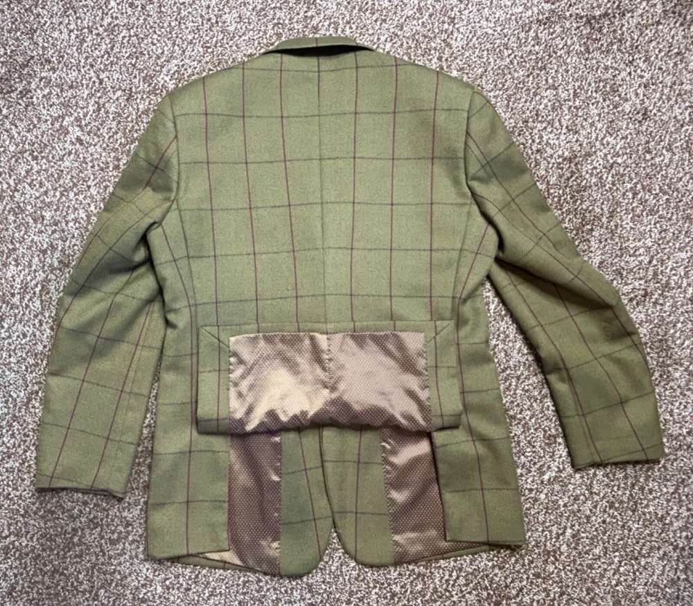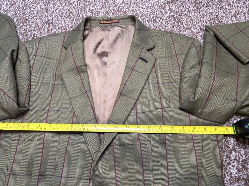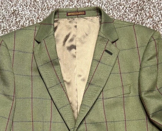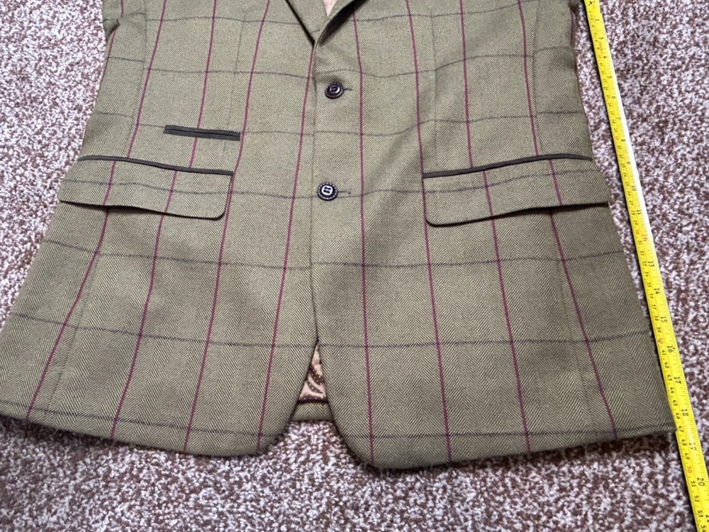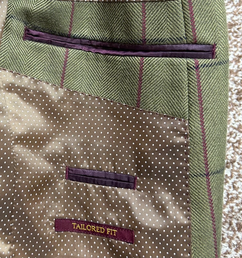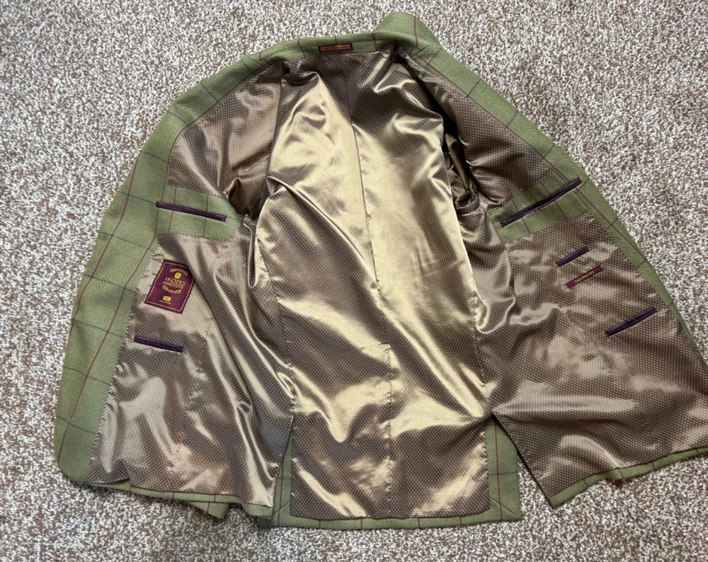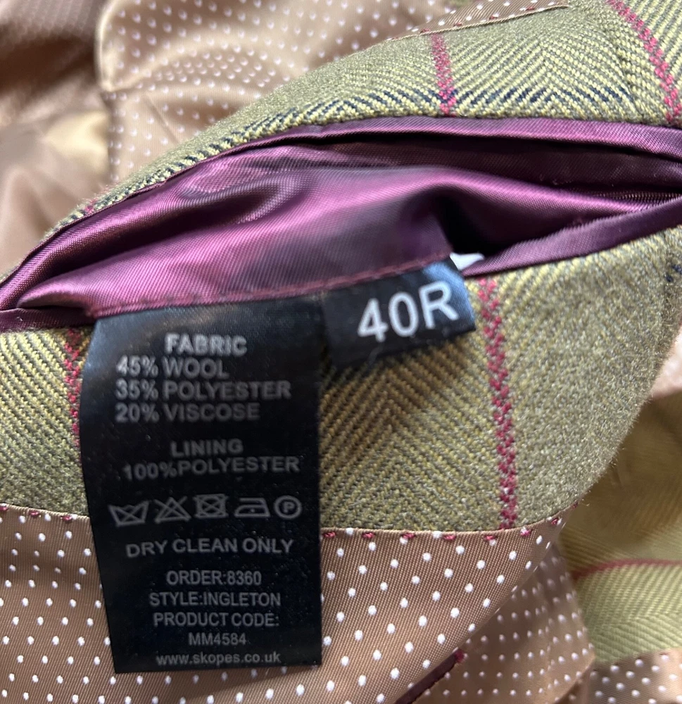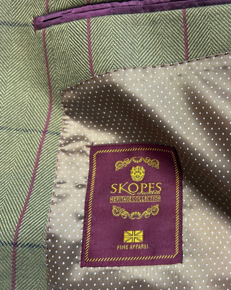Men's Green wool blend blazer from SKOPES Heritage Collection Tailored Fit In great condition Single-breasted, 2 button fastening Fully lined Front slit pockets with flaps Material: 45% wool 35% polyester 20% viscose Lining: 100% polyester Label size: UK Chest 40" Garment measures: Pit to pit: 21.5" Pit to hem: 18.5" Neck to hem: 29.5" Pit to cuff: 17" Stock ref: NP 2614 /03034 28114