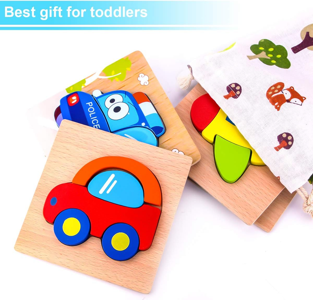 MOM'S CHOICE - Toddlers safe always come first. These vehicles wooden puzzles are made of high-quality environmental wood. Smooth edge keeps your 1 2 3 years old boys and girls play safety. LEARNING THROUGH PLAYING - 4 packs well-selected cute vehicles: steamer, airplane, car and police car not only help your kids aged 1 2 3 to learn vehicles while playing, but also these brain building puzzles help improve your boys and girls' create concentration and solve puzzles capacities. Greatly encourage the development of your toddler's hand-eye coordination and attention span. ATTRACTIVE COLOR AND PATTERN - Beautiful bright vibrant colors and cute vehicle shapes are designed for enriching children’s capacities of learning colors - encourage sensory stimulation and brain development. KID'S SIZE - Each puzzle is 5.8 x 5.8 x 0.6 in. Puzzle pieces thick enough for your kids to pick and place easily which will fit nicely into little hands. Also, these toddler puzzles are safe for children, your baby can't swallow them as it is big enough. PERFECT BOYS AND GIRLS GIFT - The 4 vehicle wooden toddler puzzles packed compactly in sturdy cute carrying pouch bag for puzzle pieces storage. And also wrapped in a sturdy gorgeous SKYFIELD customized gift box. Beautiful present ever. Perfect gift toys for toddlers aged 1 2 3. Toddlers can play the puzzles at home indoor or outdoor activity with parents or friends. Product Description SKYFIELD Wooden Toddler Puzzles Series, Best Shapes & Colors & Vehicles Learner: Let your little baby marvel over the pretty shapes and bright colors in these vehicle-patterned puzzles. The pack of four includes shapes to help them fill in the corresponding puzzle and build a car, ship, plane or police car. It’s not only an enjoyable way for your little one to pass the time, but also great for helping with hand-eye coordination, sensory stimulation, and brain development. SKYFIELD Developmental Montessori Wooden Vehicle Puzzle Toys, Your Ideal Christmas Gift /Birthday Gift for Boys and Girls 1 2 3 Years Old. Learning Skill Every well-built vehicles puzzles is cute and bright vivid color. Bringing pleasure to your kids while playing. Inspire children to recognize vehicles, shapes and colors. Improve your boys and girls' create concentration and solve puzzles capacities. Which will greatly encourage the development of your toddler's hand-eye coordination and attention span. Social Intelligence Your kids can play these toddler vehicles puzzles with their friends or parents at home, on travel or any other playing place. It’s an ideal 1 2 3 years old children's gifts for your beloved boys and girls to learn about sharing with others and develop communication skills, as well as develop parent-child interaction and tighten the connection of each other. Eco-Wood & Polished Smooth Edge The well-polished wood surface with round edge are more secure as toys for baby boys and girls’ little hands to explore. Each colorful piece fits comfortably in little hands. Cute Drawstring Gift Bag Come with Cute Drawstring Bag for Puzzle Blocks management. No matter play the puzzles at home or for outdoor activities. You will never lose the puzzle blocks again. Gift Box Ready Come with SKYFIELD customized gift box. Making it the best Christmas gift / birthday gift for your baby boys and girls 1 2 3 years old.