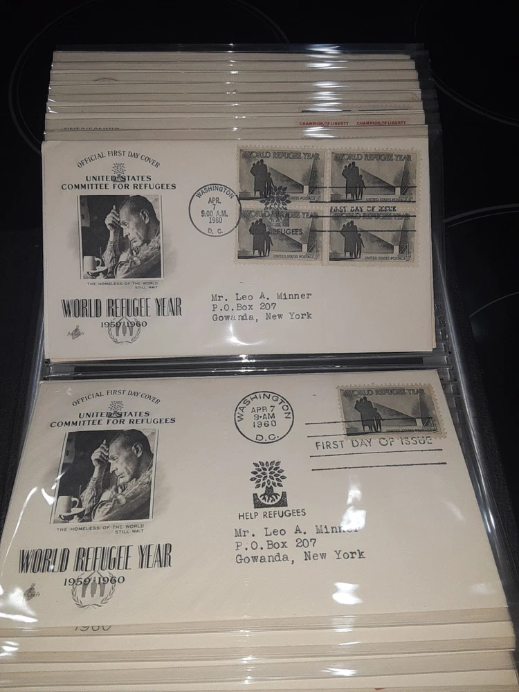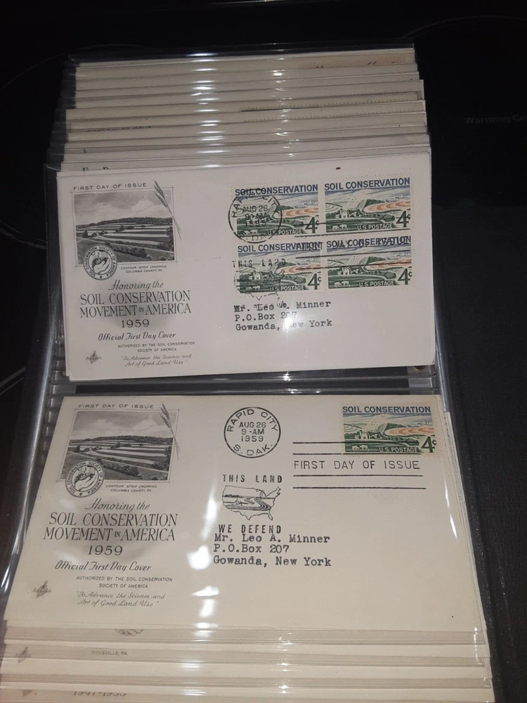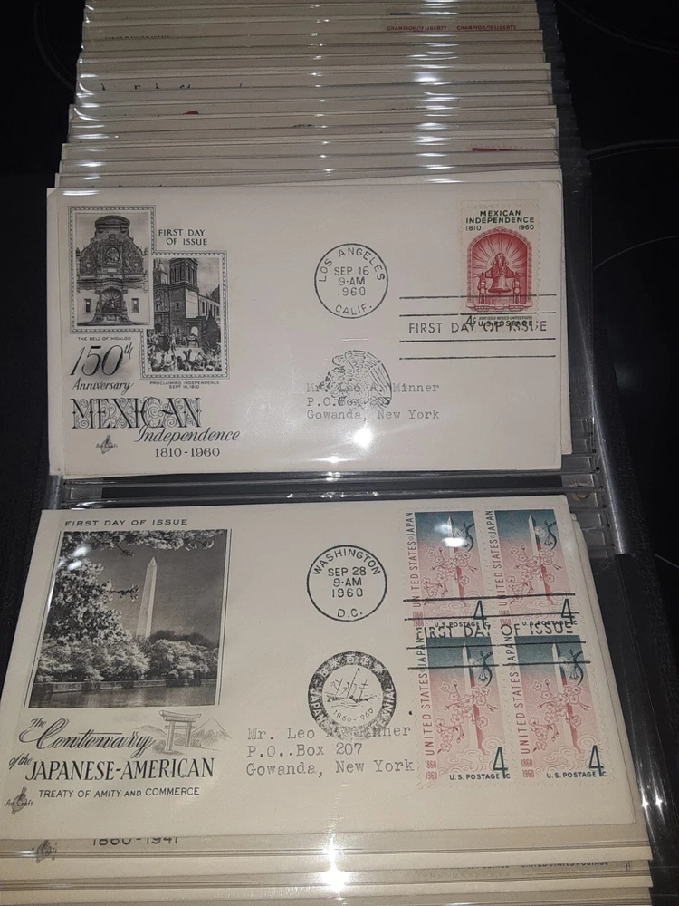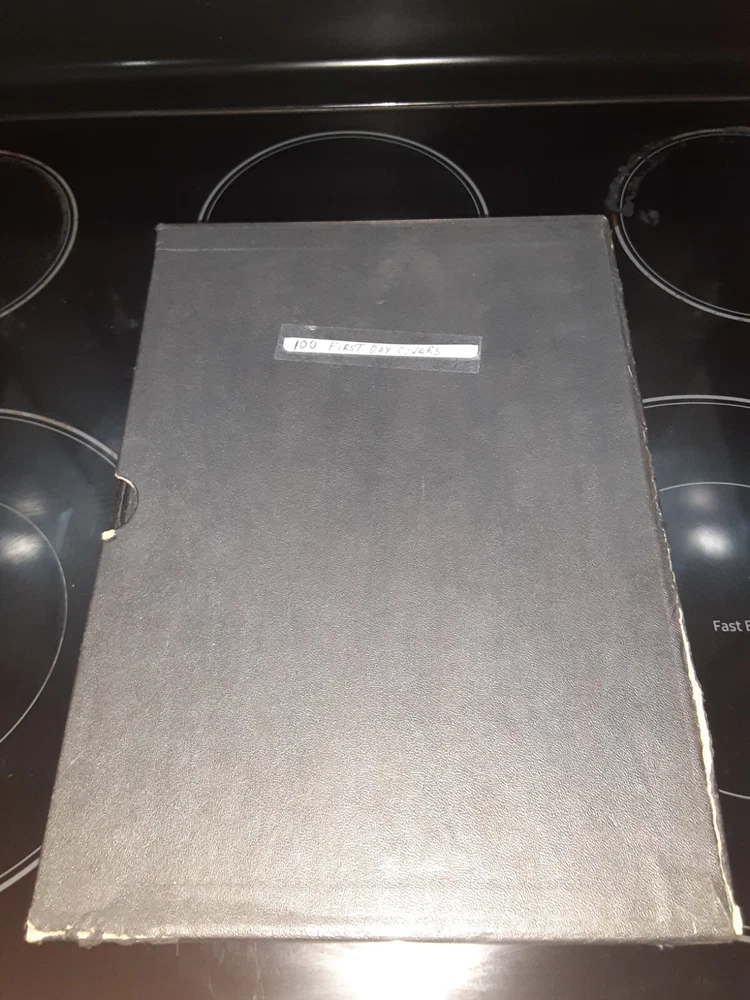 First Day Cover Album is in good condition. Covers are from late 50's and early 60's. Album has a hard cover that it slips into. Album measures Several airmail covers. Album measures 8 x 11.25 x 2.5". 100 covers.