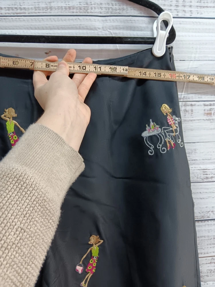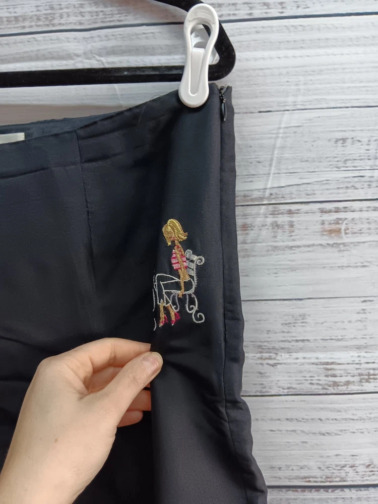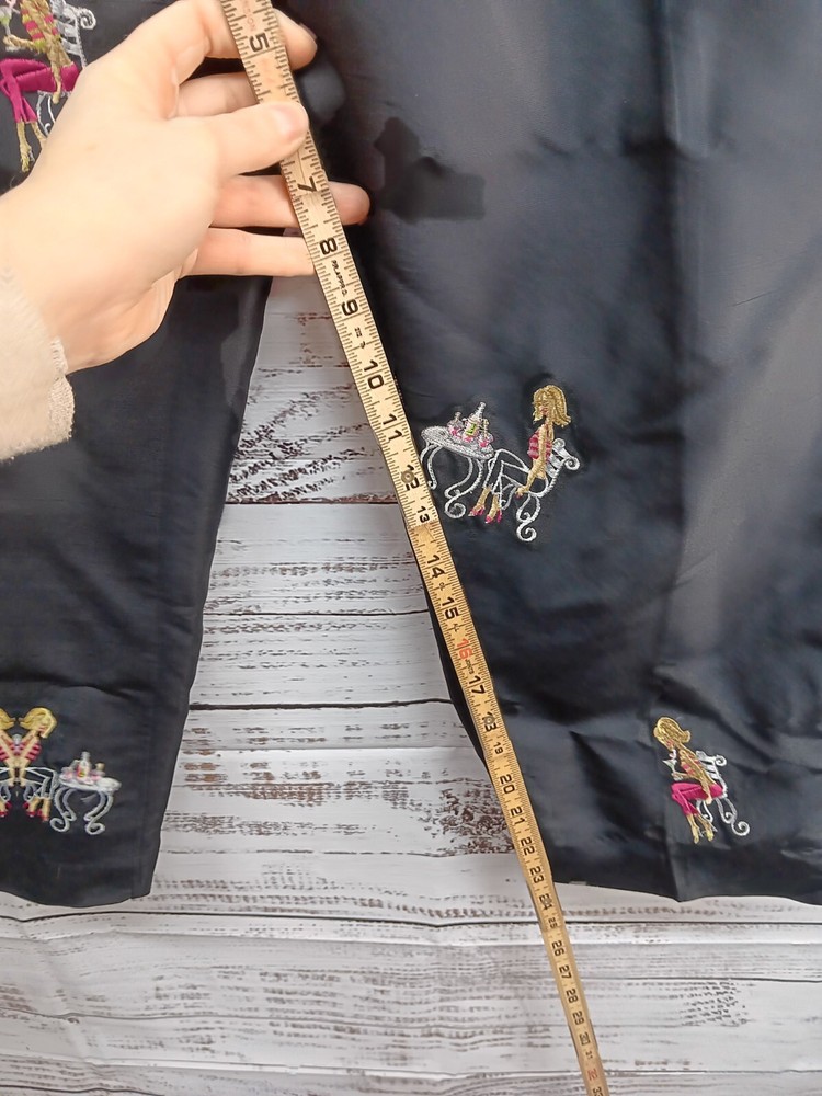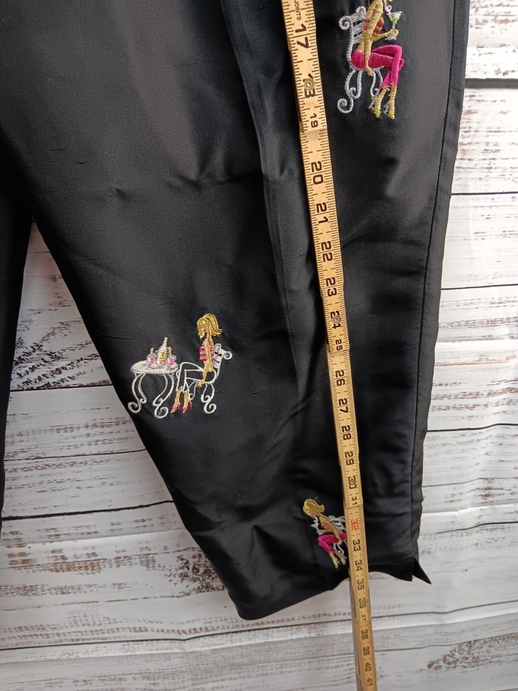 These S.L.B. ankle pants are made for women in size 10, featuring a unique and stylish embroidered design on 100% silk fabric in a classic black color. The pants have a polka dot pattern and are lined for added comfort. With a flat front and a regular fit, these pants are ideal for various occasions including travel, parties, casual wear, and business settings. Perfect for all seasons, these ankle pants offer a bohemian and fun style to elevate any outfit.