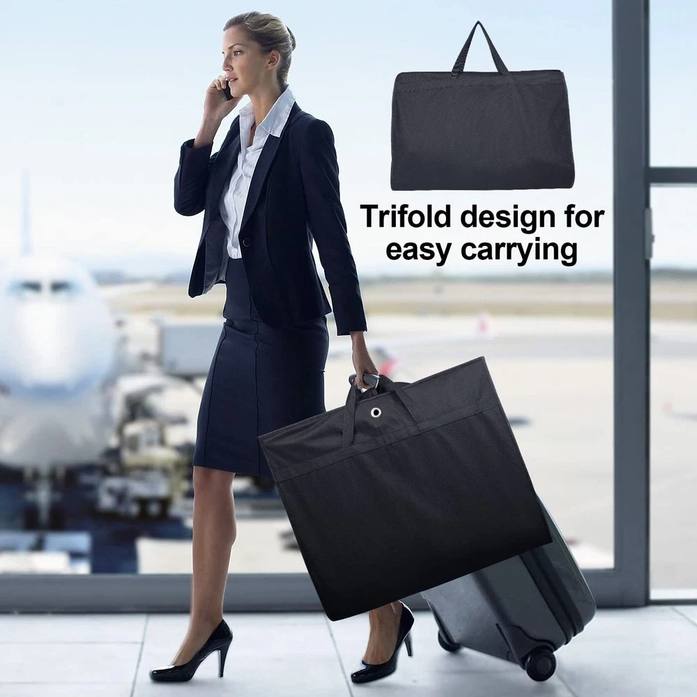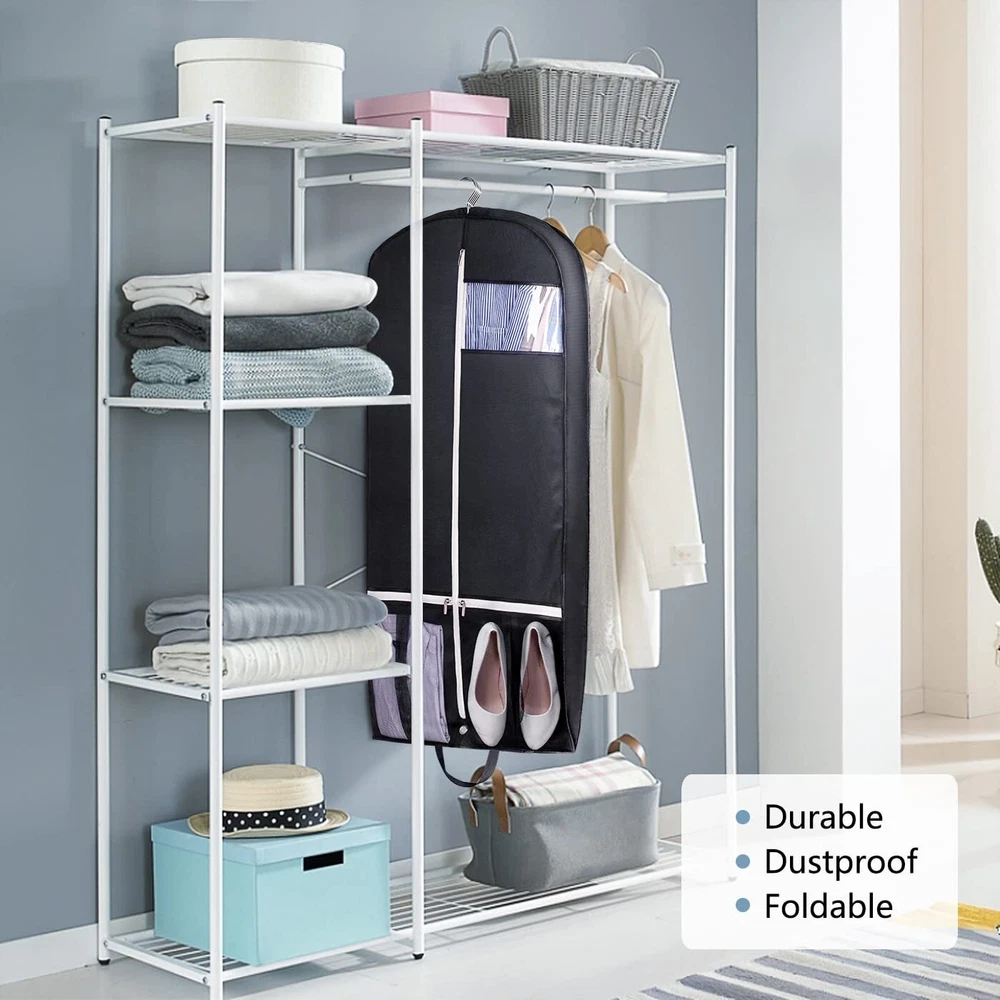 Large Capacity: Dress garment bag comes with 4" gussets, suit for holding 4 men suits or 6 dresses inside there's still room for more, provide more space than others bags and helps keep clothes wrinkle-free. Easy for Travel: Dress cover bag has two handles at both ends, so it can be trifolded and easy to carry without dragging your garments on the ground, suit for travel and bussiness trip. Extra Space: Two mesh pockets provide more space to store shoes, shirts, tie, socks, underwear, hanging clothes bag for travel helps save your time when search the matched accessories. Easy to Access: There is a clear plastic window makes it a breeze to find the clothing you want without having to zip open the garment bags for hanging clothes travel, zipper works smoothly without snags and the small hole at the top of the bag comes in handy. Versatile Usage: Garmet traveler bag measured by 60" x 24" x 4", great size for dress, gown, garment, coat, sweaters, outfit, shirts, jackets, tuxedos and military uniform, not only for travel but suitable for home storage.