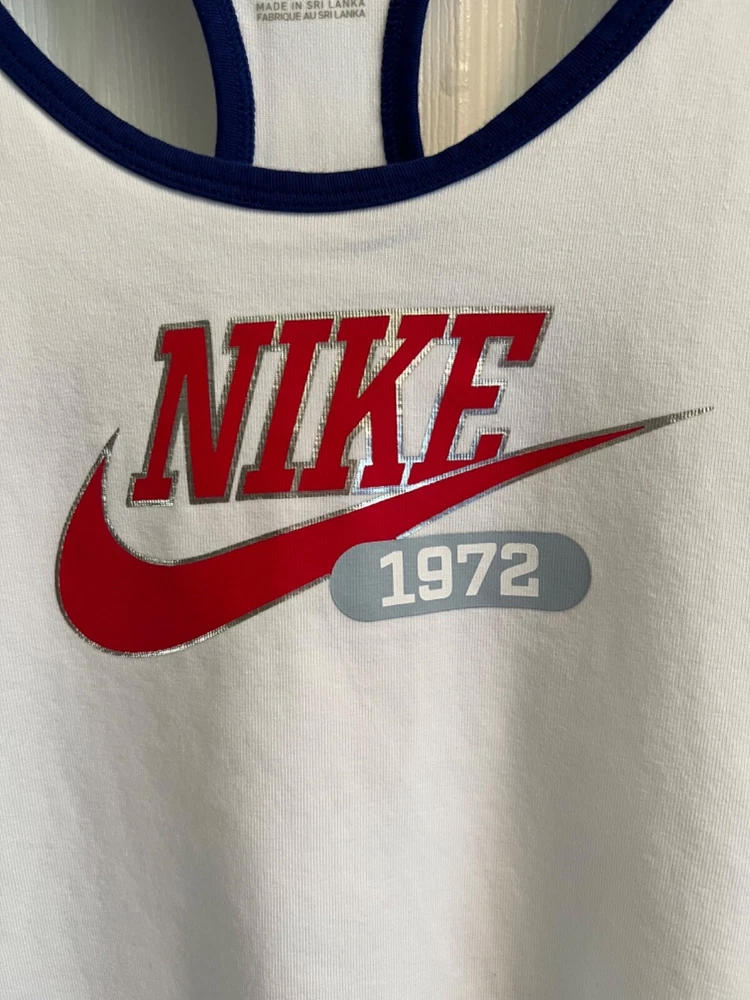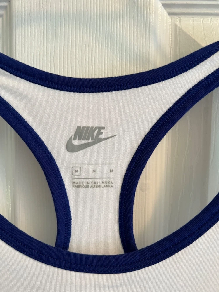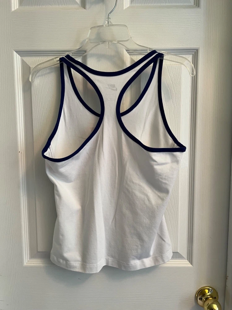Sleeveless Shirt/Tank DESCRIPTION : BRAND : Nike SIZE : Medium COLOR : White with Blue Trim DESCRIPTION : Sleeveless - shirt / tank CONDITION : Excellent used condition. PAYMENT : Payment is due within 3 days of the end of the auction. SHIPPING : Shipping is via US Post Office ONLY. RETURN POLICY : I list items to the best of my ability and try to describe each item as best as possible. Most of the items I sell are purchased at thrift shops/garage sales/etc, therefore I do not know the history to each item. Unless stated new, they are pre-owned items. I cannot guarantee items I sell are from smoke/pet free homes originally. My home is smoke free, however, I do have pets. Because computer monitors and phone screens vary in their ability to display color, color of the actual item may vary slightly. Color is not an acceptable reason for return. Items may be returned for a refund of bid price only (I will not refund any postage). Refunds will be issued once I receive the item back in the same condition as it left. If you have any problems please email me before leaving feedback. Please check out my other items - I will gladly combine shipping! Email me if you have any questions.