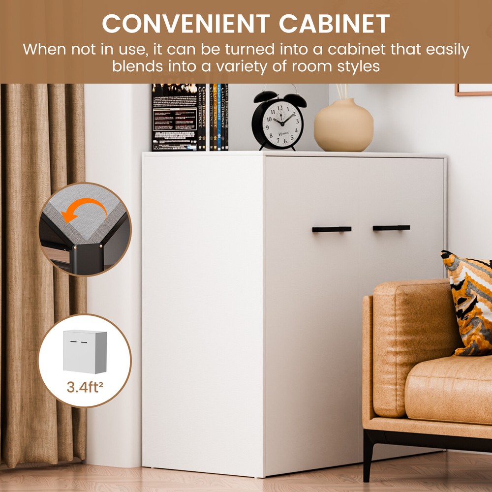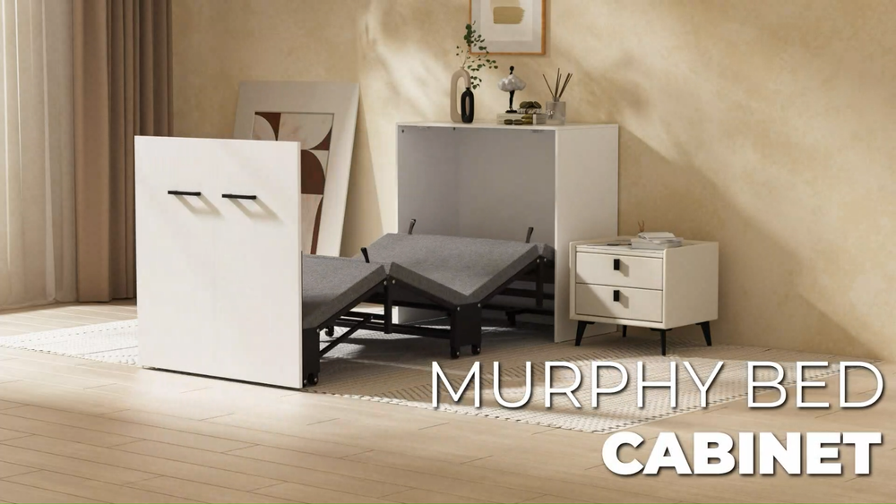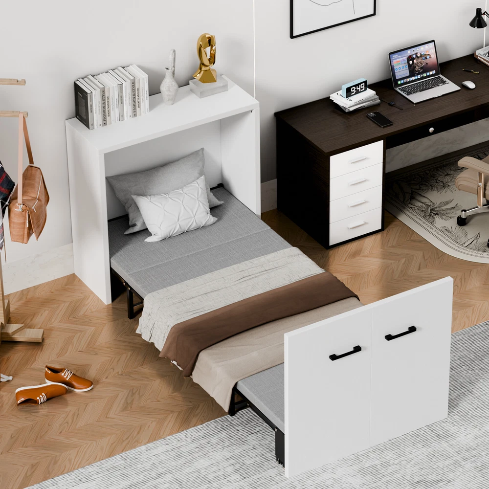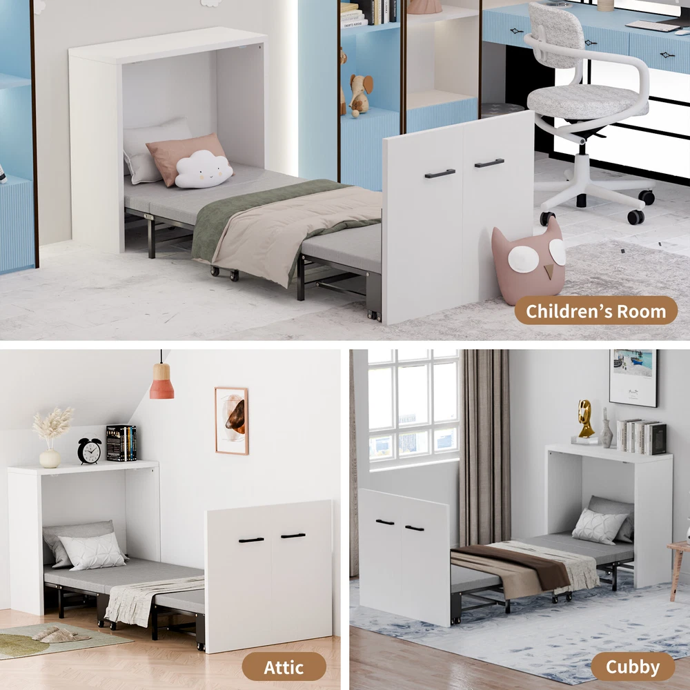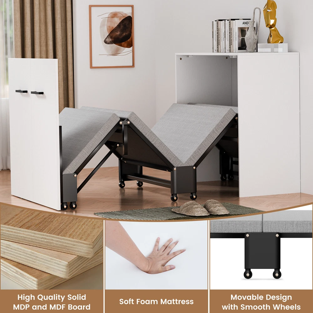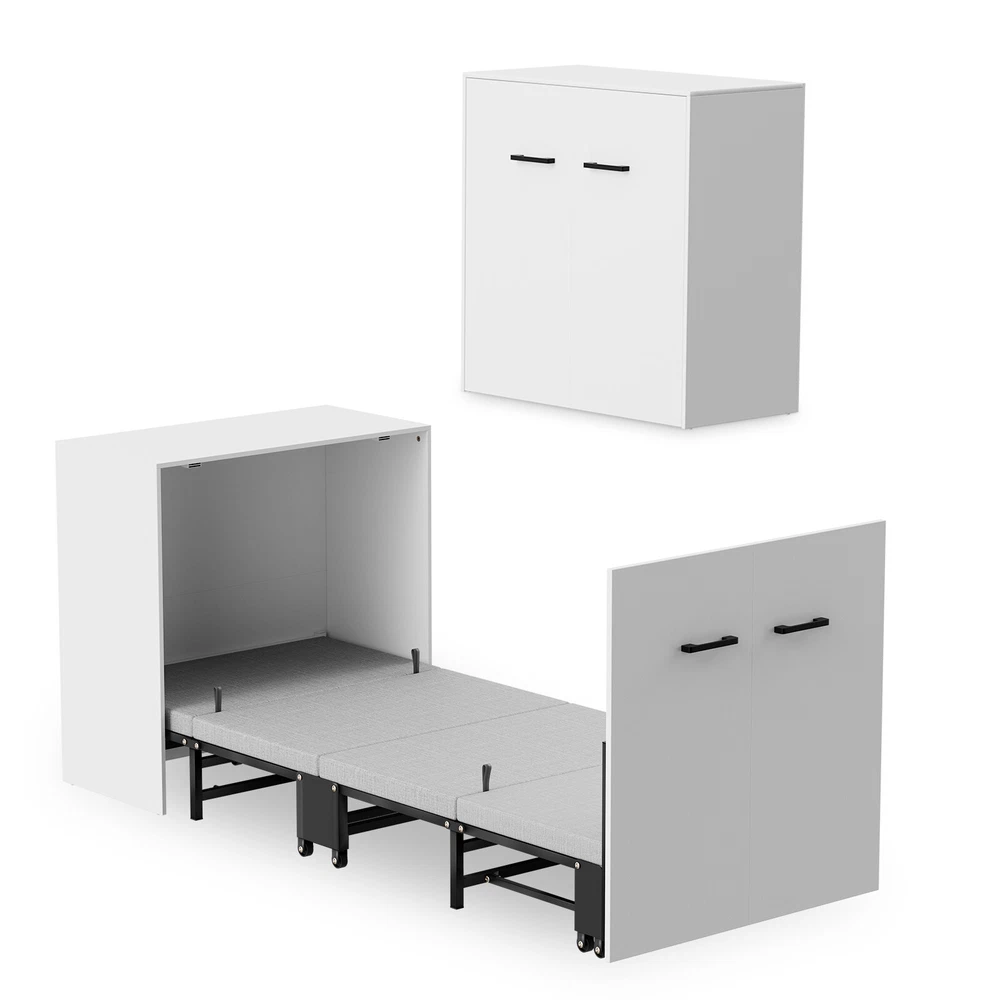 Multifunctional Cabinet Bed : Transform your living space with our innovative Murphy bed that seamlessly converts between a stylish cabinet and a comfortable rollaway bed. When not in use, it ensuring your home or office remains tidy and organized. Upon opening, it reveals a sleeping area designed to save you precious floor space Foam Mattress Included: Experience the perfect blend of comfort and support with our included foam mattress, boasting a thickness of 1.5 inches . it's an essential component of your versatile cabinet bed.Please note: The fold up bed dimensions are 74.8x29.1 inches .For those seeking additional cushioning, kindly consider the mattress size before making any adjustments Sturdy & Durable Design : Engineered with a robust four-fold mechanism and reinforced with an integral steel frame, our folding bed is built to last, capable of supporting up to 650 pounds . Whether you're lounging or sleeping, safety and stability are guaranteed. Smooth-rolling, high-quality wheels facilitate effortless maneuverability, making it a breeze to set up and store away Effortless Quick-Fold System : Embrace convenience at its finest with our tool-free folding system.In moments, transform your cabinet into a cozy bed with a simple pull. Packing it back up is equally as straightforward, ensuring your living area returns to its neat state without hassle Versatile & Space-Saving: Ideal for modern living, our compact cabinet bed measures just 31.5x11.7x31.5 inches when folded , making it an excellent fit for various settings. Use it in your office for quick breaks, stash it in the attic or a small room as a temporary bed solution, or welcome unexpected guests with elegance