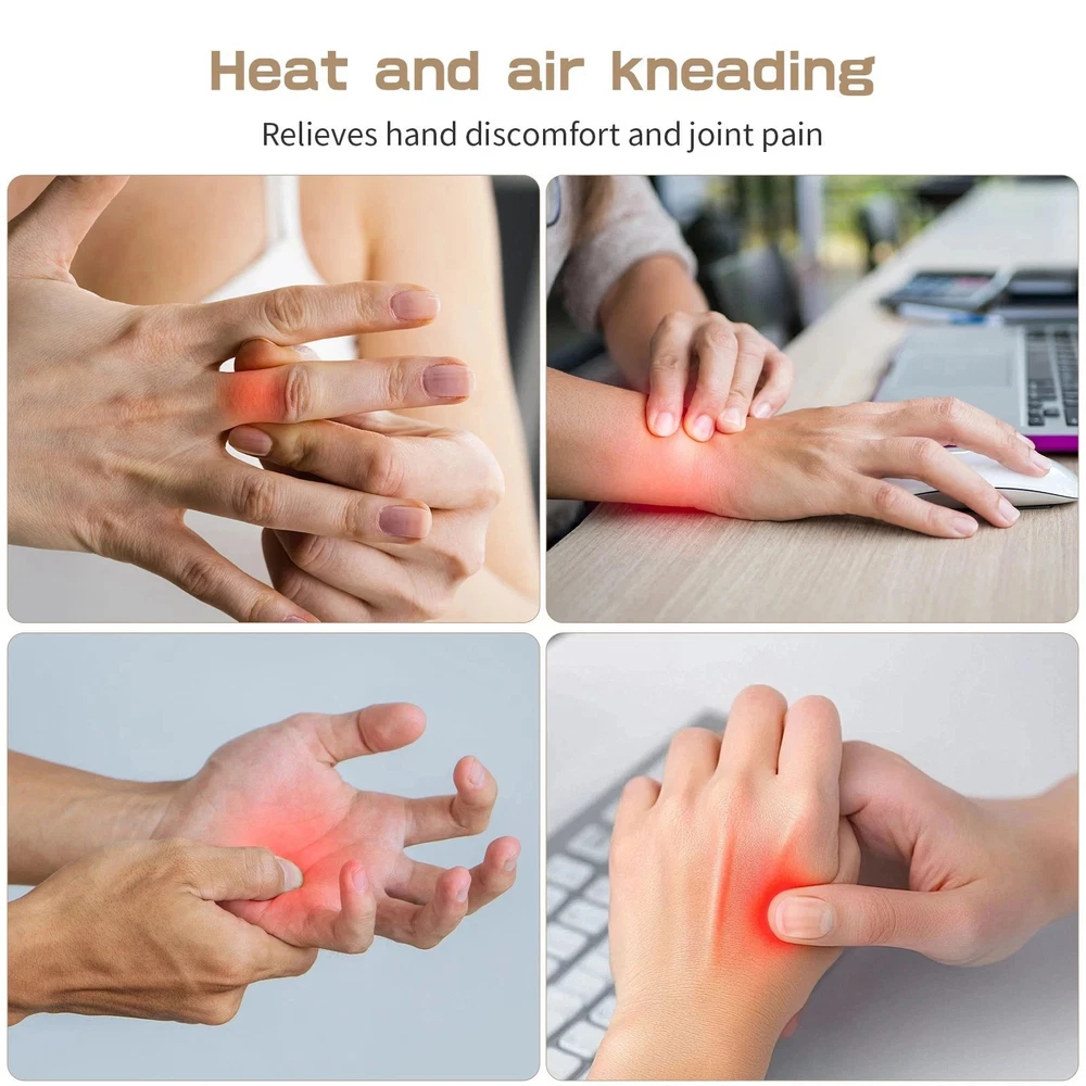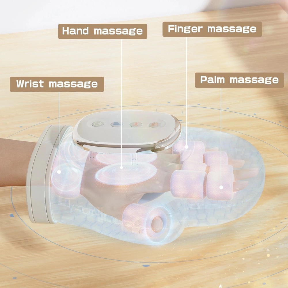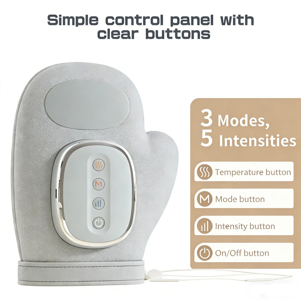 About this item Multiple Massage Modes : This hand massager with heat and compression offers 3 unique modes (Wellness, Comfort, Vitality) and 5 intensity levels, allowing you to customize the massage to your specific needs. The adjustable temperature settings (113°F, 122°F, 131°F, 140°F) combined with sequential compression and heat function simulate kneading and rolling actions to ease tension in fingers, palms, and wrists.ensuring all-day comfort and relaxation Ergonomic Design for Full Comfort : The hand massager is specifically designed to relieve finger, palm, and wrist fatigue. It features a five finger separation design that can completely wrap around the fingers and palm, providing a more suitable massage experience for both hands through 3D wave pressing. The massager is made of ABS fireproof material and TPU airbags,which are safe and durable. The ergonomic TPU airbag is made of high-quality PU leather and PE metal frame. Rechargeable and Portable : Say goodbye to frequent charging,our hand massager equipped with a 2000 mAh battery, Type-C quick charge interface, It only needs to be charged once a week, Perfect for consistent daily use at home, in the office, or while traveling. 2025 Best Gift Choice : Looking for some unique and practical gifts? The sleek, modern design with shiatsu technology makes this massager a perfect addition to any home or office. Birthday Gifts for Women, Thoughtful gifts for parents, spouses, or anyone suffering from hand fatigue or stiffness. Customer service : The hand massager with heat and compression is designed to fit both left and right hands, making it a great gift for your loved, If you have any questions during use, please contact our customer service, we will give you help and service Specifications: Name: Hot Compress Hand Massager Material: ABS+PU Color: Grey Size: 25×18.5cm/9.84×7.28inch Massager Mode: Hot Compress, Air Pressure Stage: 5 Levels Force Temperature: 45℃-50℃-55℃-60℃ Power: 10W Battery Capacity: 2000mAh Charging Time: 1.5hrs Working Time: 100~120mins Charging Port: USB-C Package Includeds: 1×Hand Massager 1×USB Cable 1×User Manual Note: 1. Please allow 0~1 inch error due to manual measurement. Thanks for your understanding. 2. Monitors are not calibrated same, item color displayed in photos may be showing slightly different from the real object. Please take the real one as standard.