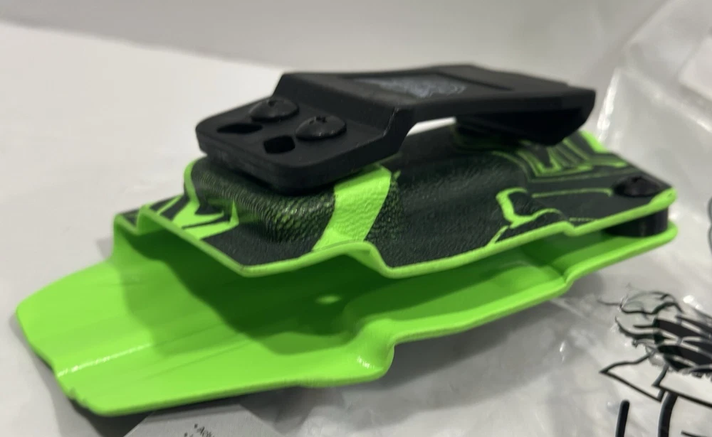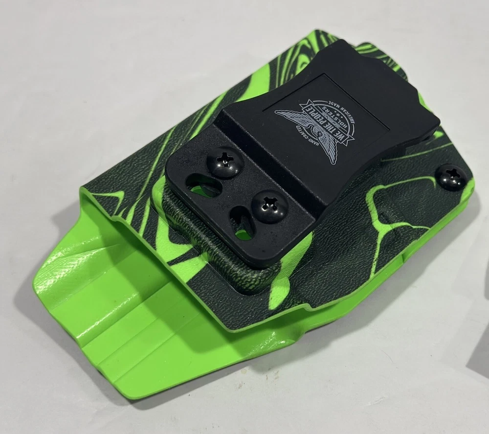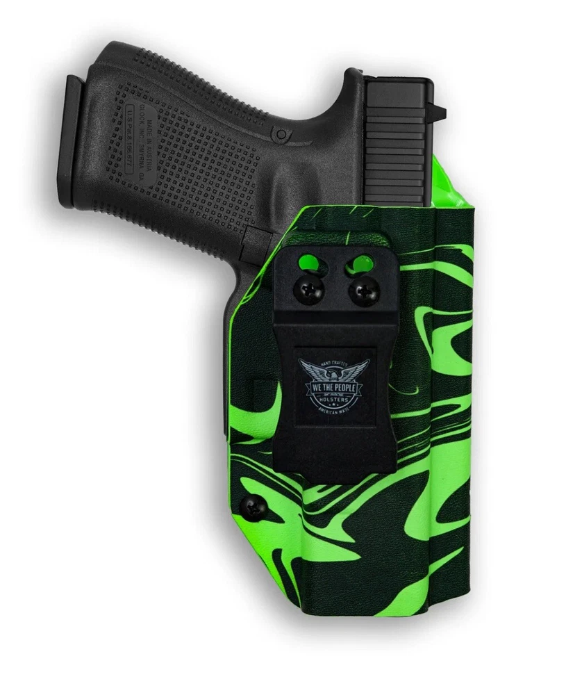 SMITH & WESSON M&P BODYGUARD 380 IWB HOLSTER - Color /Green Ink Swirl This Smith & Wesson M&P Bodyguard 380 holster is a durable, dependable, and form-fitting piece, offering effective concealment and quick, reliable access. Makes it easier to draw and re-holster the gun while keeping your eye on the possible threat or target instead of precious seconds spent searching for the holster. It will also make accidentally re-holstering your gun along with part of your shirt less of an issue Made in the USA Lifetime guarantee Inside the waistband (holster only) Fits a 1.5 inch belt