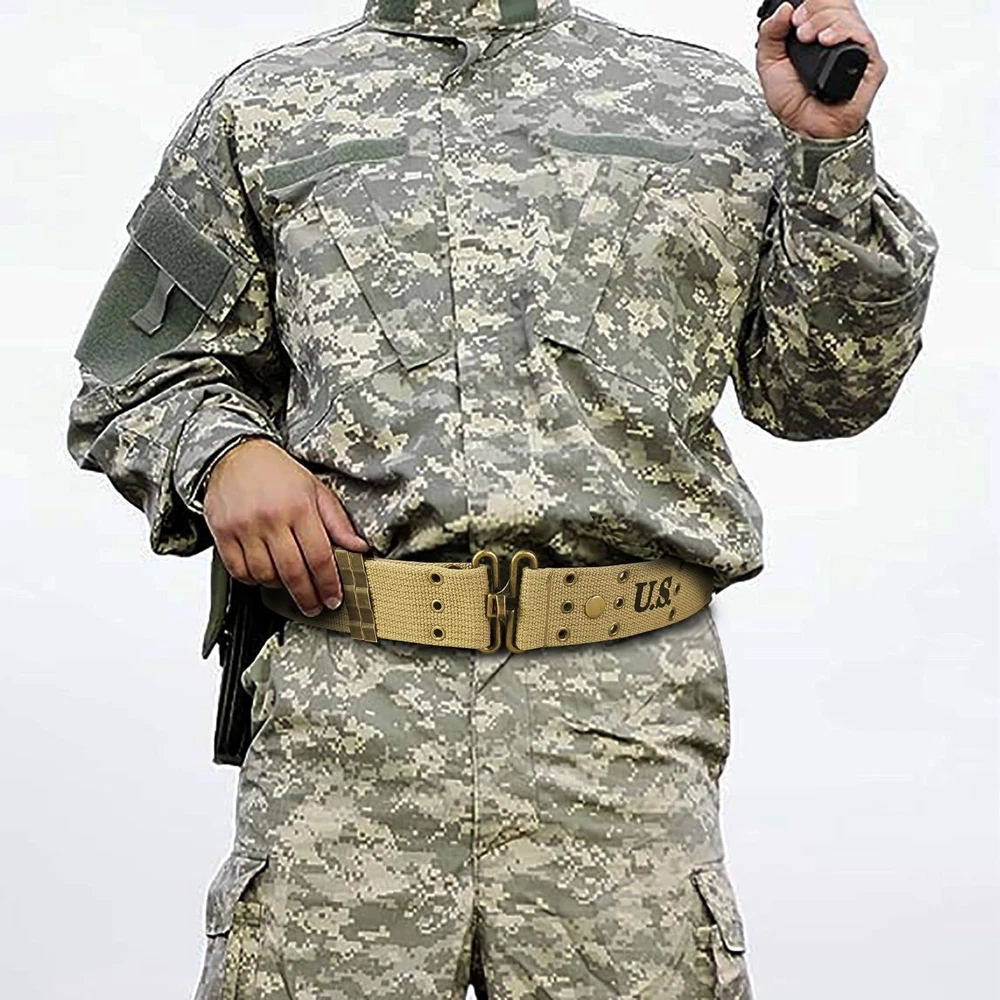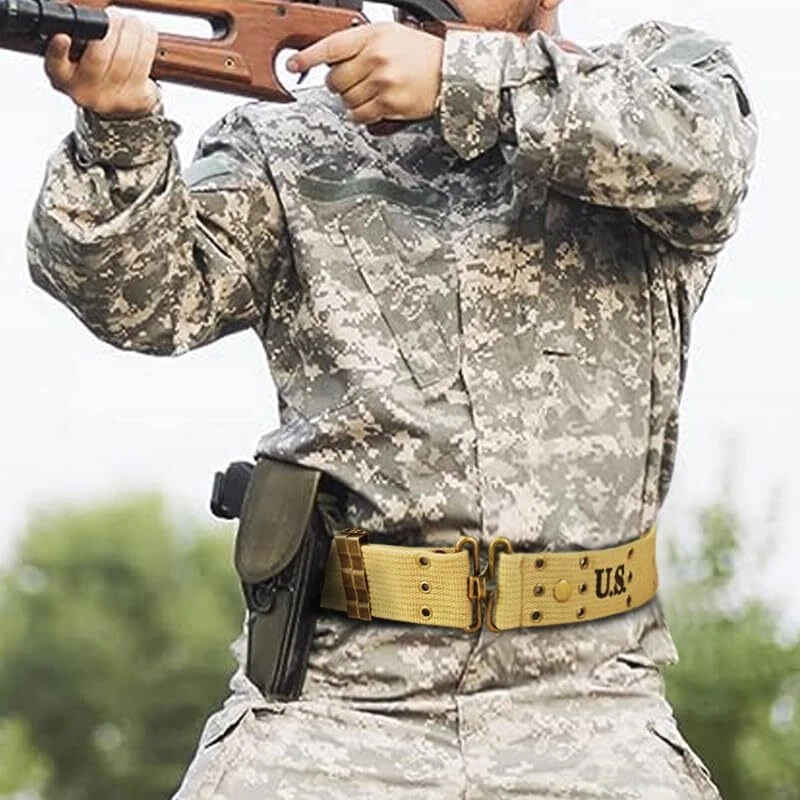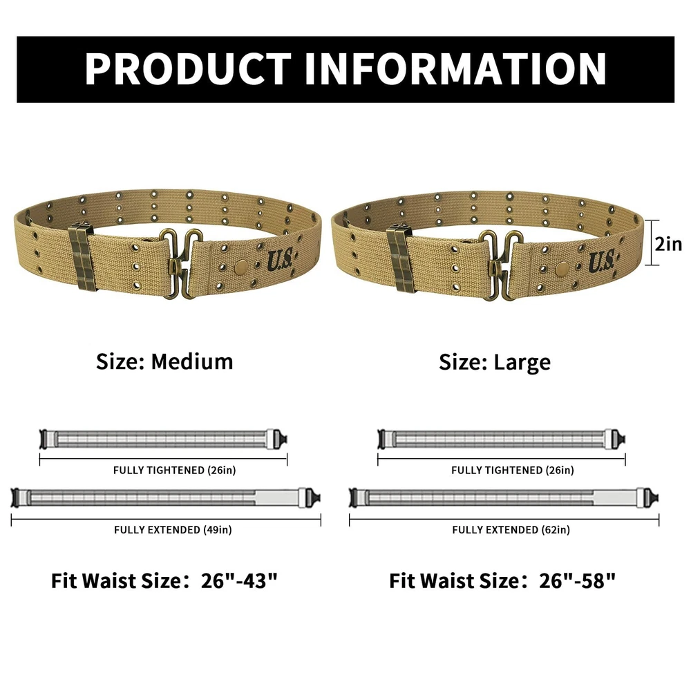 Expertly handcrafted replica. Regular Adjustable Waist length is from 26"to 43" (66 to 109cm), Full Lengh: 49 inch, Width:2 inches American M1936 pistol belt. This was the standard pistol belt used in WW2 by the US Army With three rows of eyelet's. The top row is to attach M36 suspenders, the middle row allows the belt to be adjusted in size (the belt hook clips into these) and the bottom row allows pistol holsters and first aid pouches etc. to be attached If you interested for other WW2 US webbing gear, you can search SMONT WW2 US. Any problem please connect us, we will try our best to solve your problem Metal belt clip, anti-slip holes, duty webbing belt. 60 hanging holes can suspend various equipment