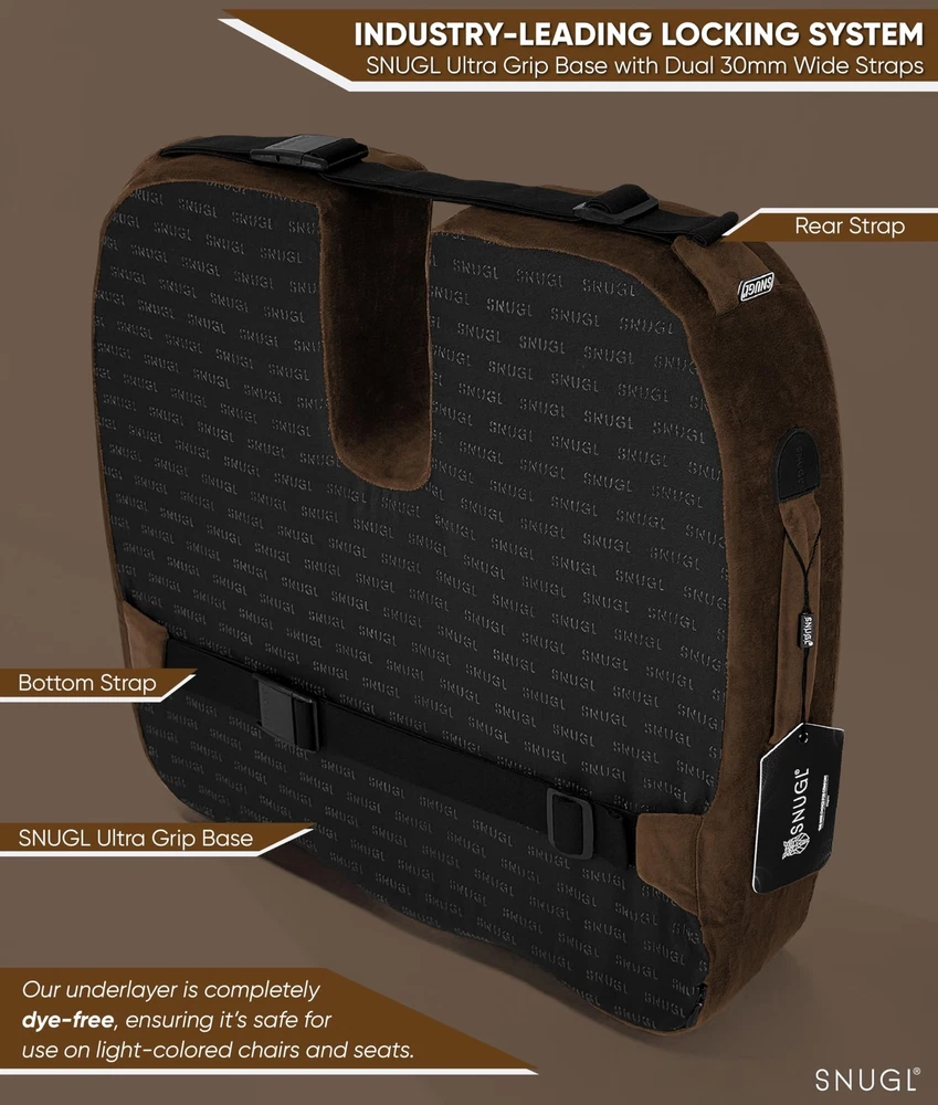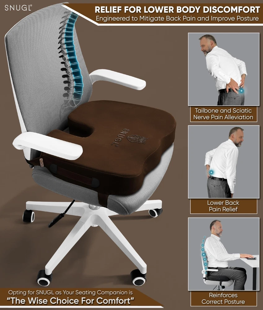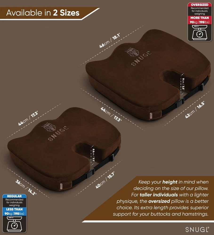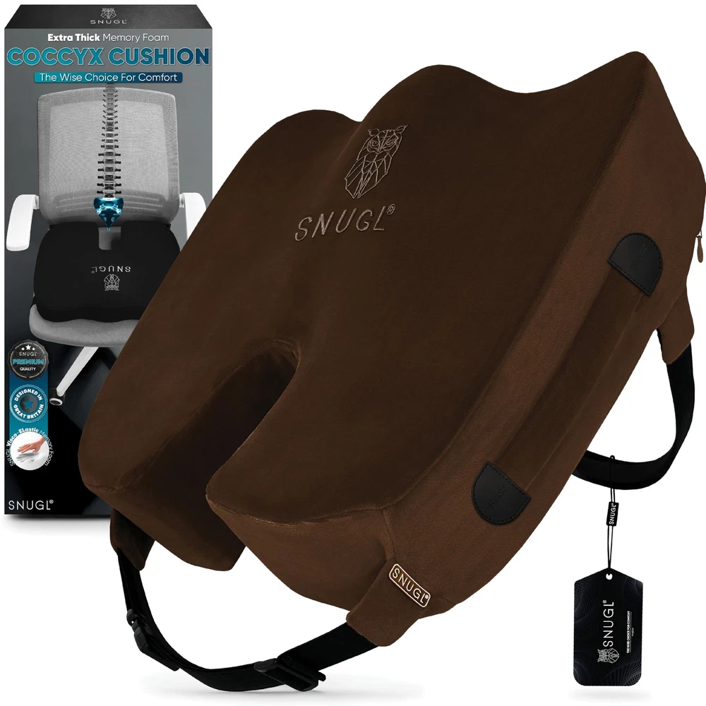 SNUGL Coccyx Cushion | Thick Memory Foam Seat Cushion for Office, Car, Wheelchair & Gaming Chair | Orthopedic Support Pillow for Tailbone, Sciatica, Back & Hip Pain Relief (Brown, Oversized) Product Details Brand: SNUGL Special Feature: Dual Adjustable Straps, Non-Slip Underlayer, Side Handle, Increased Thickness Memory Foam, Soft Hypoallergenic Outer Cover See more Color: Brown Size: Oversized Fill Material: Memory Foam Brand: SNUGL Special Feature: Dual Adjustable Straps, Non-Slip Underlayer, Side Handle, Increased Thickness Memory Foam, Soft Hypoallergenic Outer Cover Color: Brown Size: Oversized Fill Material: Memory Foam Shape: Semicircular Age Range (Description): Adult Recommended Uses For Product: Maternity, Sitting, Medical, Studying, Traveling, Recovery Use for: Buttocks Material: Polyester Item Firmness Description: Medium Number of Pieces: 1 Pattern: Solid Material Feature: Hypoallergenic Variety: Memory Foam,Seat Cushion Material Type Free: Latex Free Fabric Type: 20% Cotton, 80% Polyester Model Name: SNUGL Comfort+ Memory Foam Coccyx Cushion UPC: 615666226048 Manufacturer: SNUGL Product Dimensions: 17.3"L x 13.8"W Unit Count: 1 Count Item Weight: 2.86 pounds Country of Origin: China Item model number: SNU-COCCYX-V03 Date First Available: June 17, 2021 THE WISE CHOICE FOR COMFORT - At SNUGL, we prioritize lasting comfort, support, and pain relief. Transform any chair into a luxury seat with our ergonomic coccyx cushion, ideal for long sitting at home, in the office, or while driving. Perfect as a lumbar support pillow for office chairs, car seats, or gaming chairs. THICKER MEMORY FOAM FOR SUPERIOR SUPPORT - Our cushion is 20% thicker than standard seat cushions, featuring premium Visco-Elastic memory foam for enhanced comfort and pressure relief. Enjoy cloud-like softness that supports your lower back, hips, and tailbone, making it perfect for sciatica and coccyx pain relief. ERGONOMIC U-SHAPE DESIGN - Designed to promote healthy posture and improve circulation, our orthopedic cushion alleviates pain from sciatica, lower back pain, and post-surgery recovery. Its the perfect chair pad for office workers, truck drivers, wheelchair users, and anyone needing added comfort during long hours of sitting. DURABLE, NON-SLIP, & PORTABLE - Built to last, our cushion maintains its shape with daily use, thanks to high-quality, slow-rebounding memory foam. The non-slip silicone base and dual adjustable straps ensure it stays in place on any chair or seat. Includes a side handle for easy portability, making it great for travel. HYPOALLERGENIC & EASY TO CLEAN - The soft velour cover is hypoallergenic, breathable, and machine washable, with a hidden zipper for easy removal. Available in multiple colors, it fits seamlessly into any decor, whether youre using it at home, in the office, or on the road. Ideal for those seeking comfort and pain relief with style.
