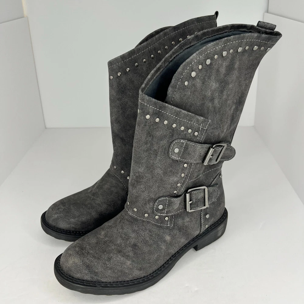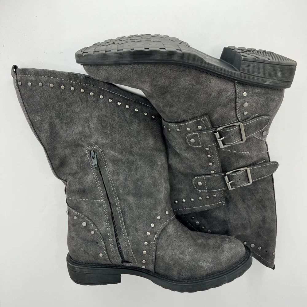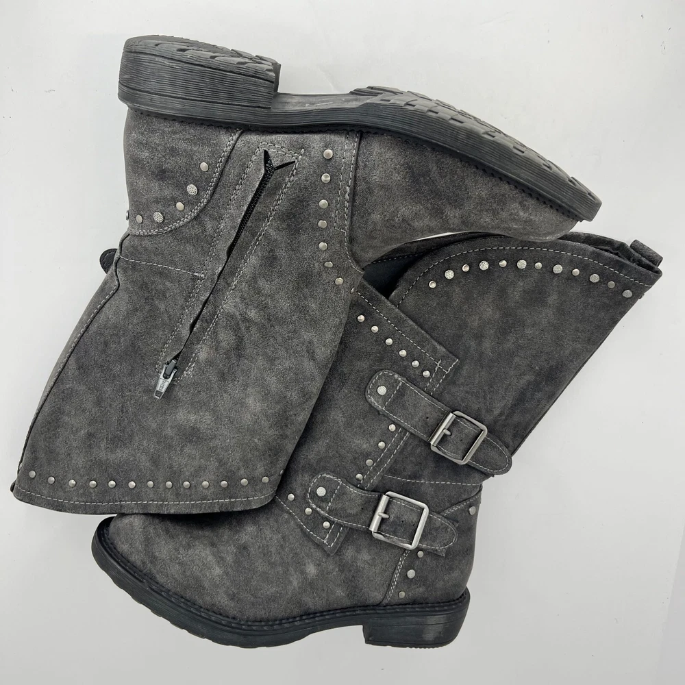 Elevate your style with these chic SO Women's Boots in a beautiful gray color. These boots are perfect for any season and feature a slip-on closure with leather straps for ease of wear. The boots have a low block heel, making them comfortable for all-day wear. The boots are crafted from high-quality synthetic material. They come in a mid-size 7.5 and have a round toe shape. The outsole is also made of rubber, making it slip-resistant and durable. These boots are accented with studs, giving them a touch of edginess. They are perfect for any casual or formal occasion. 100% CUSTOMER SATISFACTION IS OUR GOAL! Our items are always carefully examined for condition, measured if necessary, and photographed in a climate controlled and smoke-free environment. We make every attempt to accurately describe and clearly picture the items we have for sale. Please, ALWAYS view all of the photos. We value your business and our goal is your complete satisfaction. FAST SHIPPING All items are packaged with care and shipped out the same or next business day via USPS, FEDEX, or UPS with tracking numbers so you are always informed. RETURNS We offer a 30-day return policy. All items must be unused and unopened in the condition in which they were received, with original packaging, and all accessories included for return. REVIEWS - CUSTOMER SATISFACTION - COMMUNICATION We aim to make you happy. After you receive your shipment, please leave a positive review . If you have concerns or questions about your order, please contact us so we can resolve the issue. We will do our best to make you satisfied. THANK YOU FOR YOUR BUSINESS!