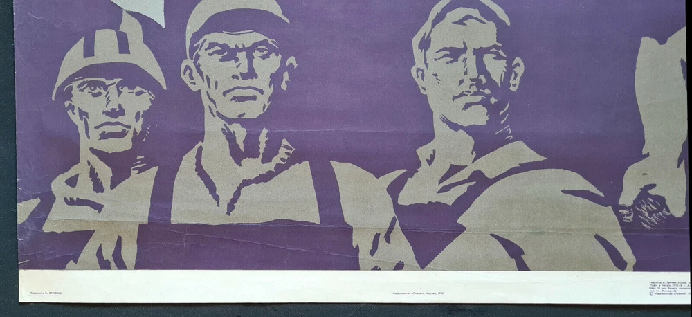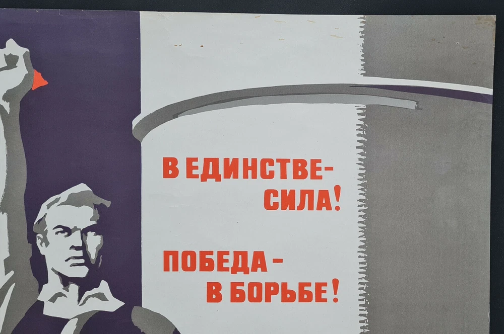 Original slogan on the poster: В ЕДИНСТВЕ - СИЛА! ПОБЕДА - В БОРЬБЕ! Literally English translation: IN THE UNITY IS POWER! THE VICTORY IS IN THE STRUGGLE! POSTER ARTIST: BRISKIN VENIAMIN MARKOVICH PRINT YEAR: 1976 SUBJECT: SOCIALISM, INTERNATIONALISM LANGUAGE: RUSSIAN PRINT RUN: 35.000 PUBLISHED BY: "PLAKAT", MOSCOW SIZE: IN: 25 ½ x 38 ⅝ = CM: 65 x 98 CONDITION: ROLLED, FAIR The poster has tears creases, folds, partially repaired by tape on the reverse, after further professional restoration will look incredible alive. The artwork is designed by highly famous Soviet poster artist Briskin Veniamin Markovich, it was issued in a limited editions. www.facebook.com/sovietartposters Listing and template services provided by inkFrog