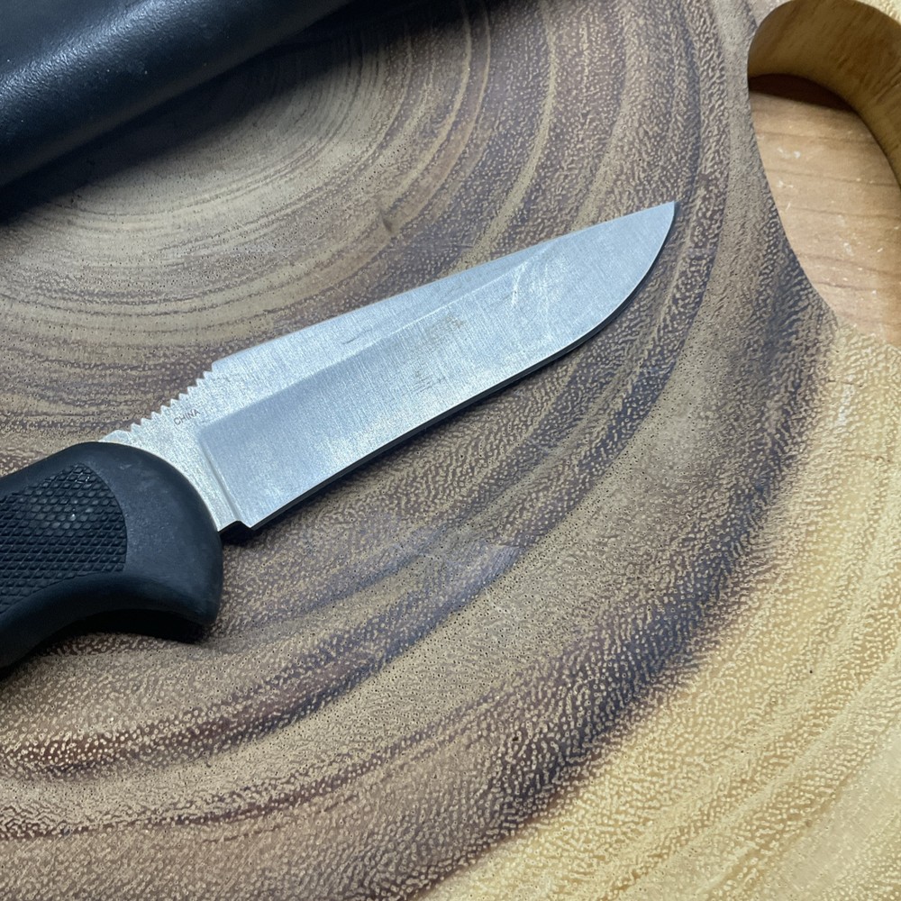 The SOG Field Pup I Fixed Blade Knife is a hunting knife with a 4" AUS-8 stainless steel blade that has a drop point and a plain edge. It features a full tang construction for durability and ambidextrous use, making it suitable for various users. The handle is made of Kraton-Black material for a comfortable grip, and it includes a lanyard hole and sheath for convenient carrying. This original 2003 model from SOG is a reliable and practical tool for outdoor activities.