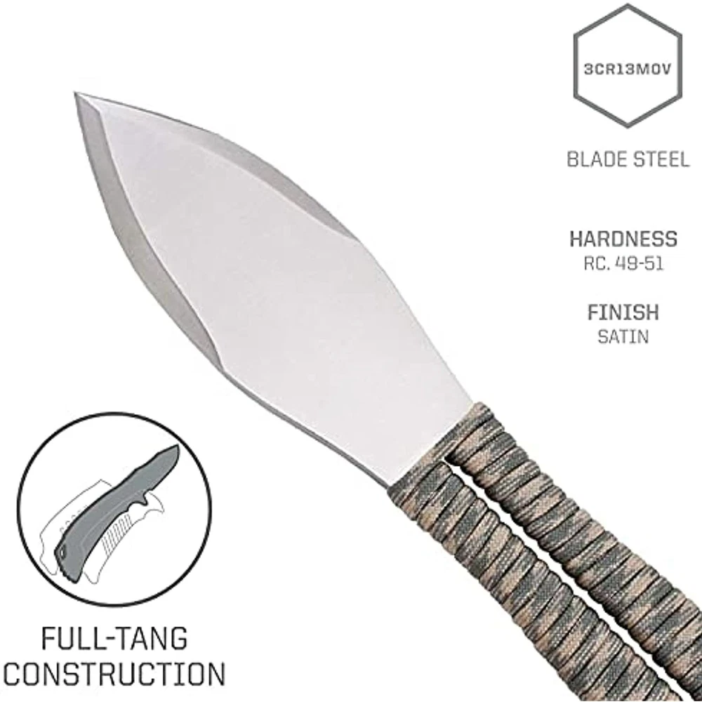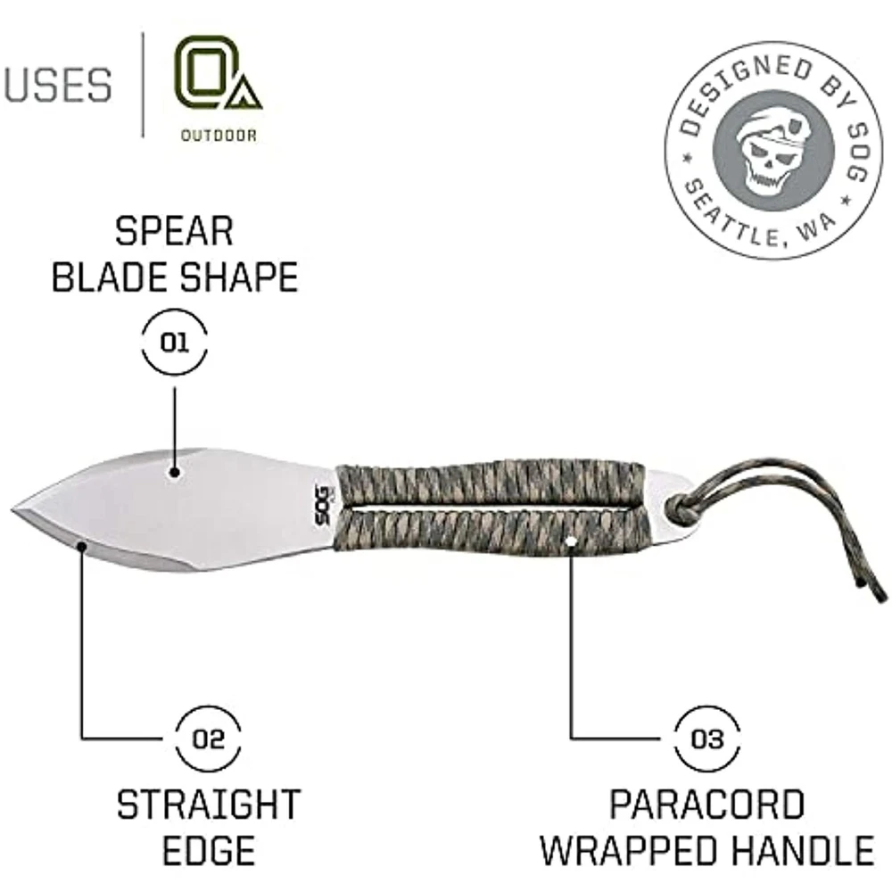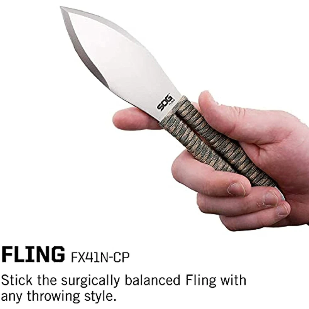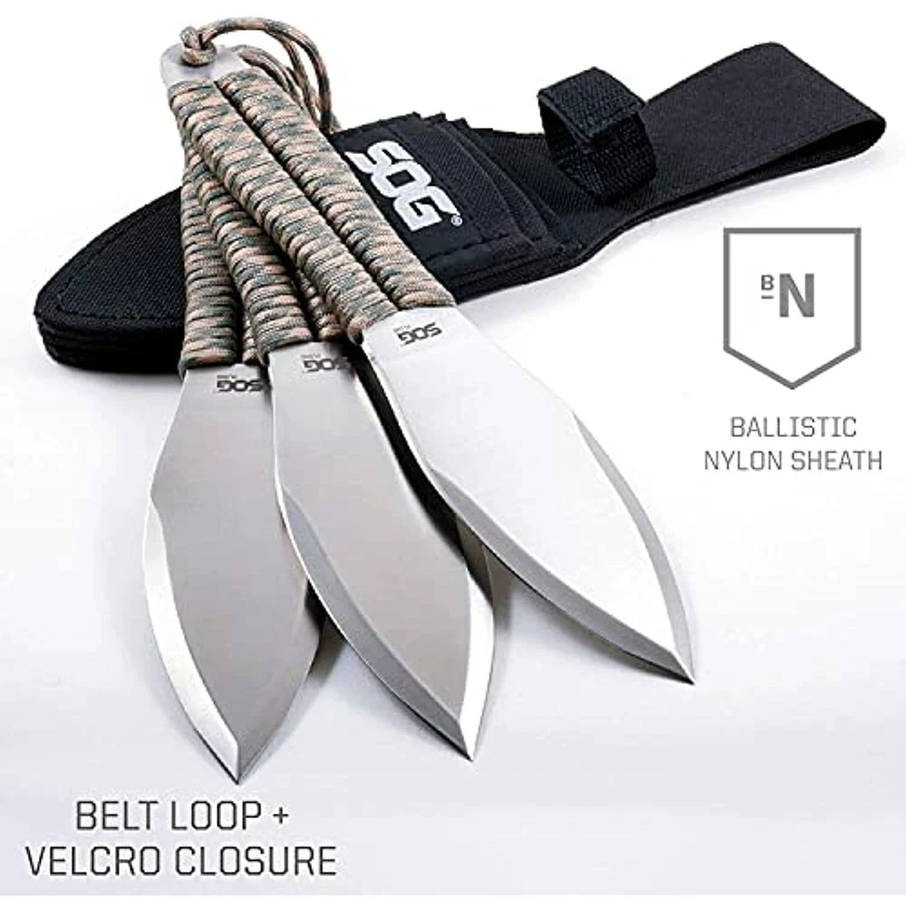 SOG Fling Throwing Knives- 3 Pack Balanced Throwing Knife Set with 2.8 Inch Steel Blades and 7 Feet Paracord Wrapped Handles- Black (FX41N-CP) SOG Fling Classic Throwing Knives Set with Sheath - 3pk Features 3-PACK THROWING BLADES KIT: Perfect practice throwing knives for those who throw often and hard; use as professional throwing knives and get even more value per throw than pricier knife sets. 9.5 INCH FULL-TANG STAINLESS STEEL KNIVES FOR THROWING: More durable than generic throwing weapons and martial arts knives; each knife is crafted heel to butt in stainless steel with 7-foot paracord handle. TACTICAL THROWING KNIFE CONSTRUCTION: Well-crafted for many professional target throwing styles; no spin, combative rotation, recreational freestyle and more. MULTI NYLON SHEATH THROWING KNIVES CARRY: Ballistic competition throwing knives sheath; secure all 3 knives with the Velcro strap and attach via belt loop. SOG KNIVES FOR LIFE: Take care of your throwing knives and we’ll take care of you; we gladly consider repairs and replacements for properly maintained SOG gear. Fast and Free Shipping You're already purchasing the item. Why pay additional for shipping, especially slow shipping? We get your order shipped out within 1-business day and delivered to your doorstep as quickly as possible. Competitive Pricing With our dynamic pricing model, our prices are always competitive. Our prices are some of the lowest that you will find on the internet. Rest assured that you're getting a good deal when purchasing with us. 30-day Money Back Guarantee We are committed to making sure that you leave this transaction satisfied. If you're unhappy with the product for any reason, you may return it back for your money-back or a replacement within 30 days. No questions asked!