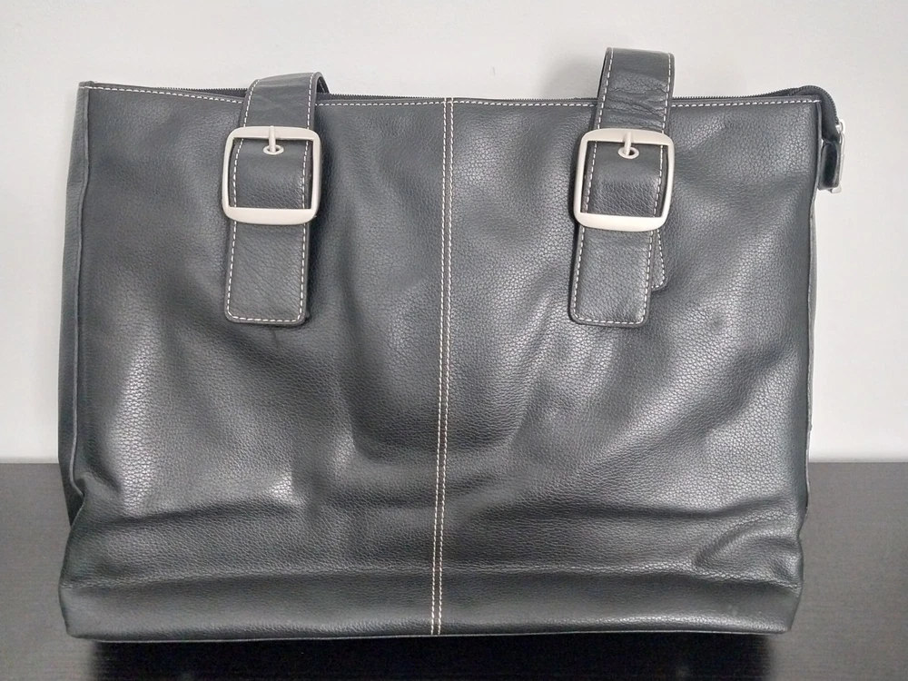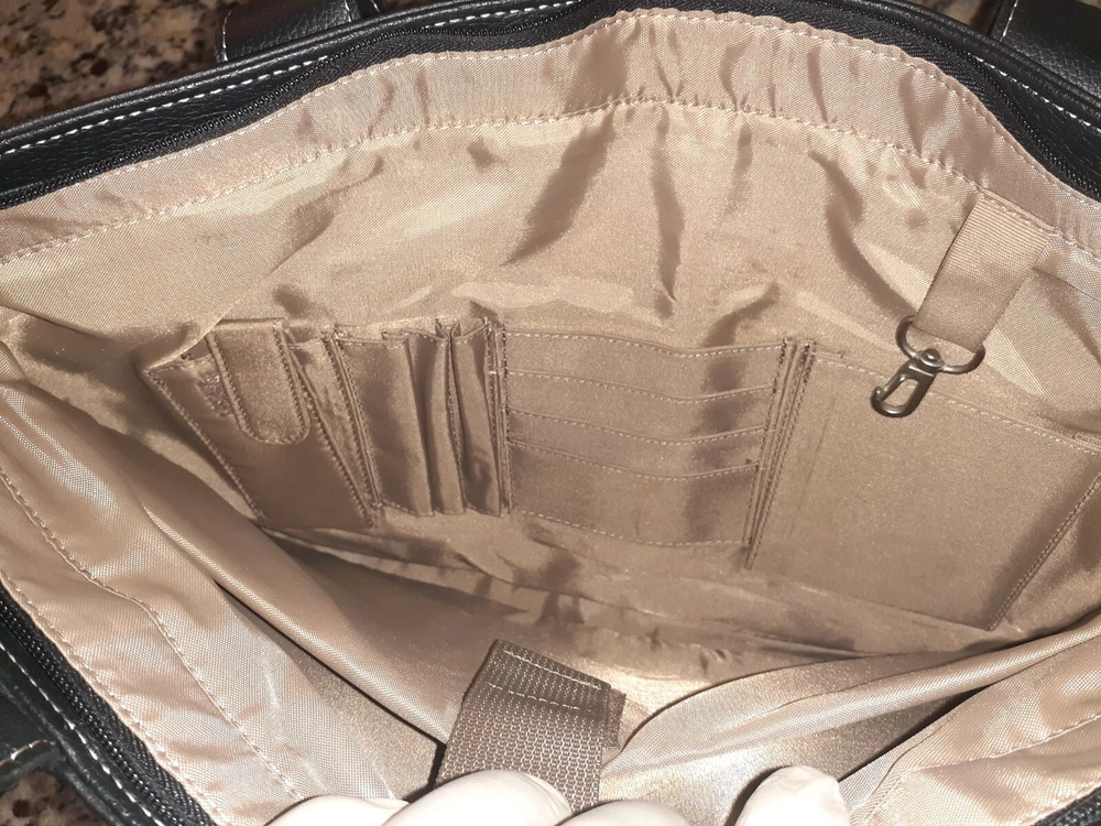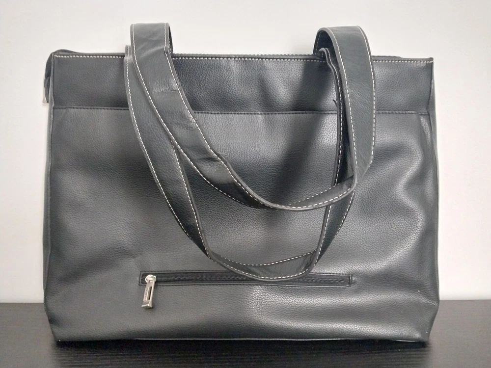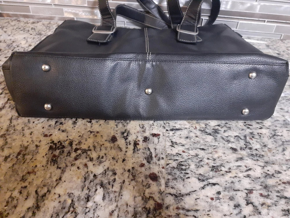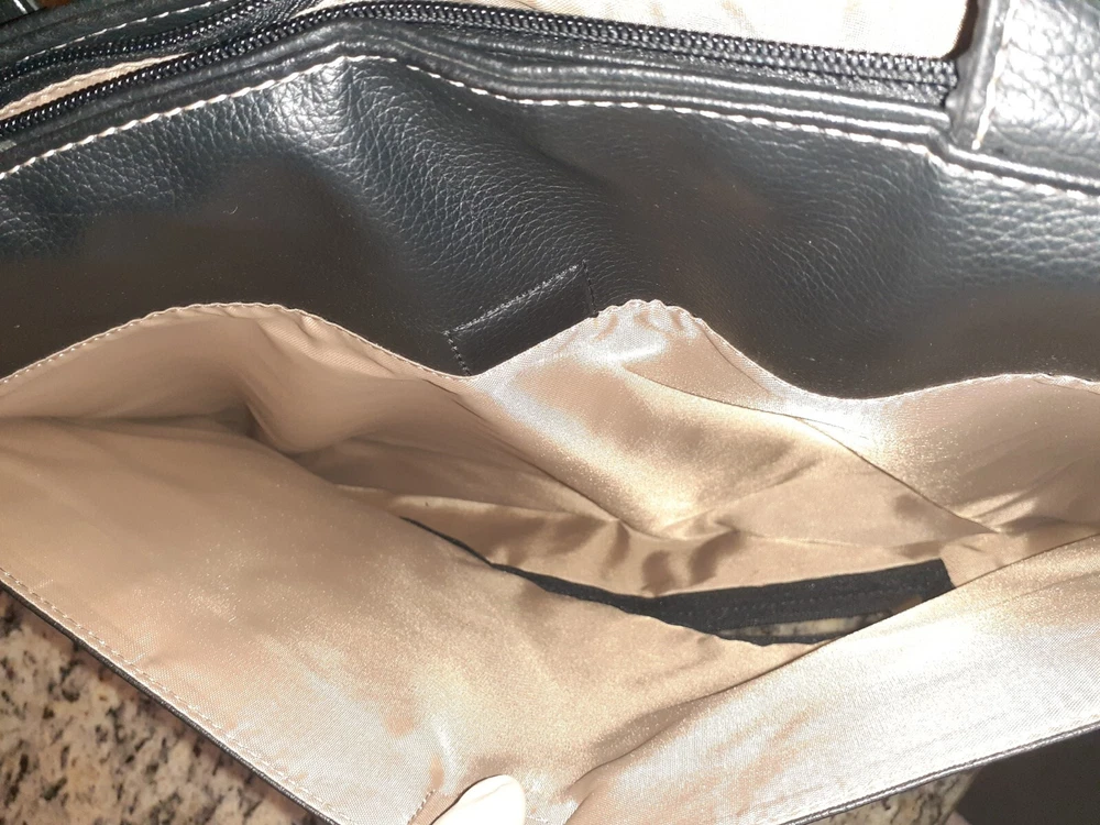 Bag Width: 17 in Country/Region of Manufacture: China Model: Not Applicable Lining Color: Beige Shape: Rectangle Occasion: Business, Travel, Workwear Accents: Inside Key Holder Product Line: Not Applicable Size: Large Character: Not Applicable Hardware Material: Aluminum Fabric Type: Rayon Pattern: Solid Finish: Matte Features: Inside Pocket, Inside Key Holder Personalize: No Bag Depth: 5 in Seller Notes: “Hand bag is Great condition as seen in photos. Please note tote bag may be folded for shipping.” Vintage: Yes Character Family: Not Applicable Theme: Fashion, 90s Brand: Solo Exterior Color: Black Bag Height: 13 in Style: Shoulder Bag Hardware Color: Silver Closure: Zip Personalization Instructions: Not Applicable Lining Material: Fabric MPN: Does Not Apply Exterior Material: Faux Leather Handle/Strap Material: Faux Leather Department: Women Handle Style: Double Handles Accessories: Key Holder Handmade: No Handle/Strap Color: Black